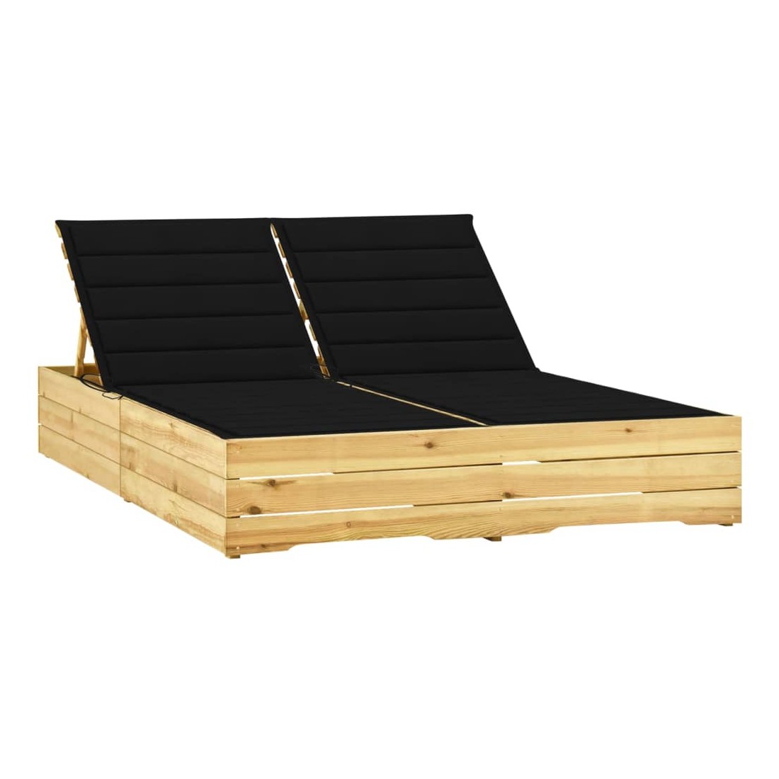 Cette chaise longue double en bois avec coussin combine style et fonctionnalité et ajoute une touche de charme rustique à votre espace de vie extérieur. Fabriqué en bois de pin imprégné, le transat pour 2 personnes est résistant aux intempéries, très durable et facile à nettoyer avec un chiffon humide. Le dossier est réglable afin que vous puissiez trouver la position la plus confortable. De plus, le coussin inclus est plus qu’un supplément pratique ; il a également une fonction décorative. Remarque : afin de prolonger la durée de vie des meubles d'extérieur, nous vous recommandons de les protéger avec une housse imperméable.