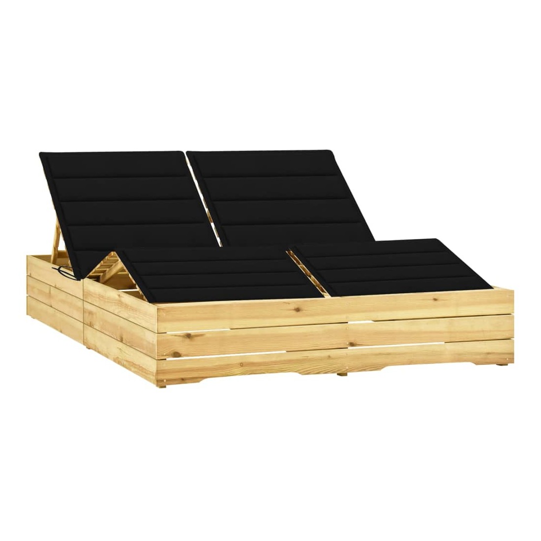 Cette chaise longue double en bois avec coussin combine style et fonctionnalité et ajoute une touche de charme rustique à votre espace de vie extérieur. Fabriqué en bois de pin imprégné, le transat pour 2 personnes est résistant aux intempéries, très durable et facile à nettoyer avec un chiffon humide. Le dossier et le repose-pied sont réglables afin que vous puissiez trouver la position la plus confortable. De plus, le coussin inclus est plus qu’un supplément pratique ; il a également une fonction décorative. Remarque : afin de prolonger la durée de vie des meubles d'extérieur, nous vous recommandons de les protéger avec une housse imperméable.
