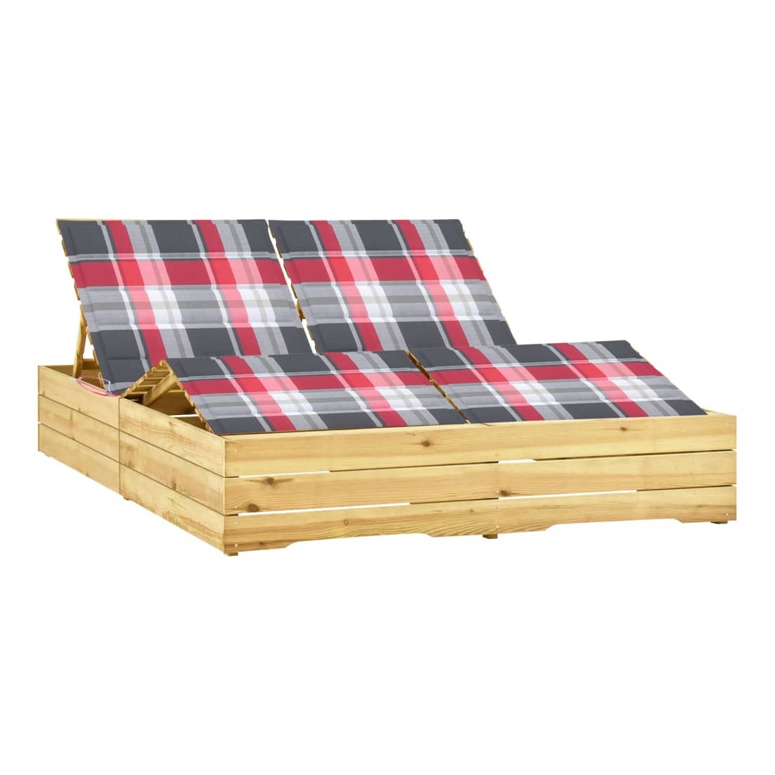 Cette chaise longue double en bois avec coussin combine style et fonctionnalité et ajoute une touche de charme rustique à votre espace de vie extérieur. Fabriqué en bois de pin imprégné, le transat pour 2 personnes est résistant aux intempéries, très durable et facile à nettoyer avec un chiffon humide. Le dossier et le repose-pied sont réglables afin que vous puissiez trouver la position la plus confortable. De plus, le coussin inclus est plus qu’un supplément pratique ; il a également une fonction décorative. Remarque : afin de prolonger la durée de vie des meubles d'extérieur, nous vous recommandons de les protéger avec une housse imperméable.