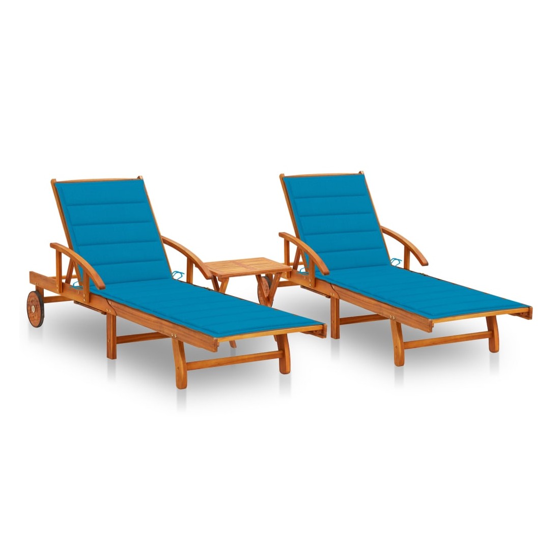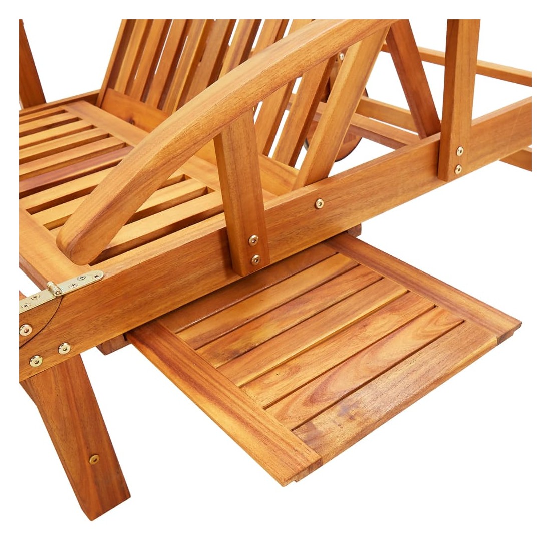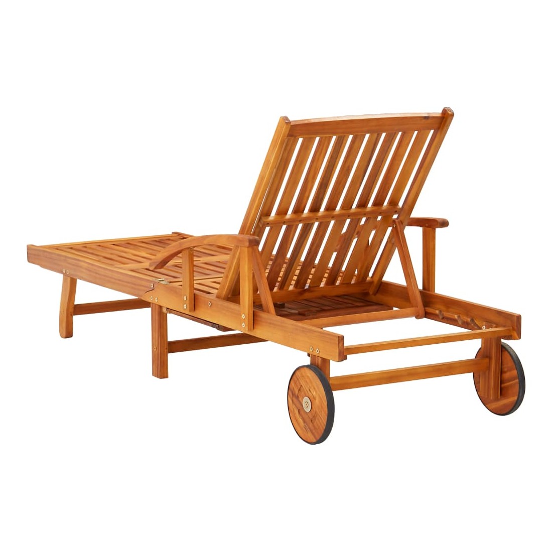 Cet ensemble de chaises longues en bois avec table, combine style et fonctionnalité et ajoutera une touche de charme rustique à votre jardin, patio, terrasse de piscine ou autre espace de vie extérieur. Construite en bois d’acacia massif, la chaise longue est résistante aux intempéries, durable et convient à un usage extérieur. Équipée de roues, elle peut être facilement déplacée. Le dossier et le repose-pied sont réglables de la position complètement verticale à la position complètement à plat, ce qui vous offre le plus grand confort. Le lit de jour et la table peuvent être repliés lorsqu'ils ne sont pas utilisés. Le coussin inclus est plus qu’un supplément pratique; il a également une fonction décorative. Remarque : afin de prolonger la durée de vie des meubles d'extérieur, nous vous recommandons de les protéger avec une housse imperméable.