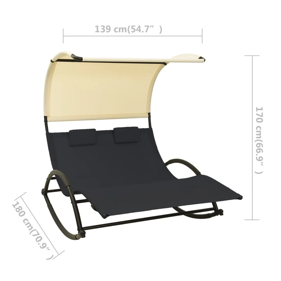 Que vous souhaitiez vous détendre seul ou en couple, cette chaise longue double est un excellent choix, idéale pour l’extérieur. Ce transat à bascule dispose d’un cadre en acier robuste, qui apporte une super stabilité et assure une longue durée de vie de service. Le lit de repos est conçu avec un tissu textilène fort et respirant, offrant le confort suprême pendant votre temps de détente. Les deux petits oreillers inclus ajoutent un confort supplémentaire. De plus, l'auvent vous protège contre les rayons UV nocifs. Remarque : afin de prolonger la durée de vie des meubles d'extérieur, nous vous recommandons de les protéger avec une housse imperméable.