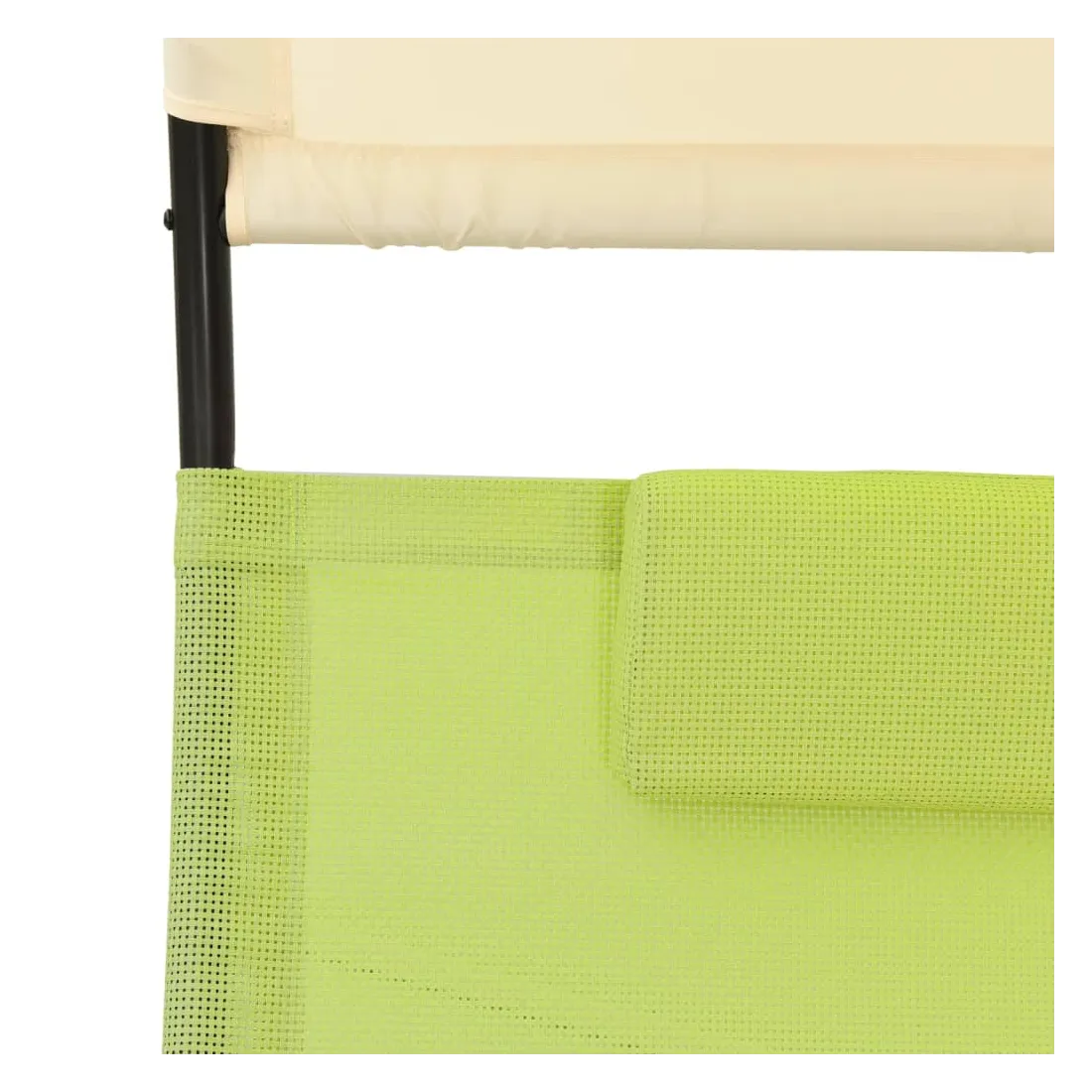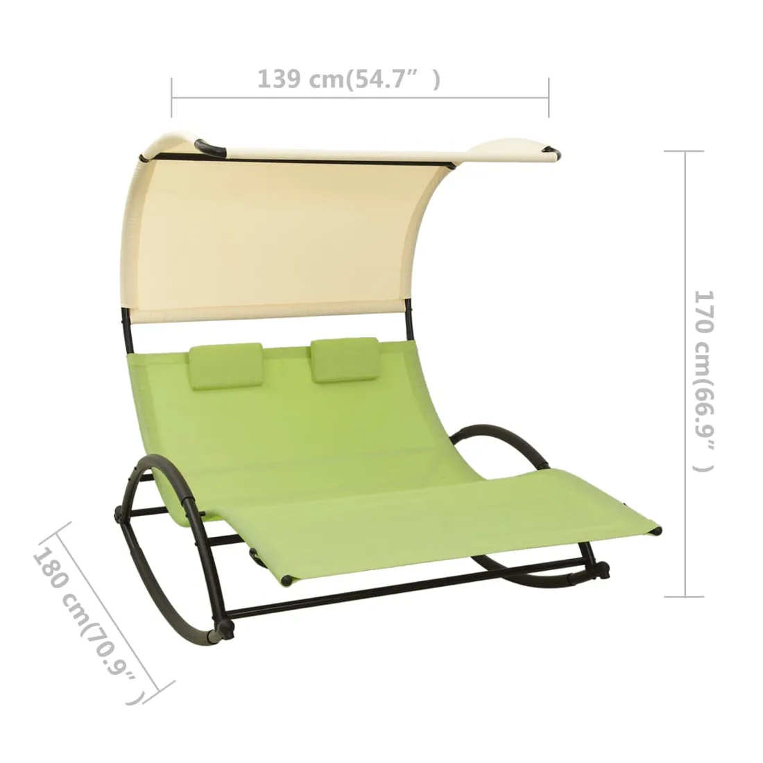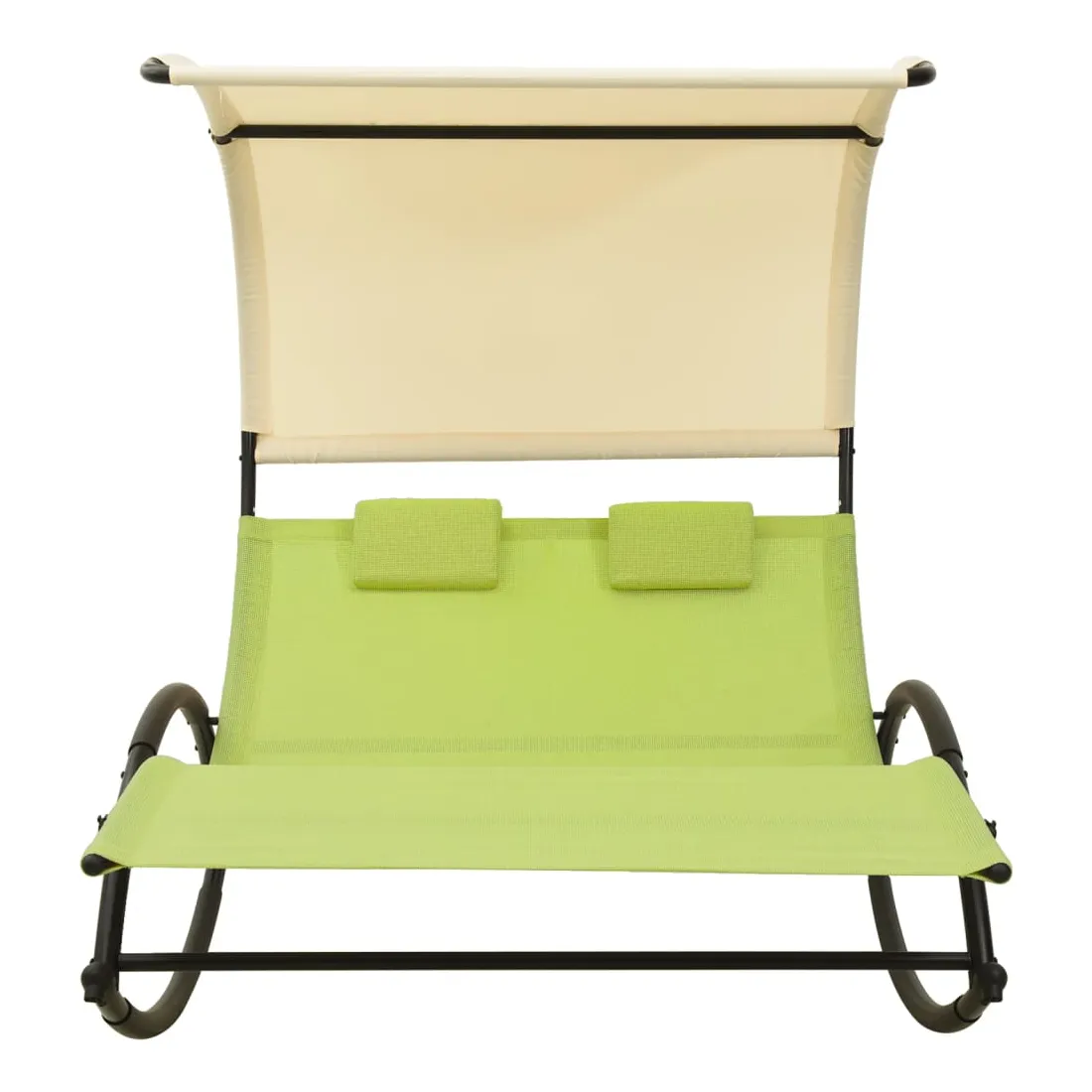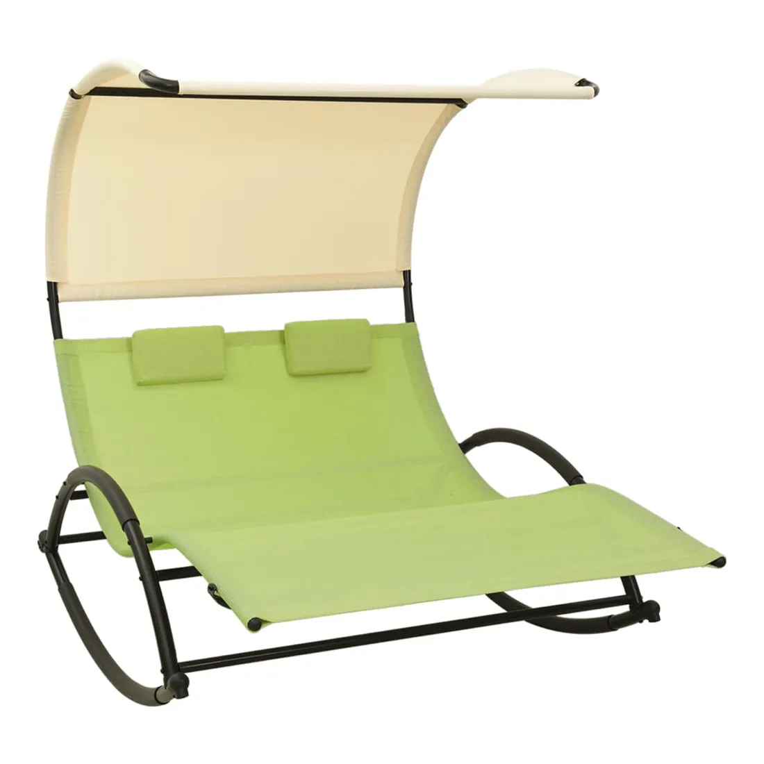 Que vous souhaitiez vous détendre seul ou en couple, cette chaise longue double est un excellent choix, idéale pour l’extérieur. Ce transat à bascule dispose d’un cadre en acier robuste, qui apporte une super stabilité et assure une longue durée de vie de service. Le lit de repos est conçu avec un tissu textilène fort et respirant, offrant le confort suprême pendant votre temps de détente. Les deux petits oreillers inclus ajoutent un confort supplémentaire. De plus, l'auvent vous protège contre les rayons UV nocifs. Remarque : afin de prolonger la durée de vie des meubles d'extérieur, nous vous recommandons de les protéger avec une housse imperméable.