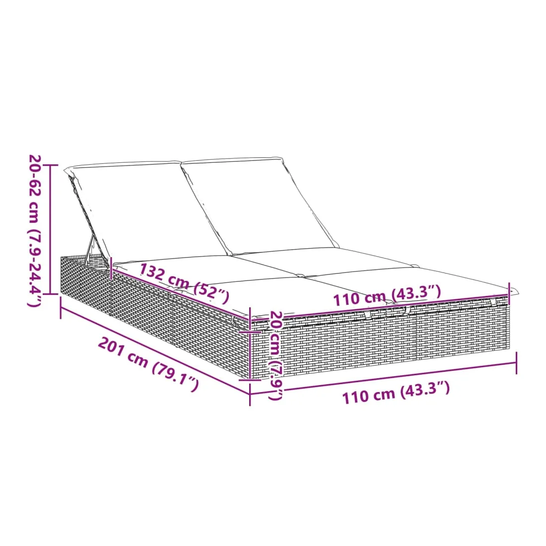 - Dimensions : 201 x 110 x 20/23/36/50/62 cm (l x P x H)