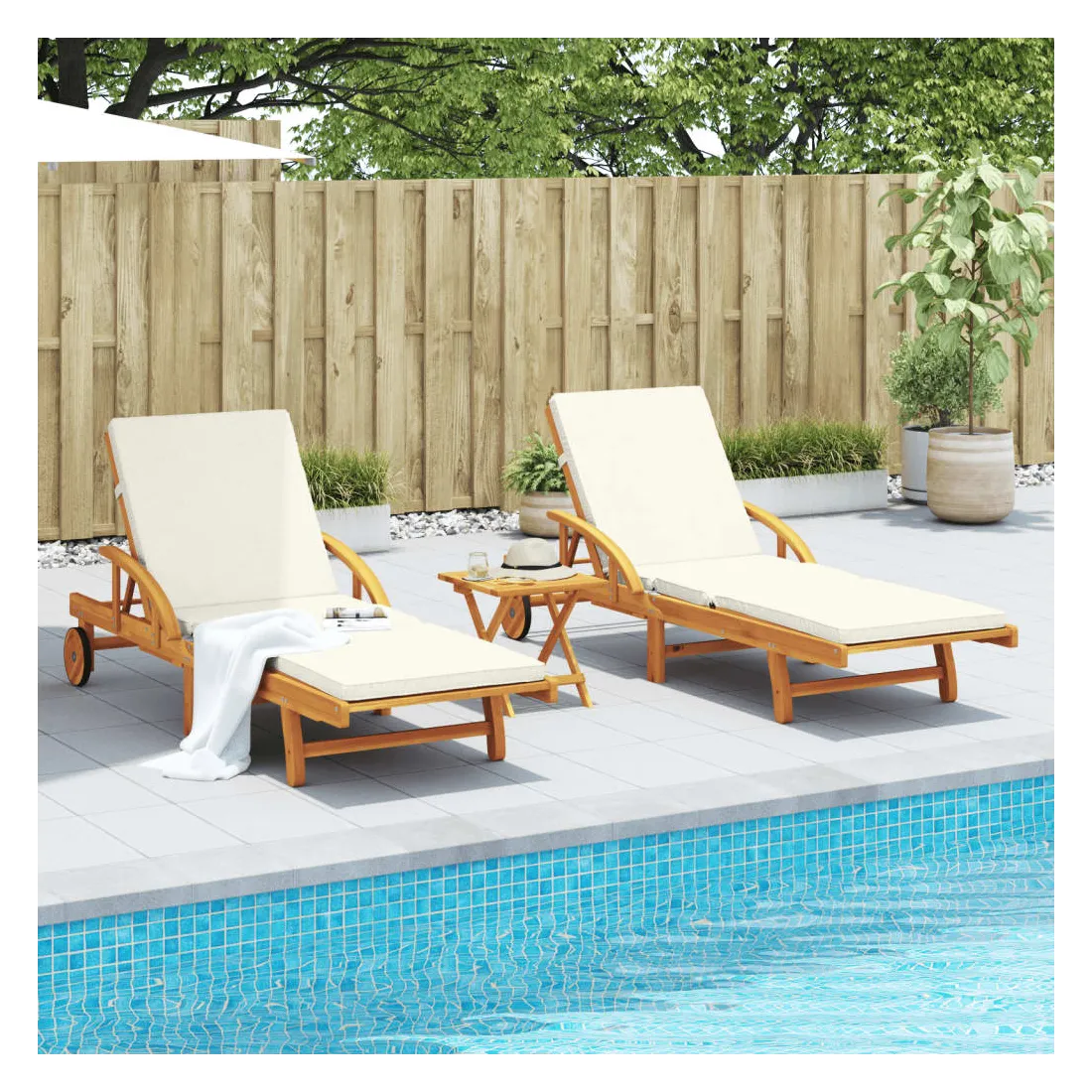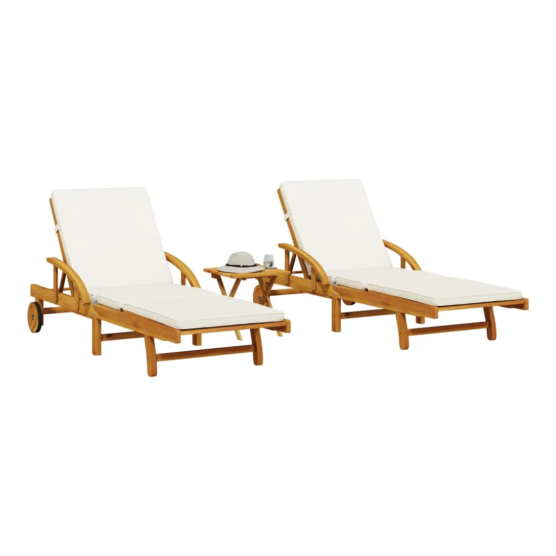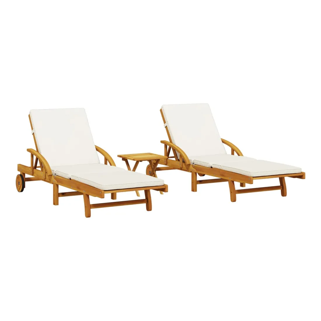 Détendez-vous et profitez du plein air avec ces chaises longues confortables ! Robuste et stable : le bois d'acacia massif est connu pour sa solidité et sa durabilité. Ses couleurs variées et ses grains uniques lui confèrent un aspect attrayant. Sa stabilité et sa résistance aux intempéries en font un matériau idéal pour la fabrication de meubles d'intérieur et d'extérieur.Fonction d'inclinaison manuelle : ce fauteuil inclinable est spécialement conçu avec 5 positions d'inclinaison afin que vous puissiez régler manuellement le dossier et le repose-pieds selon votre confort.Expérience d'assise confortable : ce mobilier d'extérieur, doté de coussins épais, offre une expérience d'assise confortable.Table coulissante pratique : ce mobilier d'extérieur est doté d'une table coulissante pratique, qui permet de ranger vos objets essentiels à portée de main.Bien ventilé et prévention de l'accumulation d'eau : la conception à lattes favorise une circulation optimale de l'air et empêche efficacement l'accumulation d'eau, assurant ainsi une assise sèche et confortable.Housse amovible et lavable : ces coussins de siège sont dotés de housses amovibles pour un lavage et un entretien faciles.Design pliable : la table peut être facilement pliée lorsqu'elle n'est pas utilisée pour faciliter le rangement et le transport.Déplacement facile : vous pouvez déplacer la chaise longue d'extérieur facilement, grâce à son design léger et à ses roulettes. Bon à savoir :Pour que vos meubles d'extérieur restent beaux, nous vous recommandons de les protéger avec une housse imperméable.
