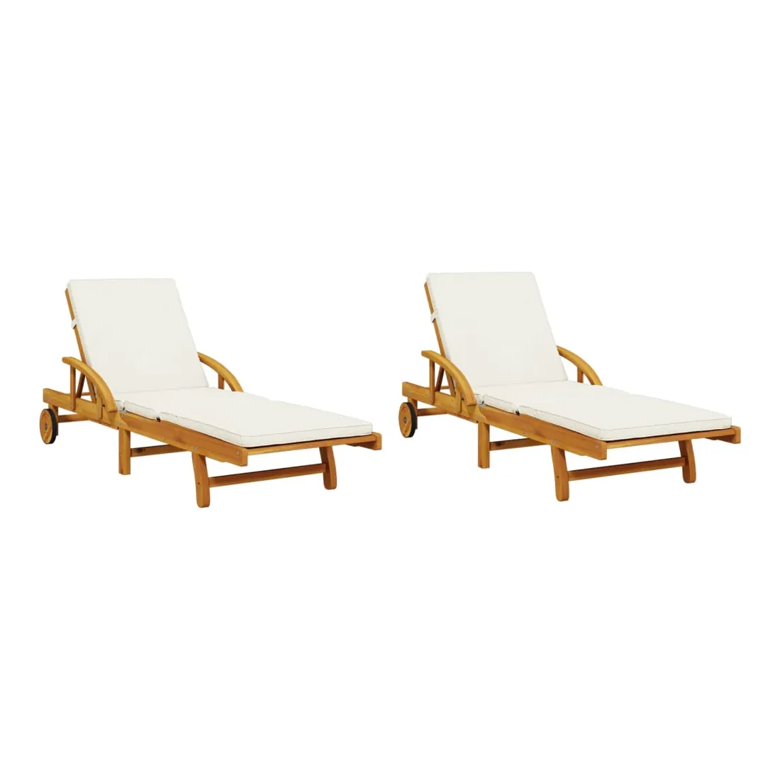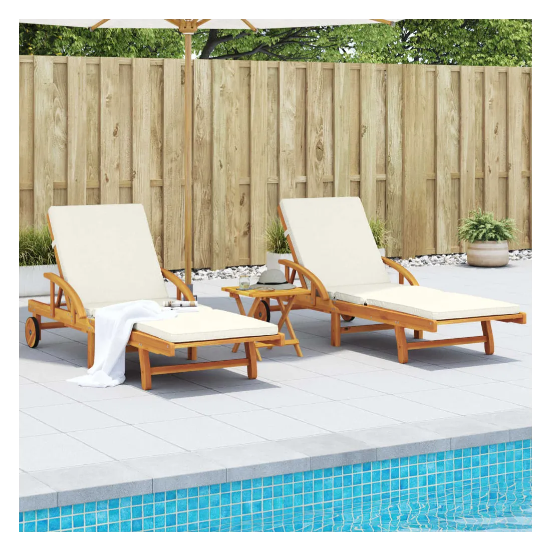 Détendez-vous et profitez du plein air avec ces chaises longues confortables ! Robuste et stable : le bois d'acacia massif est connu pour sa solidité et sa durabilité. Ses couleurs variées et ses grains uniques lui confèrent un aspect attrayant. Sa stabilité et sa résistance aux intempéries en font un matériau idéal pour la fabrication de meubles d'intérieur et d'extérieur.Fonction d'inclinaison manuelle : ce fauteuil inclinable est spécialement conçu avec 5 positions d'inclinaison afin que vous puissiez régler manuellement le dossier et le repose-pieds selon votre confort.Expérience d'assise confortable : ce mobilier d'extérieur, doté de coussins épais, offre une expérience d'assise confortable.Bien ventilé et prévention de l'accumulation d'eau : la conception à lattes favorise une circulation optimale de l'air et empêche efficacement l'accumulation d'eau, assurant ainsi une assise sèche et confortable.Housse amovible et lavable : ces coussins de siège sont dotés de housses amovibles pour un lavage et un entretien faciles.Déplacement facile : vous pouvez déplacer la chaise longue d'extérieur facilement, grâce à son design léger et à ses roulettes. Bon à savoir :Pour que vos meubles d'extérieur restent beaux, nous vous recommandons de les protéger avec une housse imperméable.
