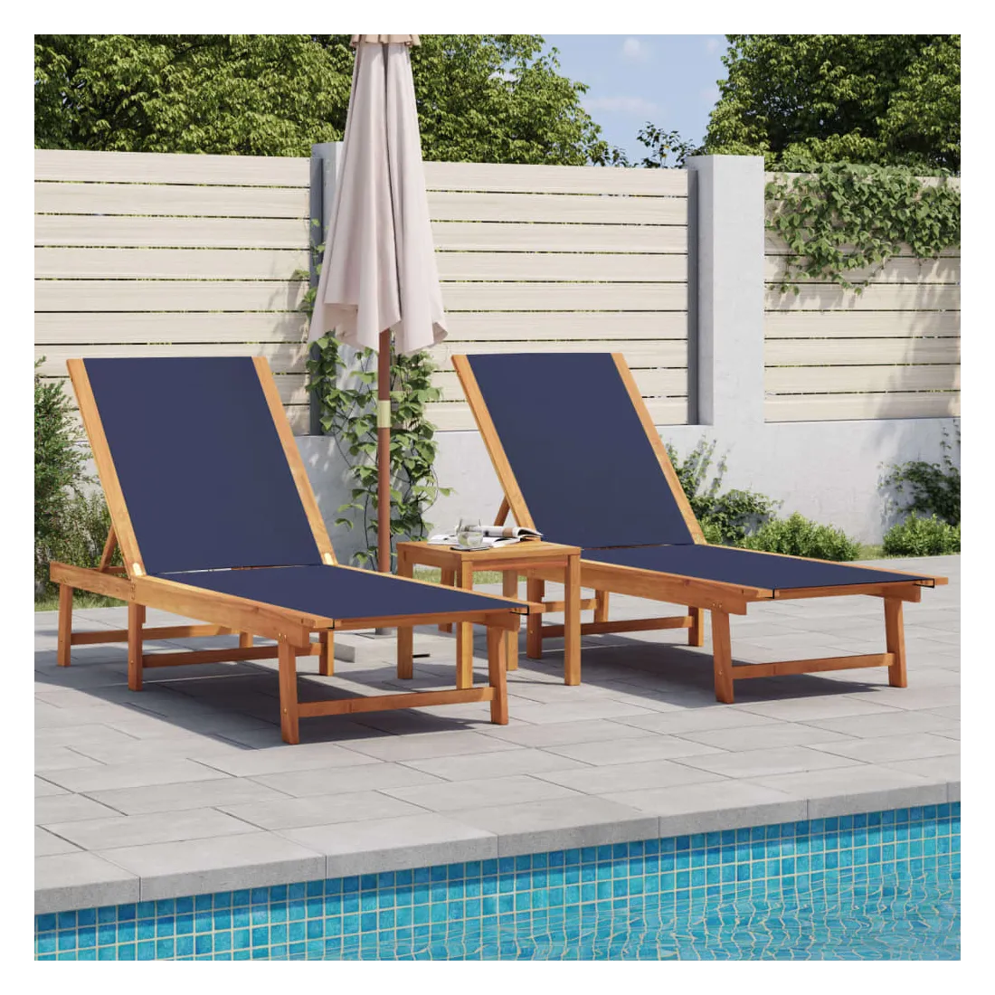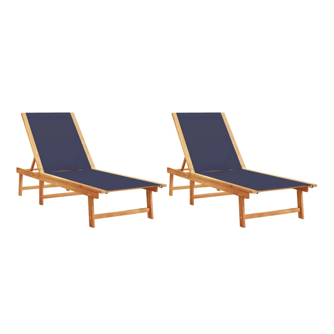 Ces chaises longues classiques sont idéales pour prendre un bain de soleil et vous détendre près de la piscine, sur la terrasse ou dans le jardin. Robuste et stable : le bois d'acacia massif est connu pour sa solidité et sa durabilité. Ses couleurs variées et ses grains uniques lui confèrent un aspect attrayant. Sa stabilité et sa résistance aux intempéries en font un matériau idéal pour la fabrication de meubles d'intérieur et d'extérieur.Durable et longue durée de vie : le tissu textilène est apprécié pour sa durabilité, résistance à l'eau et à la décoloration, facilité d'entretien et protection contre les rayons UV et la moisissure, ce qui en fait un choix idéal pour le meuble d'extérieur et les structures d'ombrage.Dossier réglables : ce transat est doté d'un dossier à 5 positions réglables, ce qui vous permet de trouver facilement la position la plus confortable et la plus appropriée pour la détente.Nombreuses applications : la chaise longue d'extérieur, au design simple et intemporel, convient aux bords de piscine, aux balcons, aux jardins, aux patios, etc. Bon à savoir :Pour que vos meubles d'extérieur restent beaux, nous vous recommandons de les protéger avec une housse imperméable.