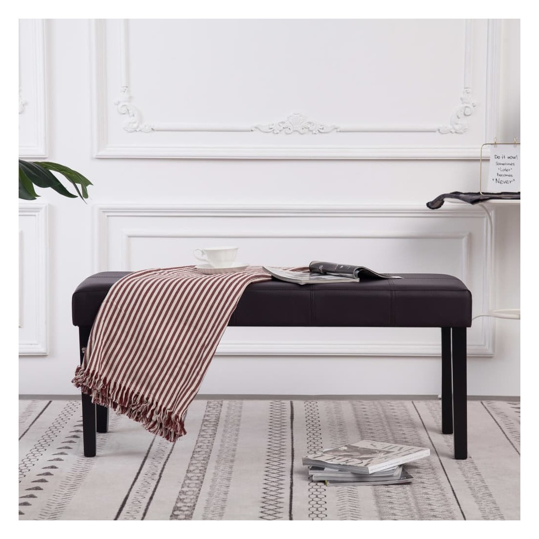 Fabriqué en similicuir, ce banc est un choix idéal pour compléter votre décoration intérieure. Il est doté d'un cadre en bois durable et d'un rembourrage en similicuir facile à nettoyer. De plus, le dessus épaississement rembourré vous apportera un confort d'assise optimal et fera de la banquette votre endroit préféré pour vous détendre. Le banc est facile à assembler.