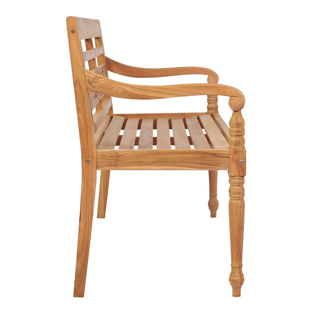 Ce banc Batavia en bois confortable et élégant ajoutera une touche de charme rustique à votre jardin ou terrasse. Fabriquée en bois dur de teck extrêmement durable, cette pièce de meuble en teck a été chevronnée, séchée au four puis finement poncée pour lui donner un aspect très lisse. Le bois de teck est connu pour sa résistance exceptionnelle aux intempéries, ce qui le rend bien plus adapté aux meubles de jardin que tout autre type de bois. Le bois de teck est le choix idéal si vous souhaitez acheter une pièce de meubles de jardin durable. Grâce à la surface poncée, le banc de jardin est résistant aux intempéries et facile à nettoyer. Il est également très approprié pour vous détendre ou dîner avec vos amis ou votre famille. Le coussin inclus est pratique et a une fonction décorative.