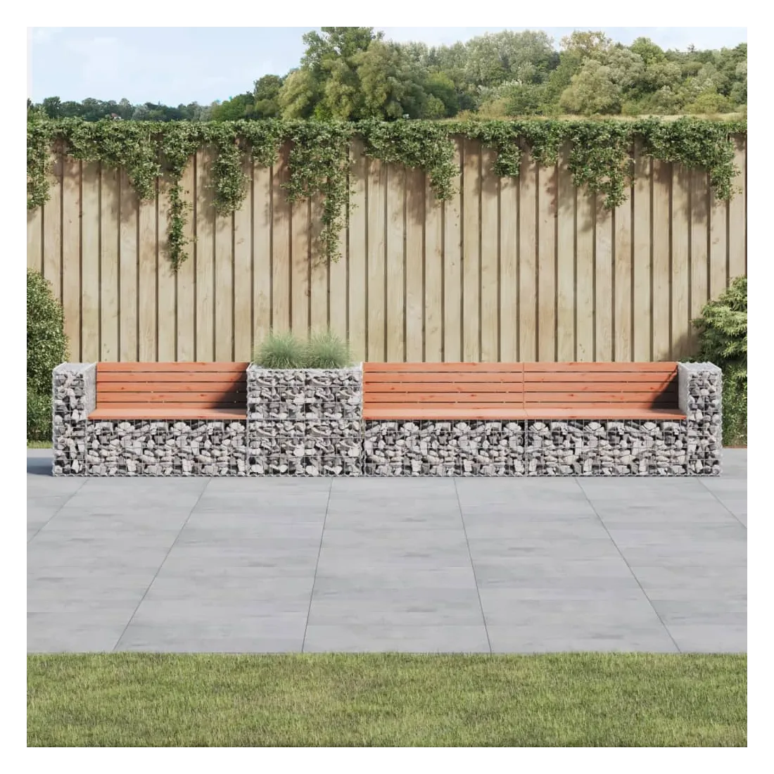 Ce banc de jardin avec panier en gabion seront un véritable accroche-regard dans votre espace de vie extérieur. Bois de douglas massif : le dessus du siège de jardin est fabriqué en bois de douglas massif pour plus de durabilité. Le bois de douglas est également suffisamment solide pour être travaillé avec un minimum de soin, même sous l'influence des intempéries.Base robuste et stable : le banc d'extérieur est doté d'une base en gabion en acier galvanisé conçue pour être remplie de roches et de graviers pour plus de beauté. La grille maillée du panier de gabion est soudée avec des fils transversaux et longitudinaux à chaque intersection pour une stabilité supplémentaire.Design compact : le banc de jardin est parfait pour un espace limité grâce à son design étroit et compact.Large éventail d'utilisations : le banc de parc convient aux jardins, arrière-cours, terrasses, coins secrets et à bien d'autres endroits. Bon à savoir :Ce produit est assemblé par 2 bancs de jardin (angle), un banc de jardin (central) et un panier de gabion.