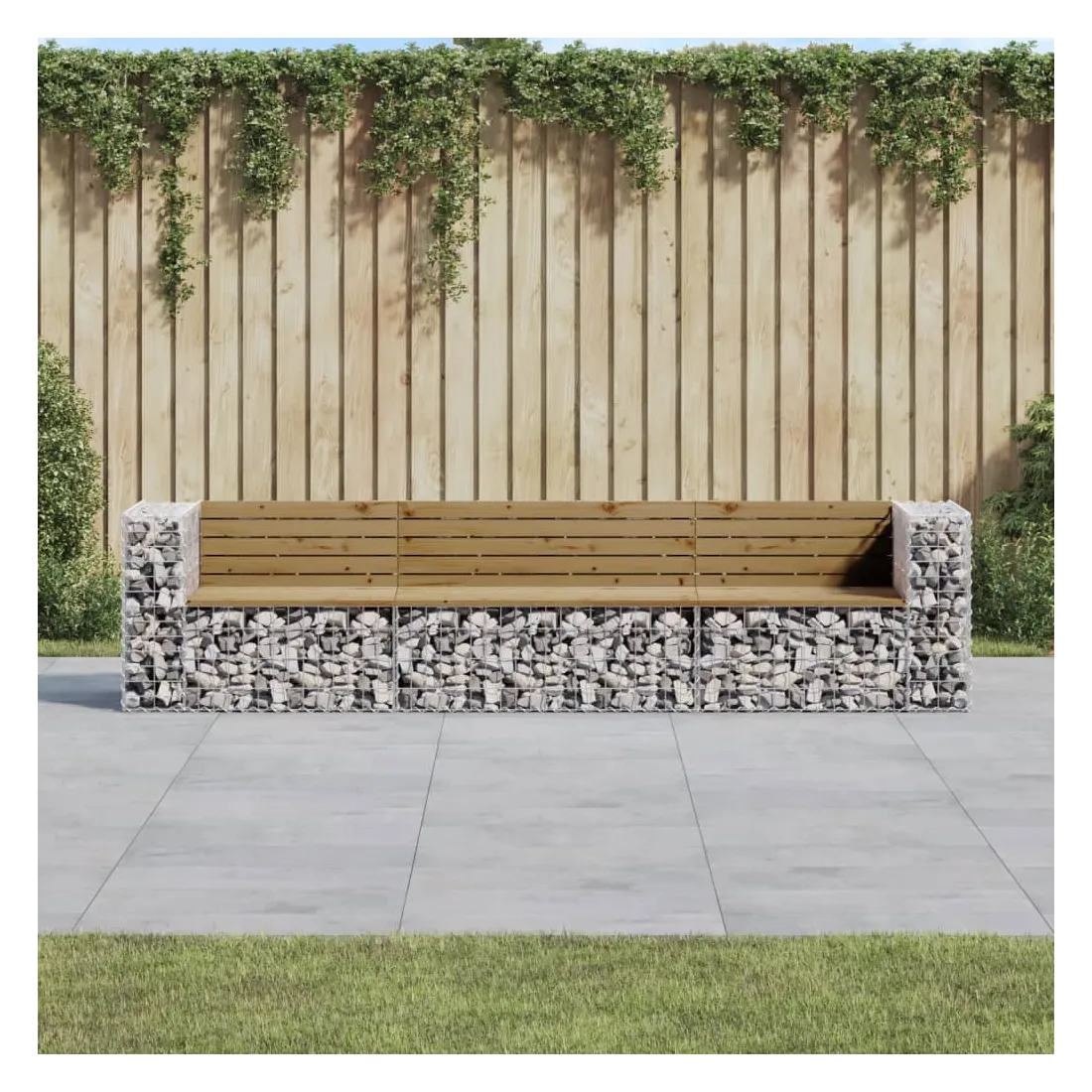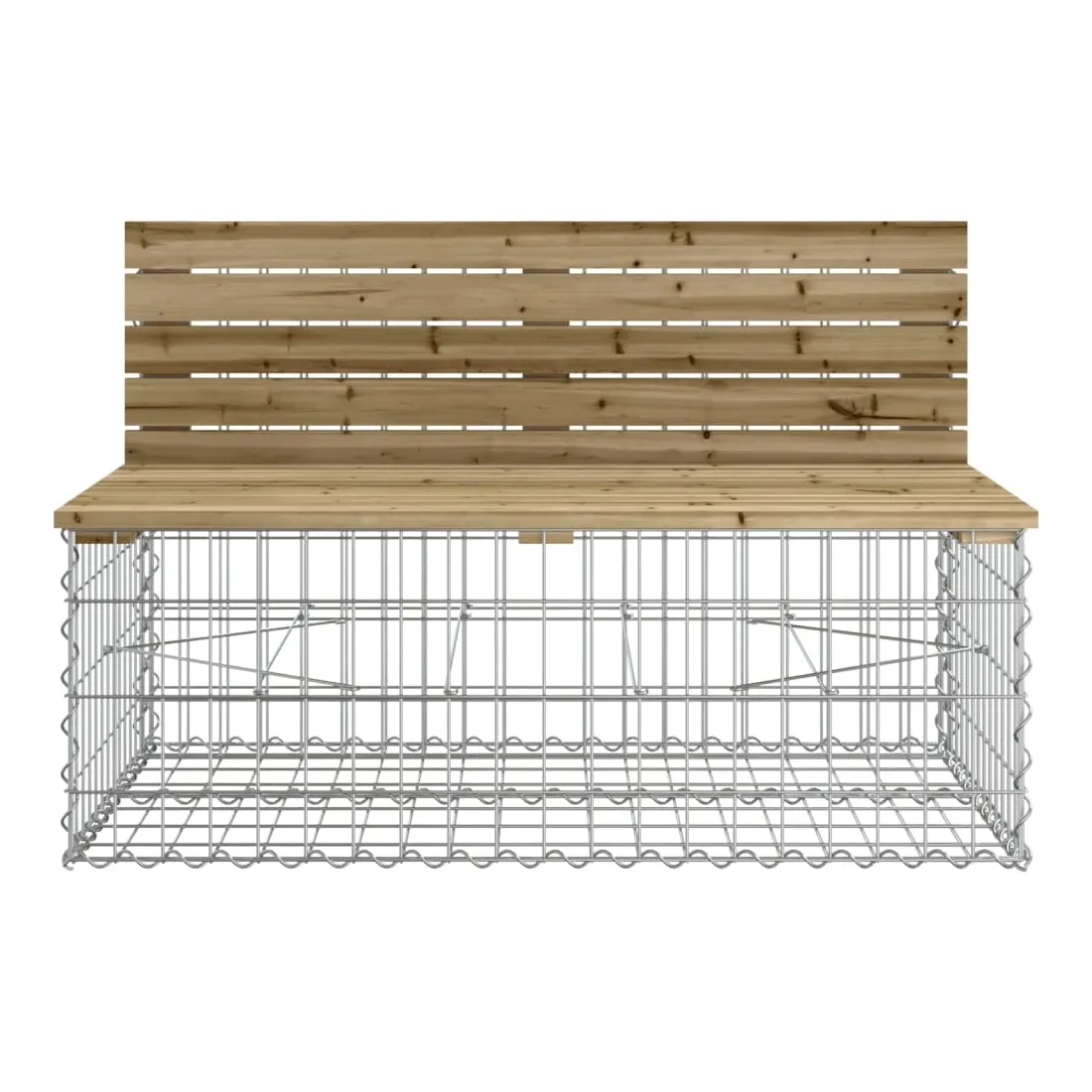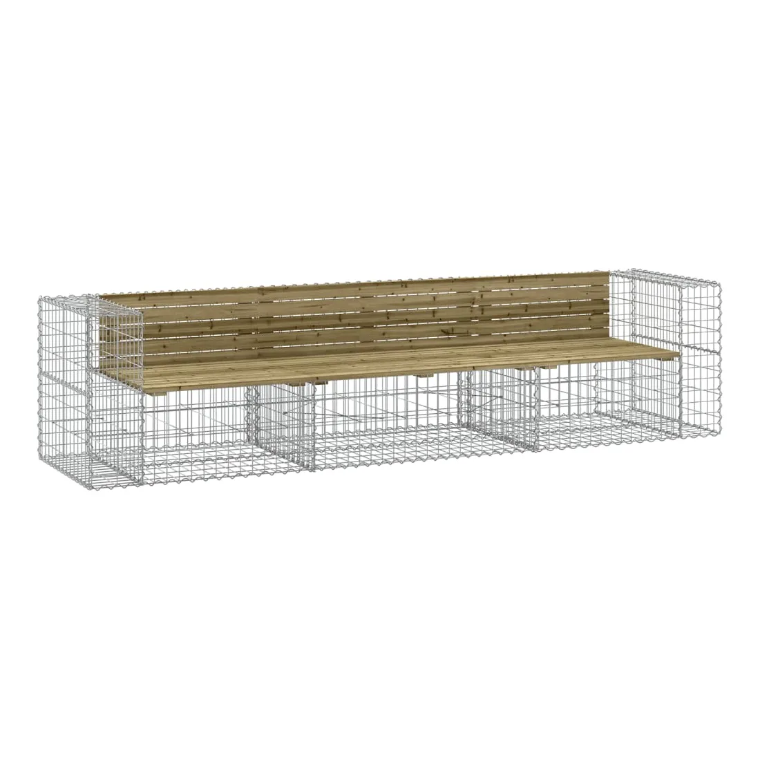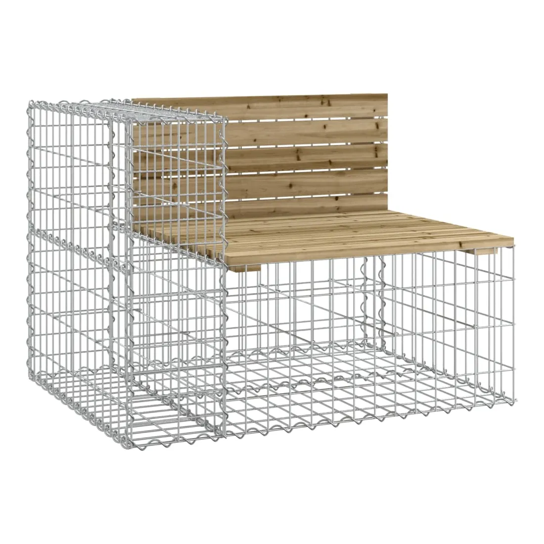 Créez votre propre espace extérieur avec ce banc de jardin ! Ce banc de jardin attirera tous les regards dans votre espace de vie extérieur. Bois imprégné : le dessus du siège de jardin est en bois de pin imprégné sous vide pour plus de durabilité. Le bois de pin massif est un beau matériau naturel. Son grain est droit et les nœuds confèrent au matériau son aspect rustique caractéristique. L'imprégnation est un processus de conservation réalisé à l'aide d'autoclaves. Le traitement sous pression augmente la résistance à la pourriture et aux intempéries.Base robuste et stable : le banc d'extérieur est doté d'une base en gabion en acier galvanisé conçue pour être remplie de roches et de graviers pour plus de beauté. La grille maillée du panier de gabion est soudée avec des fils transversaux et longitudinaux à chaque intersection pour une stabilité supplémentaire.Design compact : le banc de jardin est parfait pour un espace limité grâce à son design étroit et compact.Large éventail d'utilisations : le banc de parc convient aux jardins, arrière-cours, terrasses, coins secrets et à bien d'autres endroits. Bon à savoir :Ce produit est assemblé par 2 bancs de jardin (angle) et un banc de jardin (central).