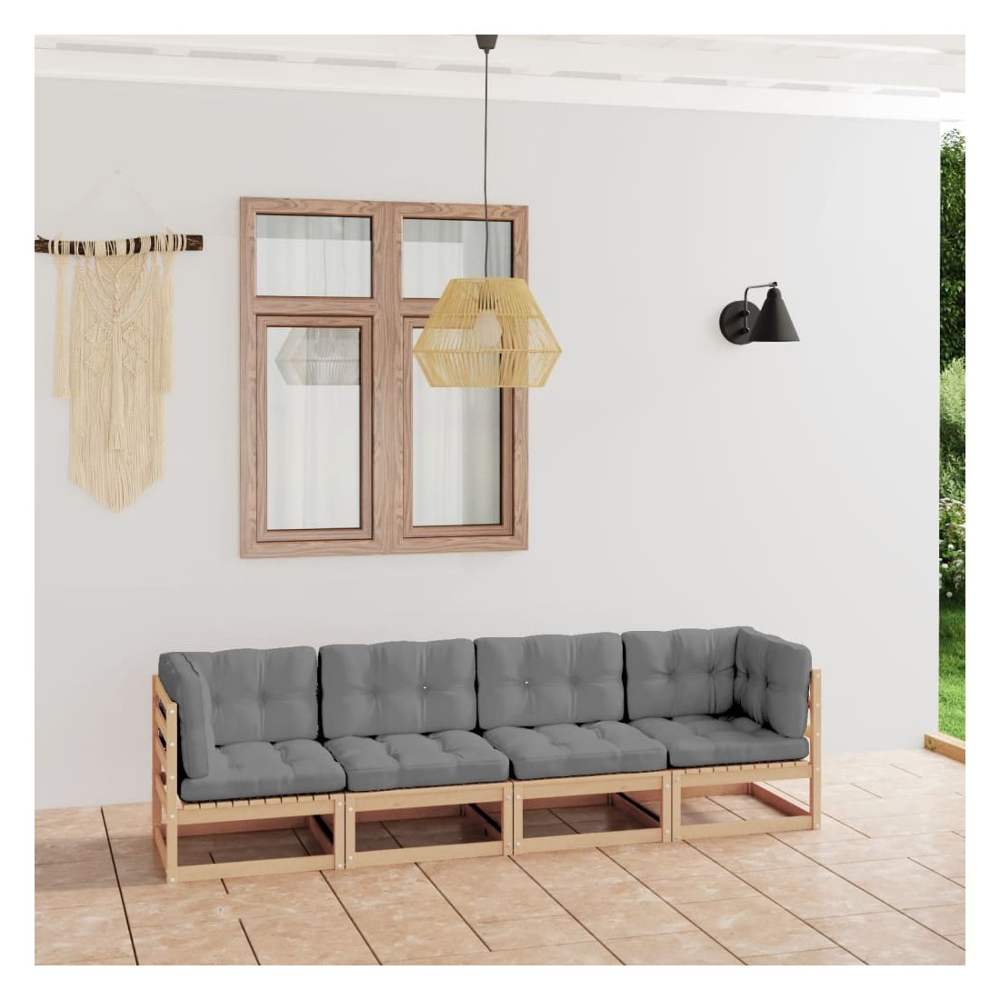 Ce canapé 4 places de jardin est un choix idéal pour vous détendre et profiter du beau temps, faire une sieste ou discuter avec votre famille ou vos amis. Le canapés en bois est fabriqué en pin massif, ce qui le rend robuste et stable. Ce siège de jardin a une construction solide et nécessite peu d'entretien. Les coussins ajoutent un confort supplémentaire. Ce canapé d'extérieur ajoutera une touche de charme rustique à votre espace de vie extérieur. Remarque : afin de prolonger la durée de vie des meubles d'extérieur, nous vous recommandons de les protéger avec une housse imperméable.