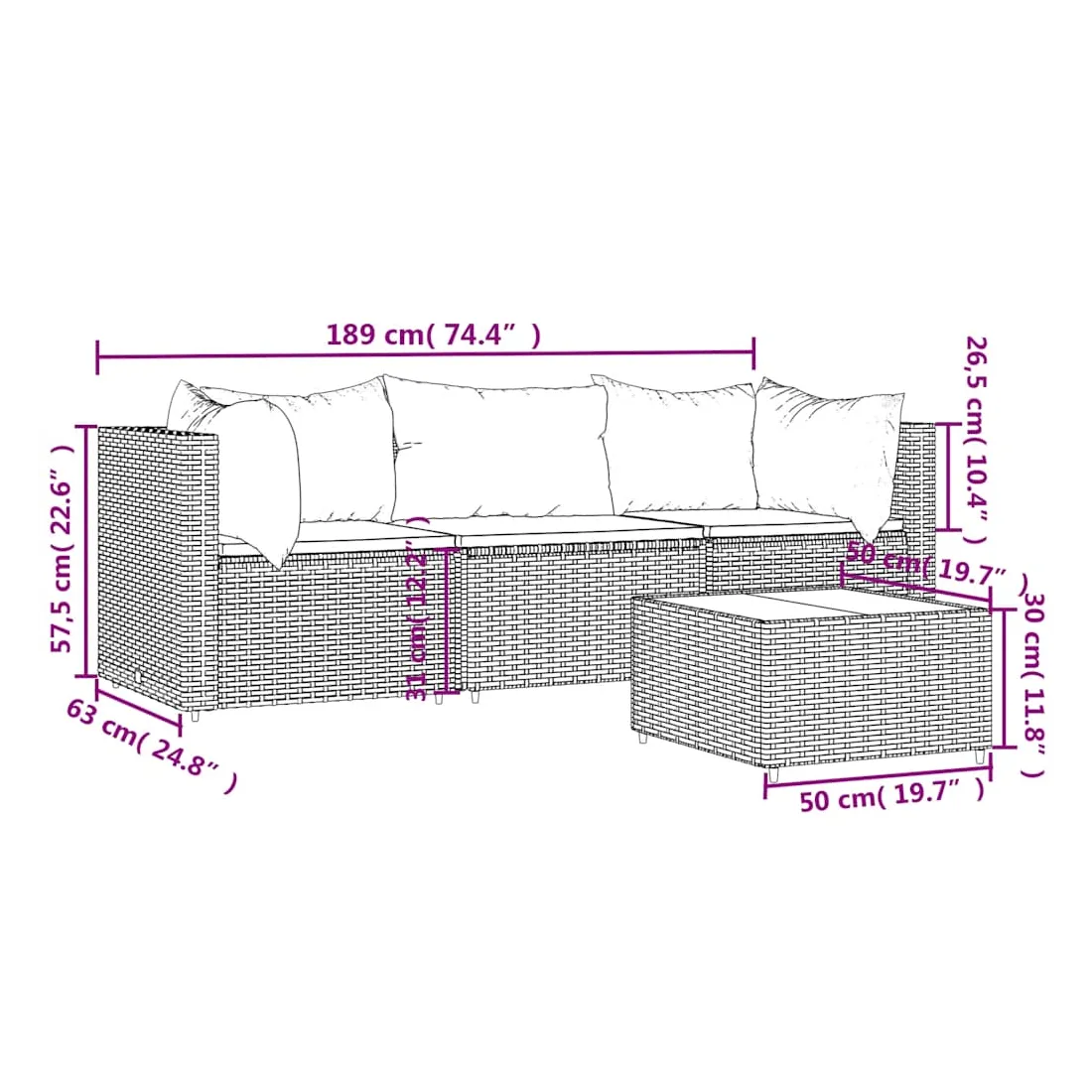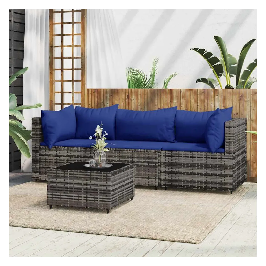Cet ensemble de salon de jardin tendance, au design élégant et contemporain, est un excellent choix pour manger ou vous détendre dans votre jardin. Matériau résistant aux intempéries : la résine tressée, également connue sous le nom de rotin poly, résiste aux intempéries et est facile à nettoyer. Elle reste belle à l'extérieur pendant une longue période. Elle offre une excellente qualité, commodité et un aspect esthétique.Cadre robuste : les cadres en acier enduit de poudre rendent l'ensemble de salon d'extérieur robuste et stable pour une utilisation quotidienne à l'extérieur.Dessus de table pratique : le dessus lisse de la table de jardin est en verre trempé, facile à nettoyer avec un chiffon humide. De plus, le dessus robuste est parfait pour placer des repas, des boissons et d'autres objets décoratifs.Conception modulaire : l'ensemble de salon de jardin est flexible et facile à déplacer, vous pouvez donc le combiner avec d'autres segments modulaires dans la boutique en ligne pour créer vos propres configurations d'ensemble de salon de jardin !Expérience d'assise confortable : le dossier ajoute un confort d'assise supplémentaire au canapé de jardin. De plus, les coussins bien rembourrés offrent du confort pendant votre temps d'assise. Bon à savoir :Pour faciliter au maximum le montage, chaque produit est livré avec des instructions. Remarque :Le produit est conçu pour une utilisation à l'extérieur uniquement. Ne le rangez pas à l'intérieur.Pour que vos meubles d'extérieur restent beaux, nous vous recommandons de les protéger avec une housse imperméable.