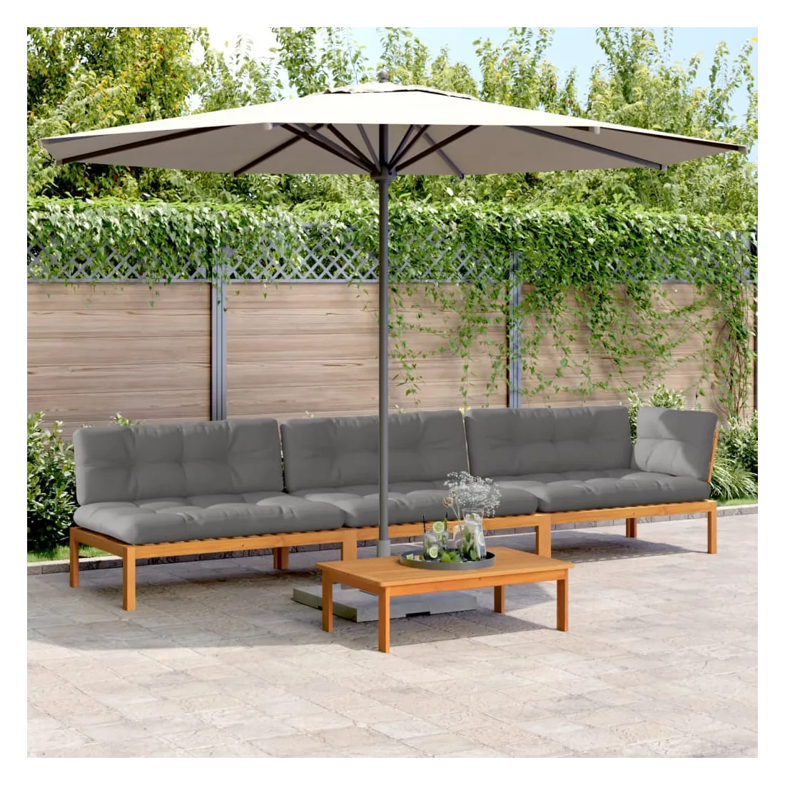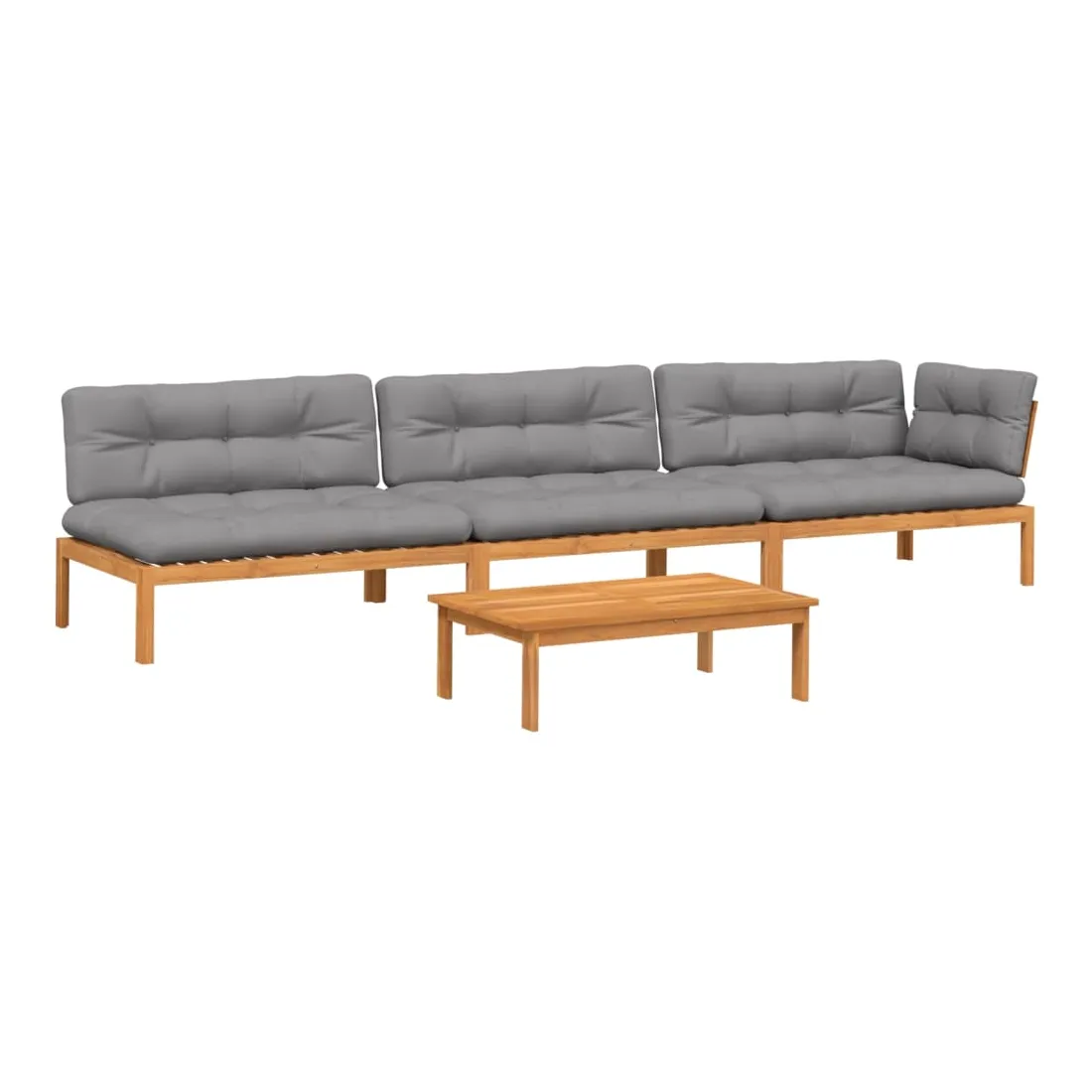 Cet ensemble de canapés en palettes en bois au design à lattes sera un excellent ajout à votre jardin, patio ou terrasse pour profiter d’un moment agréable en famille ou entre amis. Matériau durable : le bois d'acacia massif est un matériau naturel magnifique. Le bois d'acacia un bois dur tropical, qui est dense, robuste et durable.Dessus stable et facile à nettoyer : cette table de jardin a un dessus en bois d'acacia robuste, durable et facile à nettoyer avec un chiffon humide.Expérience d'assise confortable : le dossier ajoute un confort d'assise supplémentaire pour le canapé d'extérieur. Ce mobilier d'extérieur, doté d'un coussin épais, offre une expérience d'assise confortable.Conception modulaire : cet ensemble de meubles d'extérieur a une conception modulaire, ce qui le rend complètement flexible et facile à déplacer, afin que vous puissiez créer un agencement de meubles d'extérieur personnalisé. Bon à savoir :Pour que vos meubles d'extérieur restent beaux, nous vous recommandons de les protéger avec une housse imperméable.