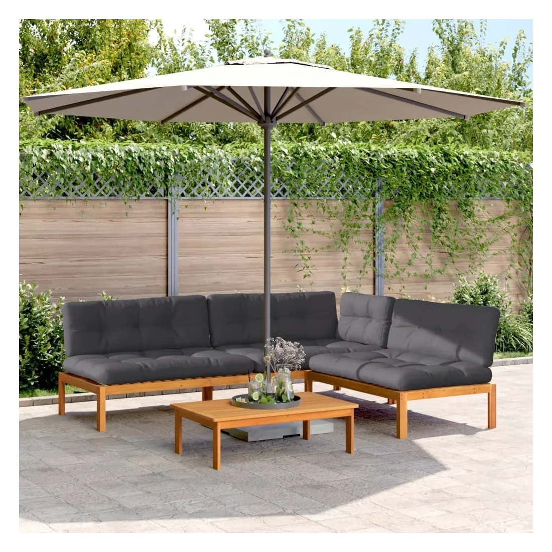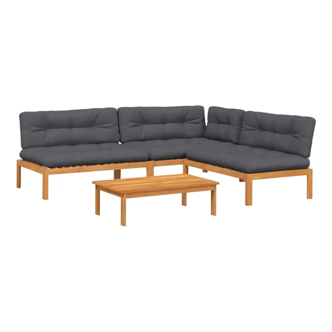 Cet ensemble de canapés en palettes en bois au design à lattes sera un excellent ajout à votre jardin, patio ou terrasse pour profiter d’un moment agréable en famille ou entre amis. Matériau durable : le bois d'acacia massif est un matériau naturel magnifique. Le bois d'acacia un bois dur tropical, qui est dense, robuste et durable.Dessus stable et facile à nettoyer : cette table de jardin a un dessus en bois d'acacia robuste, durable et facile à nettoyer avec un chiffon humide.Expérience d'assise confortable : le dossier ajoute un confort d'assise supplémentaire pour le canapé d'extérieur. Ce mobilier d'extérieur, doté d'un coussin épais, offre une expérience d'assise confortable.Conception modulaire : cet ensemble de meubles d'extérieur a une conception modulaire, ce qui le rend complètement flexible et facile à déplacer, afin que vous puissiez créer un agencement de meubles d'extérieur personnalisé. Bon à savoir :Pour que vos meubles d'extérieur restent beaux, nous vous recommandons de les protéger avec une housse imperméable.