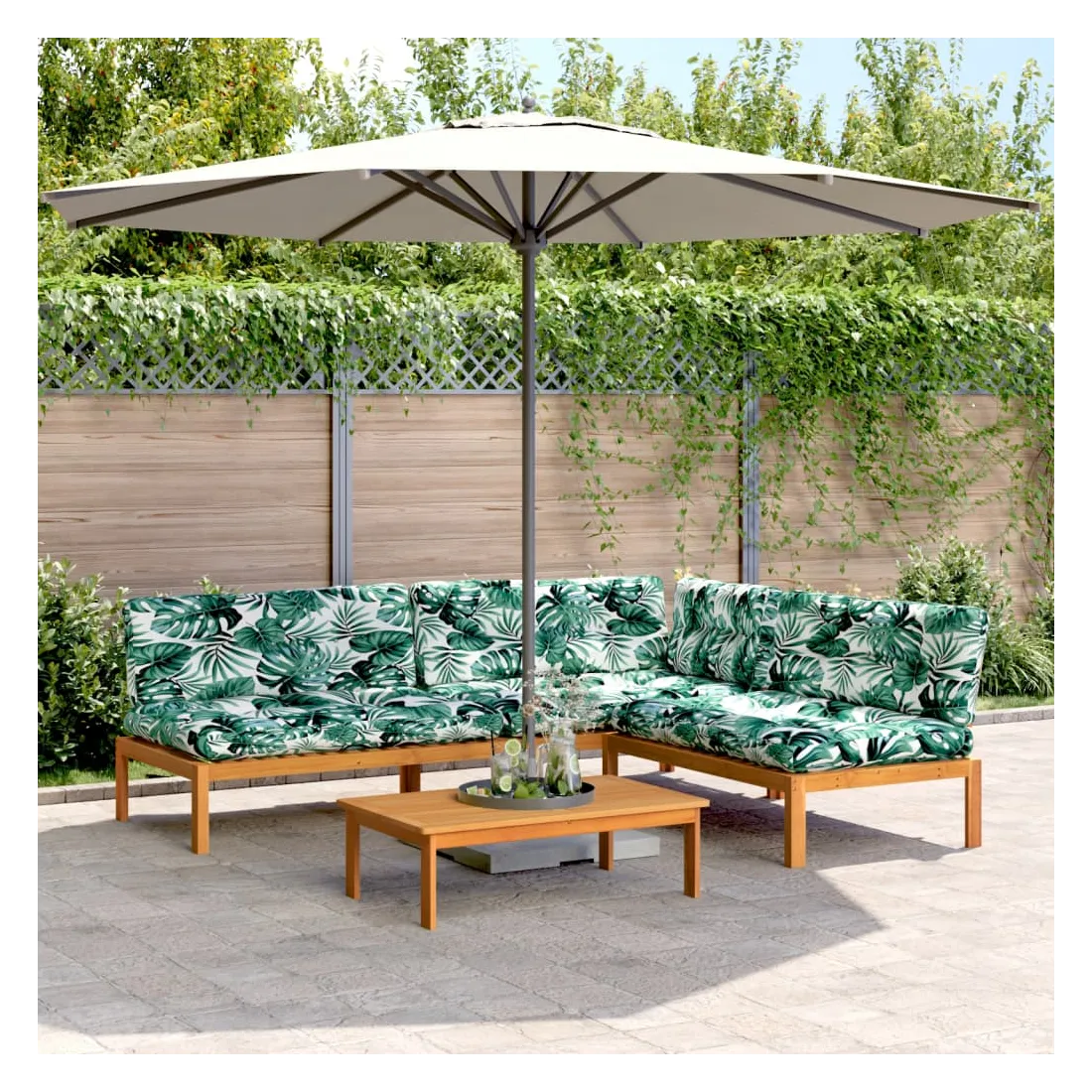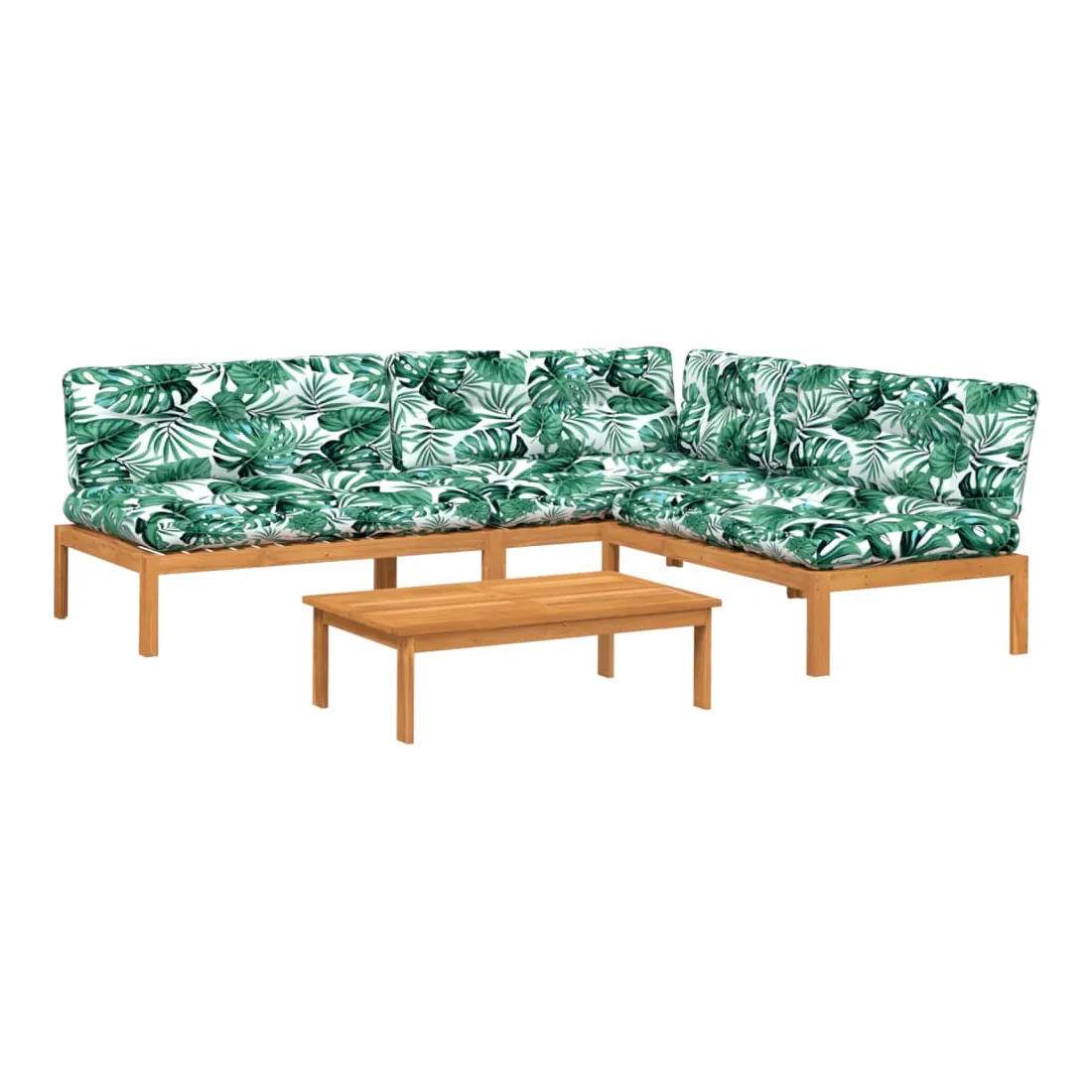 Cet ensemble de canapés en palettes en bois au design à lattes sera un excellent ajout à votre jardin, patio ou terrasse pour profiter d’un moment agréable en famille ou entre amis. Matériau durable : le bois d'acacia massif est un matériau naturel magnifique. Le bois d'acacia un bois dur tropical, qui est dense, robuste et durable.Dessus stable et facile à nettoyer : cette table de jardin a un dessus en bois d'acacia robuste, durable et facile à nettoyer avec un chiffon humide.Expérience d'assise confortable : le dossier ajoute un confort d'assise supplémentaire pour le canapé d'extérieur. Ce mobilier d'extérieur, doté d'un coussin épais, offre une expérience d'assise confortable.Conception modulaire : cet ensemble de meubles d'extérieur a une conception modulaire, ce qui le rend complètement flexible et facile à déplacer, afin que vous puissiez créer un agencement de meubles d'extérieur personnalisé. Bon à savoir :Pour que vos meubles d'extérieur restent beaux, nous vous recommandons de les protéger avec une housse imperméable.
