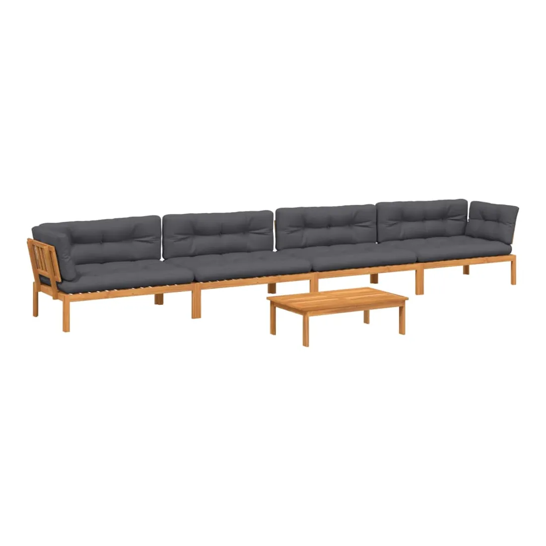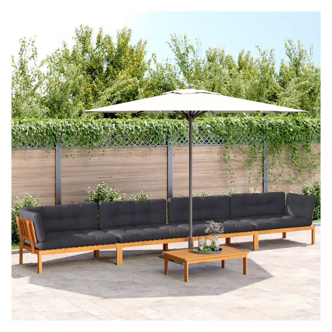 Cet ensemble de canapés en palettes en bois au design à lattes sera un excellent ajout à votre jardin, patio ou terrasse pour profiter d’un moment agréable en famille ou entre amis. Matériau durable : le bois d'acacia massif est un matériau naturel magnifique. Le bois d'acacia un bois dur tropical, qui est dense, robuste et durable.Dessus stable et facile à nettoyer : cette table de jardin a un dessus en bois d'acacia robuste, durable et facile à nettoyer avec un chiffon humide.Expérience d'assise confortable : le dossier ajoute un confort d'assise supplémentaire pour le canapé d'extérieur. Ce mobilier d'extérieur, doté d'un coussin épais, offre une expérience d'assise confortable.Conception modulaire : cet ensemble de meubles d'extérieur a une conception modulaire, ce qui le rend complètement flexible et facile à déplacer, afin que vous puissiez créer un agencement de meubles d'extérieur personnalisé. Bon à savoir :Pour que vos meubles d'extérieur restent beaux, nous vous recommandons de les protéger avec une housse imperméable.