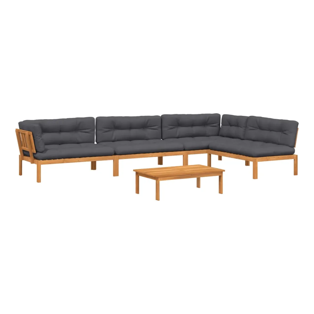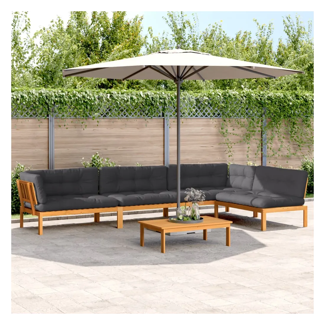 Cet ensemble de canapés en palettes en bois au design à lattes sera un excellent ajout à votre jardin, patio ou terrasse pour profiter d’un moment agréable en famille ou entre amis. Matériau durable : le bois d'acacia massif est un matériau naturel magnifique. Le bois d'acacia un bois dur tropical, qui est dense, robuste et durable.Dessus stable et facile à nettoyer : cette table de jardin a un dessus en bois d'acacia robuste, durable et facile à nettoyer avec un chiffon humide.Expérience d'assise confortable : le dossier ajoute un confort d'assise supplémentaire pour le canapé d'extérieur. Ce mobilier d'extérieur, doté d'un coussin épais, offre une expérience d'assise confortable.Conception modulaire : cet ensemble de meubles d'extérieur a une conception modulaire, ce qui le rend complètement flexible et facile à déplacer, afin que vous puissiez créer un agencement de meubles d'extérieur personnalisé. Bon à savoir :Pour que vos meubles d'extérieur restent beaux, nous vous recommandons de les protéger avec une housse imperméable.