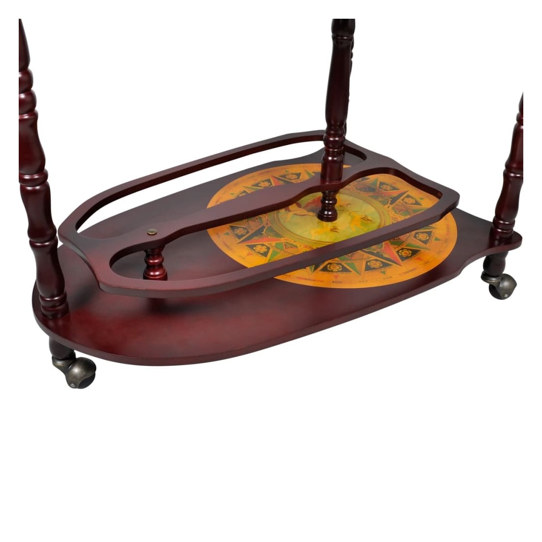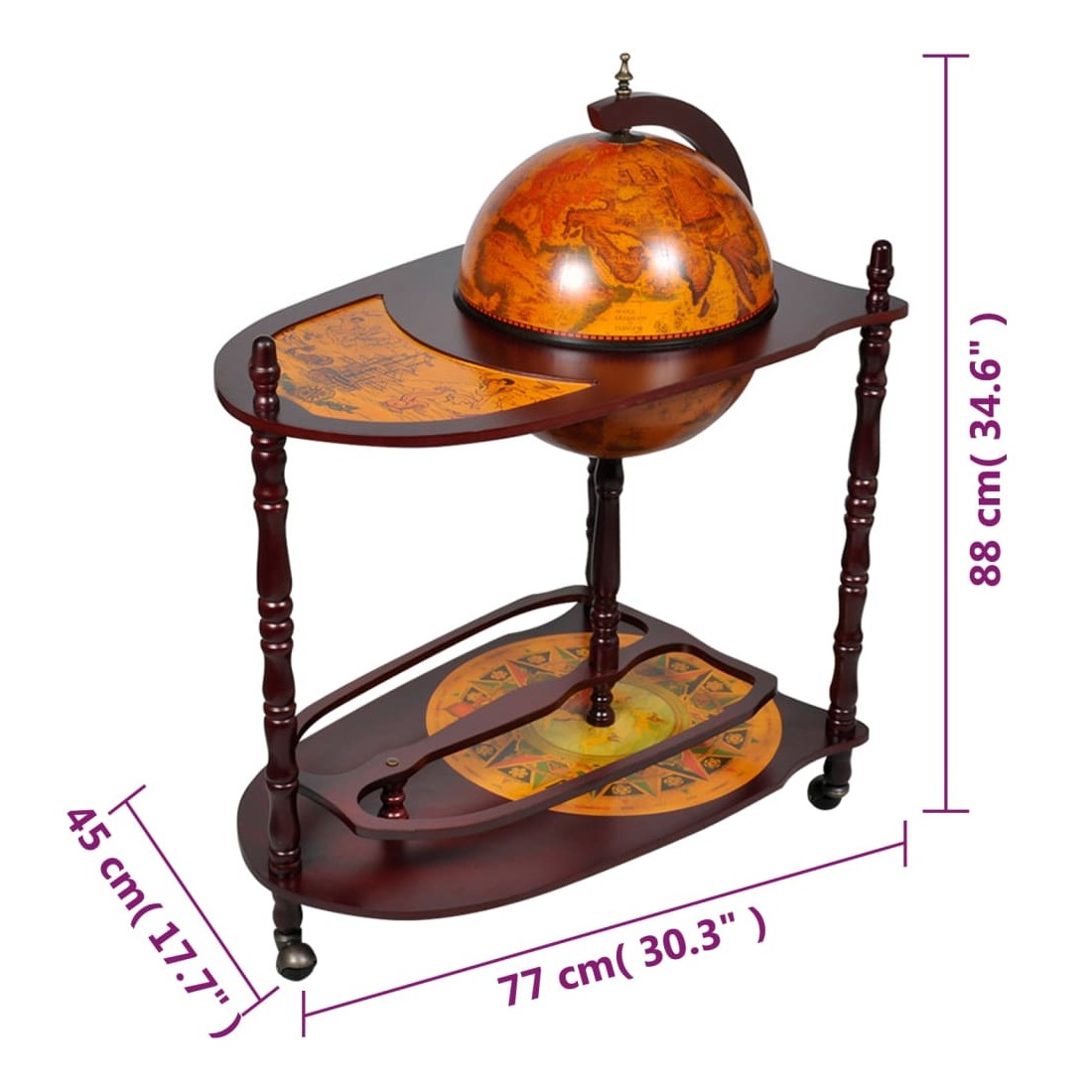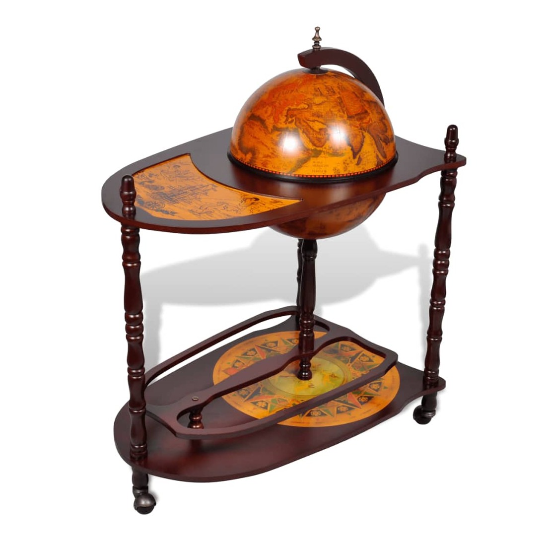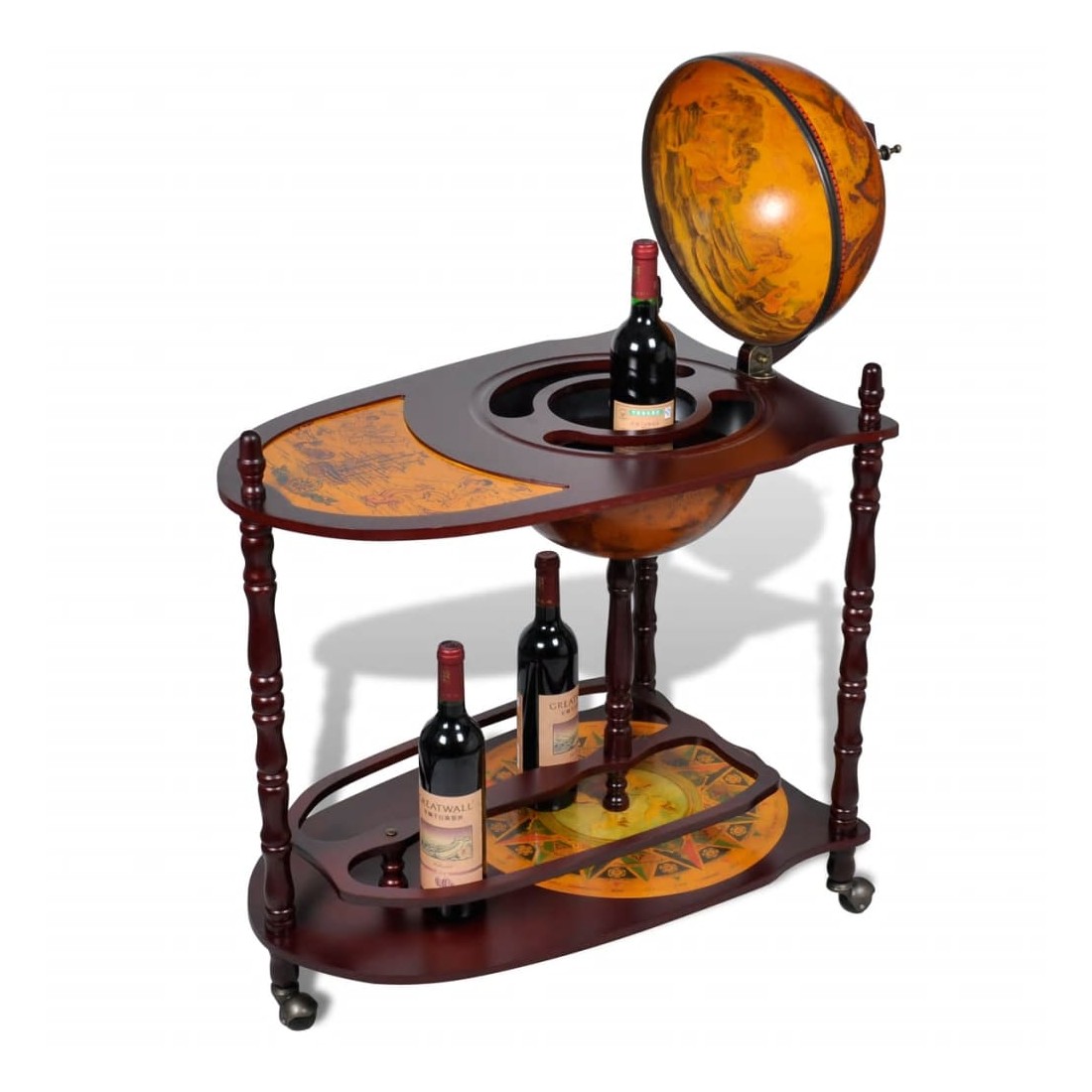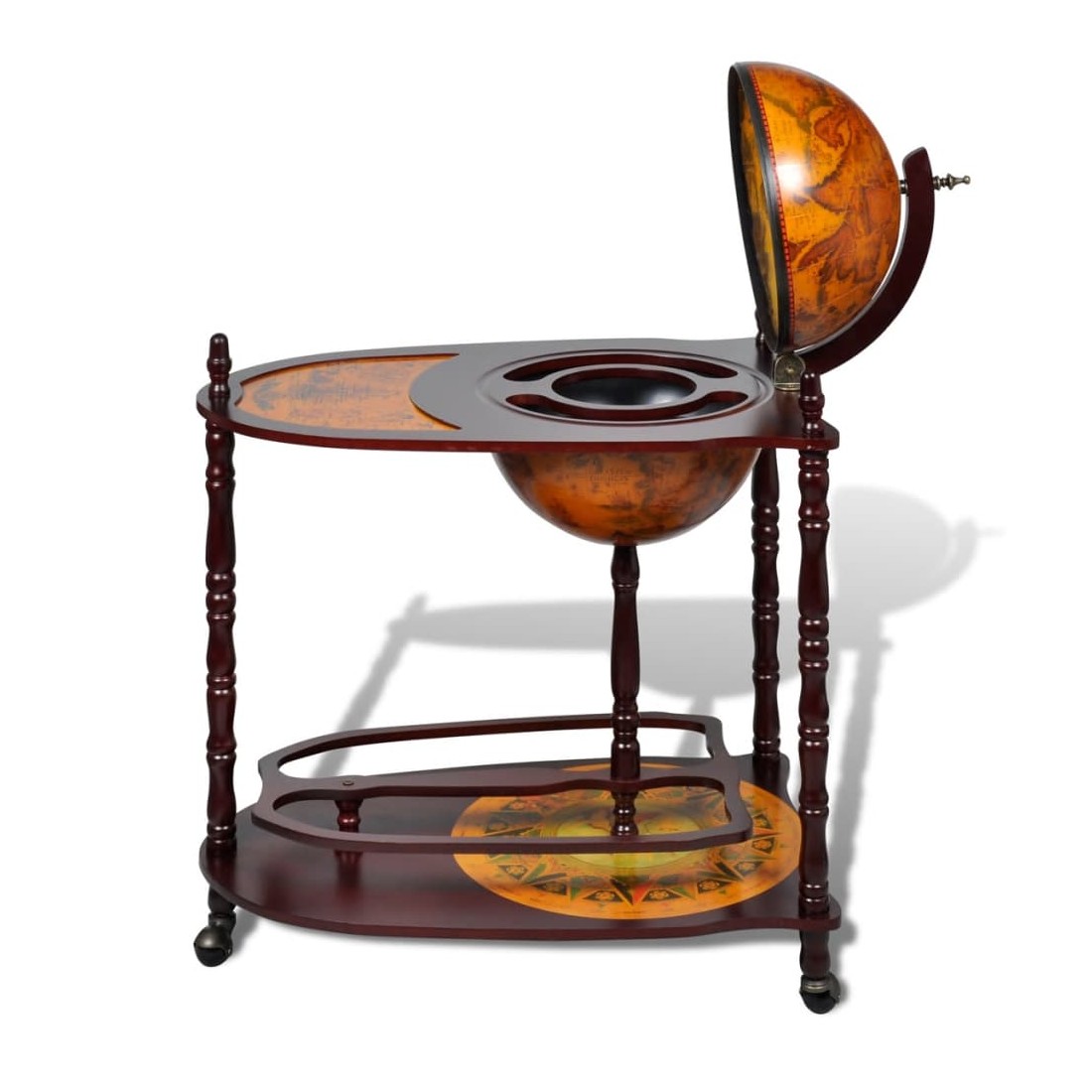 Le globe en bois s'ouvre pour révéler un grand bar avec beaucoup d'espace pour le vin, les spiritueux, la boisson et les verres à pied, ainsi vous pouvez afficher vos bouteilles et verres dans l'ordre dans l'espace caché tout en assurant l'accès facile. Équipé de table étendue et de base inférieure, vous pouvez également mettre des bouteilles et des verres à pied sur la table ou à la base inférieure. La surface extérieure du globe est recouverte d'une vieille carte nautique, tandis que la table, la base et l'intérieur du globe présentent des peintures de l'époque de la Renaissance, ce qui fait du bar un objet d'art et une bonne décoration pour la maison ou le bureau. Le meuble est équipé de roulettes, ce qui rend le déplacement de l'armoire une tâche plus facile. Vous êtes en mesure de déplacer l'armoire à vin à n'importe quel coin de votre pièce avec facilité. Cette armoire de bar sous forme de globe avec table et roues est sans aucun doute une combinaison parfaite de fonctions de stockage et esthétiques.