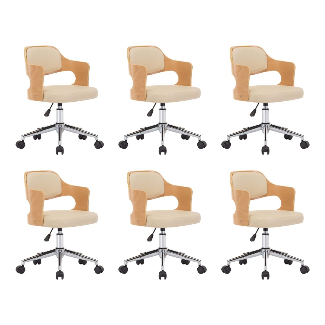 vidaXLCet ensemble de 6 chaises de salle à manger, avec son design élégant et contemporain, est destiné à ajouter une touche de classe à n'importe quel salon, dortoir ou bureau. L'assise et le dossier sont tapissés de similicuir facile à nettoyer, ce qui permet d'obtenir un confort optimal de la chaise. Le cadre en bois ajoute de la stabilité à cette chaise latérale. Le dossier et le siège soutiennent votre dos et réduisent la pression sur votre colonne vertébrale. Cette chaise est équipée de 5 roulettes pour la déplacer facilement. Le mécanisme de levage à gaz vous permet de régler la hauteur de la chaise de salle à manger. Ces chaises latérales apporteront une touche de style à n'importe quelle maison ou bureau. Ces chaises de salle à manger sont également faciles à assembler.