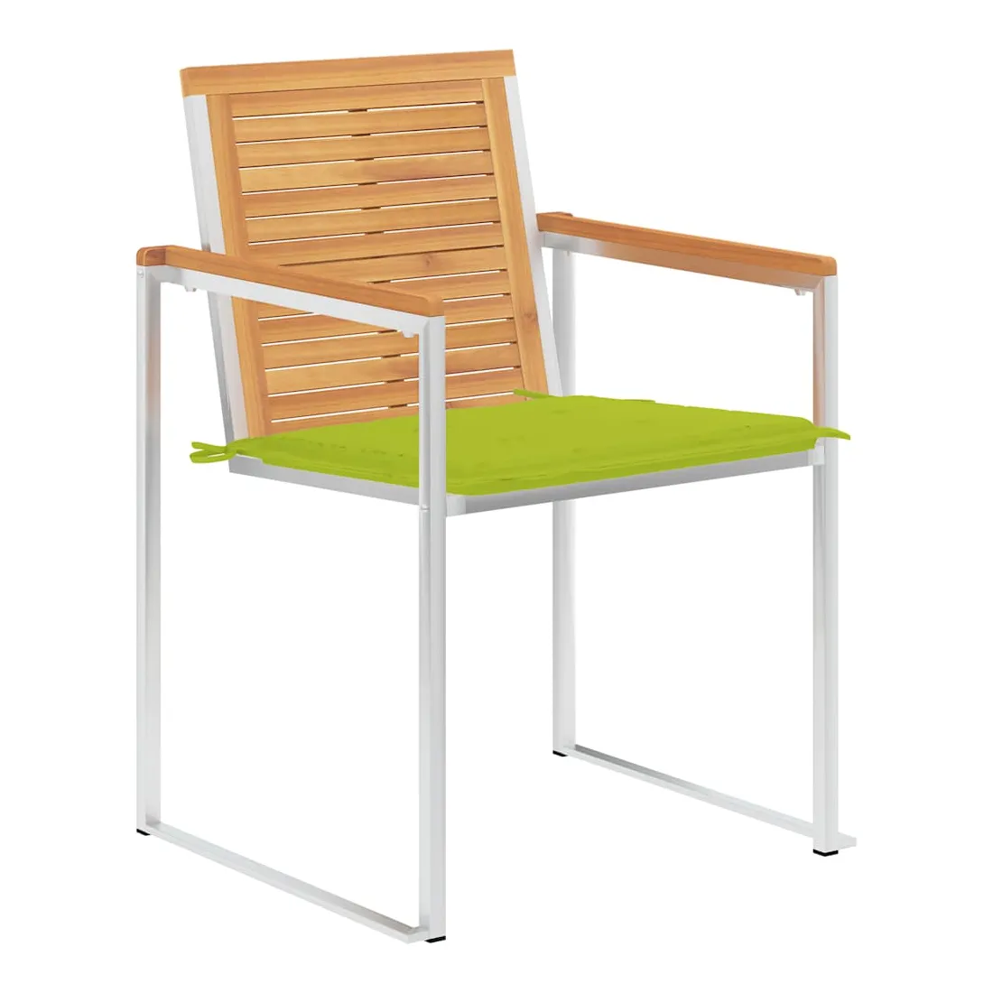 Ces chaises de jardin en bois sont un excellent choix pour les repas en plein air ou simplement pour vous détendre dans votre jardin ou sur votre terrasse. Construit à partir de bois dur de teck extrêmement durable, ce meuble en teck a été chevronné, séché au four puis poncé finement pour lui donner un aspect très lisse. Le bois de teck est connu pour sa résistance exceptionnelle et sa résistance aux intempéries, ce qui le rend bien plus adapté aux meubles de jardin que tout autre type de bois. Le bois de teck est le choix parfait si vous souhaitez acheter un meuble de jardin durable. Les chaises sont également fabriquées en acier inoxydable 304 de haute qualité, ce qui les rend résistantes à la rouille et faciles à nettoyer. De plus, le coussin ajoute du confort supplémentaire à votre