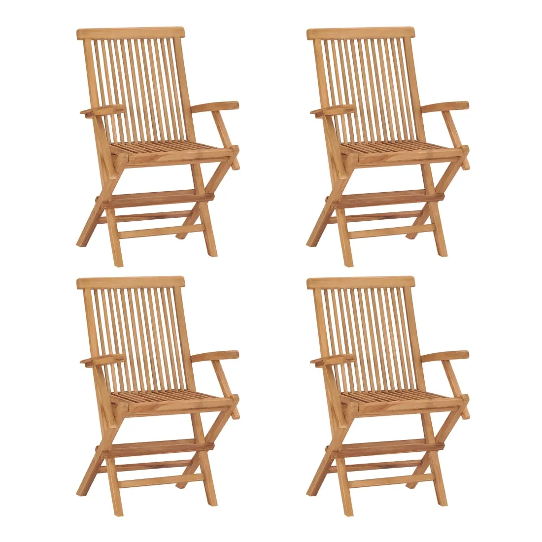 Cet ensemble de chaises de jardin en bois se compose de 4 pièces et est destiné à être un excellent supplément à votre jardin, terrasse ou patio. Vous pouvez vous détendre et discuter avec la famille et les amis ou profiter du bon temps. Fabriquée en bois dur de teck extrêmement durable, cette pièce de meuble en teck a été chevronnée, séchée au four puis finement poncée pour lui donner un aspect très lisse. Le bois de teck est connu pour sa résistance exceptionnelle aux intempéries, ce qui le rend bien plus adapté aux meubles de jardin que tout autre type de bois. Le bois de teck est le choix idéal si vous souhaitez acheter une pièce de meubles de jardin durable. La surface poncée est facile à nettoyer avec un chiffon humide. Ces chaises d'extérieur sont également légères, ce qui les rend complètement flexibles et faciles à déplacer. Les chaises en bois peuvent être pliées pour gagner de la place lorsqu'elles ne sont pas utilisées. De plus, les coussins de siège inclus bien rembourrés offrent également un confort d'assise supplémentaire.