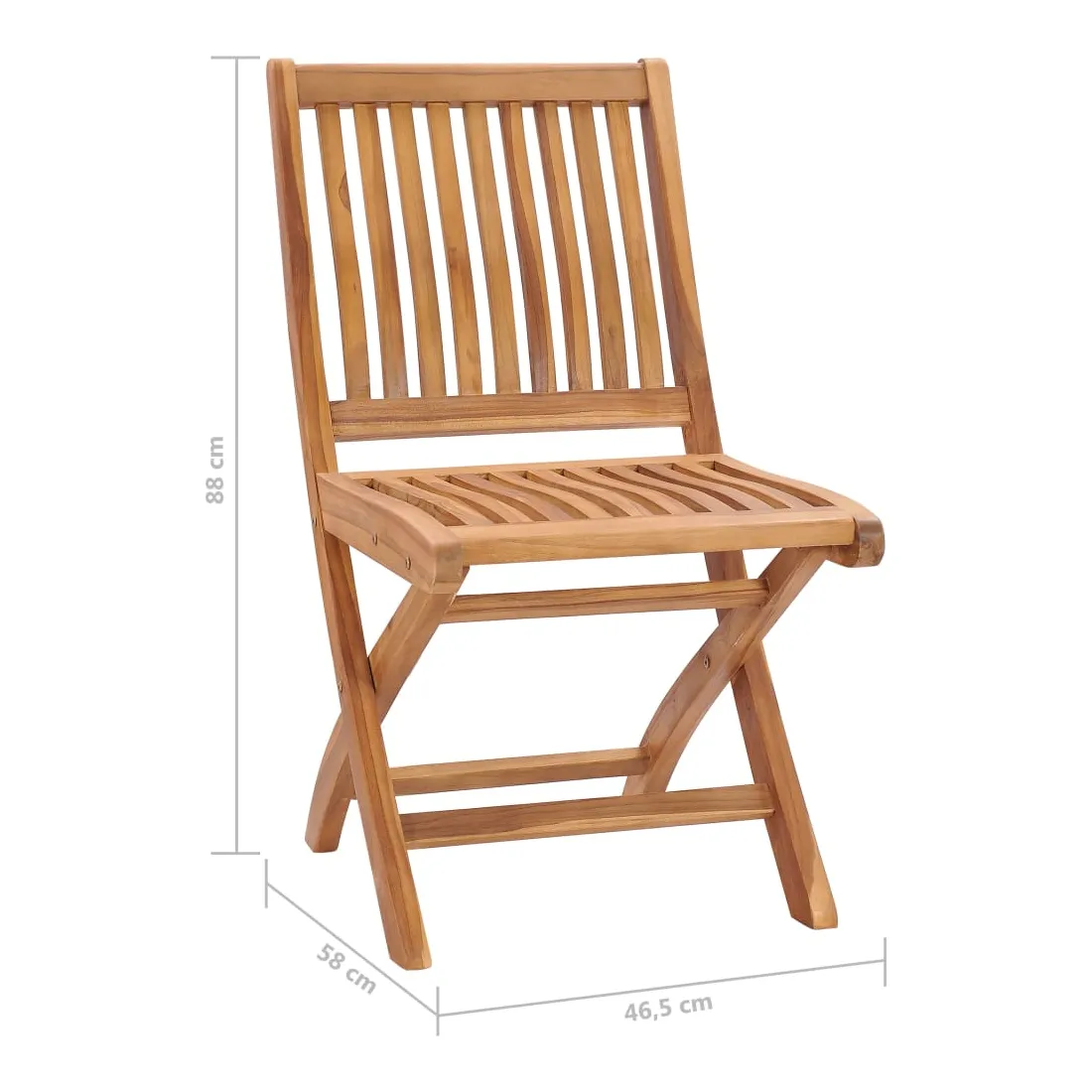 vidaXLCet ensemble de chaises de jardin en bois présente un design intemporel. Les chaises d’extérieur conviennent à tous les environnements, tels que les maisons, les bureaux, les bars et les cafés, grâce à leur design simple mais élégant. Fabriqué en bois dur de teck extrêmement durable, cet ensemble de meubles en teck a été chevronné, séché au four puis finement poncé pour lui donner un aspect très lisse. Le bois de teck est connu pour sa résistance exceptionnelle aux intempéries, ce qui le rend bien plus adapté aux meubles de jardin que tout autre type de bois. Le bois de teck est le choix idéal si vous souhaitez acheter un meuble de jardin durable. Grâce à la surface sablée, les chaises de salle à manger sont résistantes aux intempéries et faciles à nettoyer. Elles peuvent également être pliées pour économiser de l’espace de stockage lorsqu'elles ne sont pas utilisées. De plus, les coussins fournis offrent un confort supplémentaire. Chaque coussin dispose de 2 ensembles de cordes pour le fixer solidement sur la chaise. Remarque : afin de prolonger la durée de vie de vos meubles d'extérieur, nous vous recommandons de les nettoyer régulièrement et de ne pas les laisser à l'extérieur sans protection inutilement.Nettoyage : utiliser une solution savonneuse douceStockage : si possible, stockez dans un endroit frais et sec à l'intérieur. Si le produit est stocké à l'extérieur, protégez-le avec une housse imperméable. Essuyez et séchez l'excès d'eau ou de neige des surfaces planes après la pluie ou une chute de neige. Permettez une circulation d'air suffisante afin d'éviter les dommages liés à l'humidité.