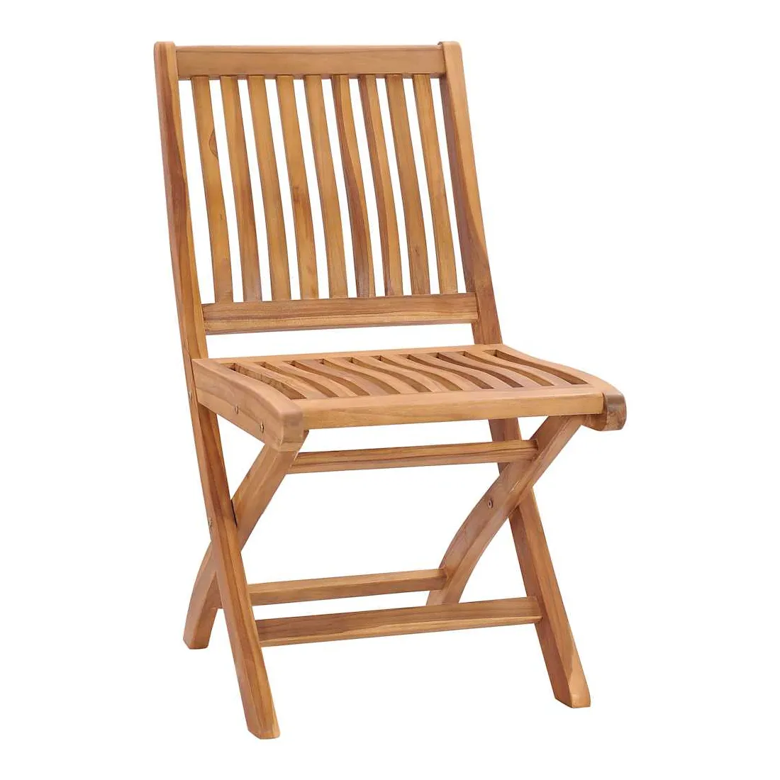 Cet ensemble de chaises de jardin en bois présente un design intemporel. Les chaises d’extérieur conviennent à tous les environnements, tels que les maisons, les bureaux, les bars et les cafés, grâce à leur design simple mais élégant. Fabriqué en bois dur de teck extrêmement durable, cet ensemble de meubles en teck a été chevronné, séché au four puis finement poncé pour lui donner un aspect très lisse. Le bois de teck est connu pour sa résistance exceptionnelle aux intempéries, ce qui le rend bien plus adapté aux meubles de jardin que tout autre type de bois. Le bois de teck est le choix idéal si vous souhaitez acheter un meuble de jardin durable. Grâce à la surface sablée, les chaises de salle à manger sont résistantes aux intempéries et faciles à nettoyer. Elles peuvent également être pliées pour économiser de l’espace de stockage lorsqu'elles ne sont pas utilisées. De plus, les coussins fournis offrent un confort supplémentaire. Chaque coussin dispose de 2 ensembles de cordes pour le fixer solidement sur la chaise. Remarque : afin de prolonger la durée de vie de vos meubles d'extérieur, nous vous recommandons de les nettoyer régulièrement et de ne pas les laisser à l'extérieur sans protection inutilement.Nettoyage : utiliser une solution savonneuse douceStockage : si possible, stockez dans un endroit frais et sec à l'intérieur. Si le produit est stocké à l'extérieur, protégez-le avec une housse imperméable. Essuyez et séchez l'excès d'eau ou de neige des surfaces planes après la pluie ou une chute de neige. Permettez une circulation d'air suffisante afin d'éviter les dommages liés à l'humidité.
