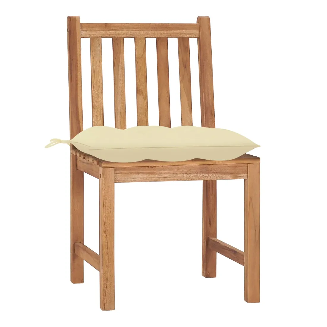 Cet ensemble de chaises de jardin en bois robuste sera un endroit idéal pour vous détendre et profiter du soleil dans votre jardin ou patio. Fabriquée en bois dur de teck extrêmement durable, cette pièce de meuble en teck a été chevronnée, séchée au four puis finement poncée pour lui donner un aspect très lisse. Le bois de teck est connu pour sa résistance exceptionnelle aux intempéries, ce qui le rend bien plus adapté aux meubles de jardin que tout autre type de bois. Le bois de teck est le choix idéal si vous souhaitez acheter un meuble de jardin durable. Une belle finition à base d’eau est appliquée pour donner au bois une couleur chaude. Les chaises d’extérieur stables disposent d’un aspect raffiné qui peut instantanément se fondre dans n’importe quel espace de vie. Le coussin inclus est pratique et a une fonction décorative. Remarque : Afin de prolonger la durée de vie de vos meubles d'extérieur, nous vous recommandons de les nettoyer régulièrement et de ne pas les laisser à l'extérieur sans protection inutilement.Nettoyage : Utiliser une solution savonneuse douceStockage : Si possible, stockez dans un endroit frais et sec à l'intérieur. Si le produit est stocké à l'extérieur, protégez-le avec une housse imperméable. Essuyez et séchez l'excès d'eau ou de neige des surfaces planes après la pluie ou une chute de neige. Permettez une circulation d'air suffisante afin d'éviter les dommages liés à l'humidité.