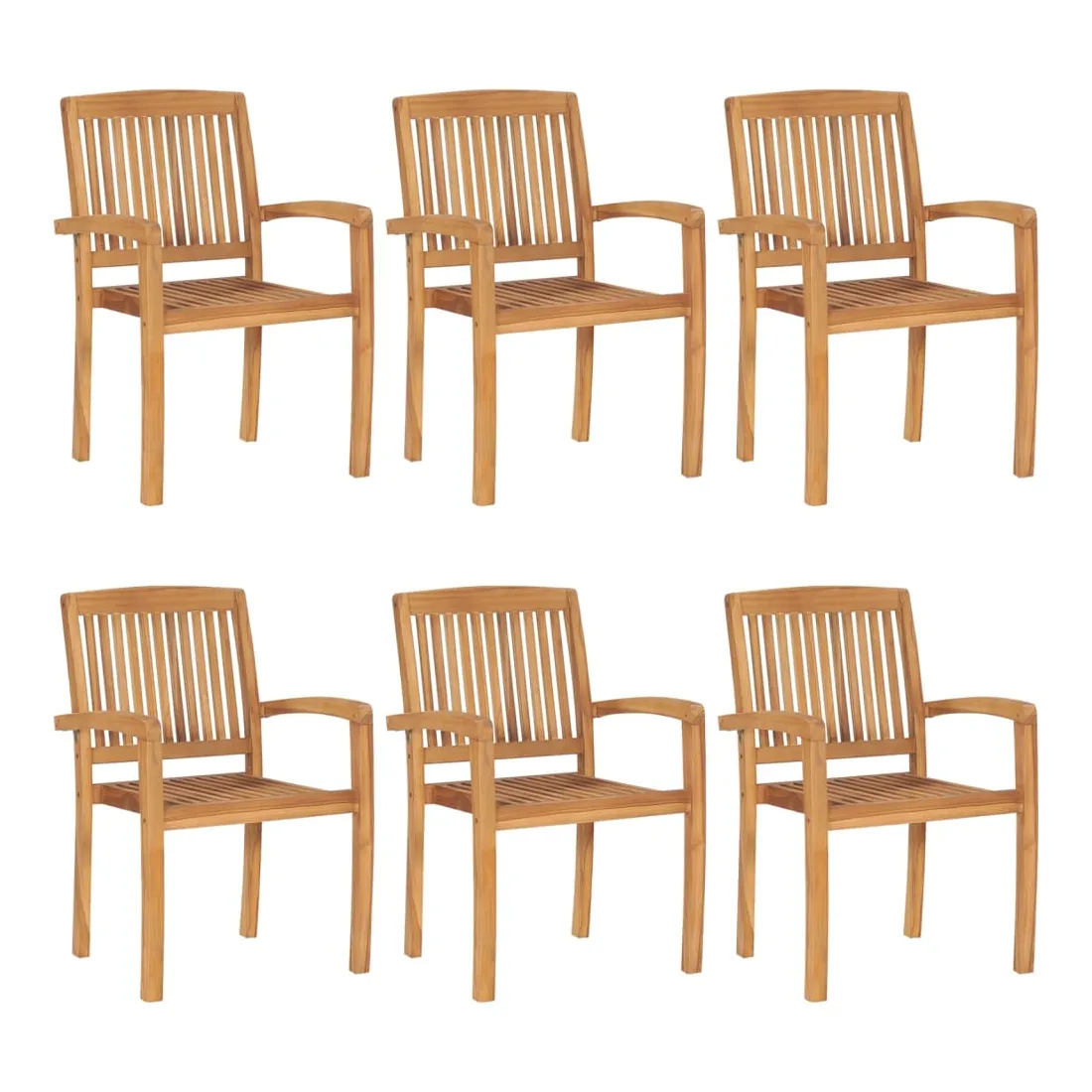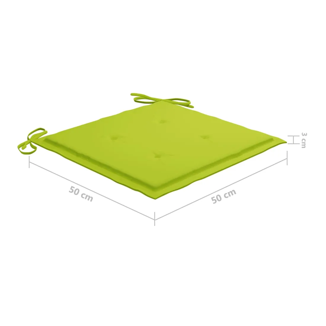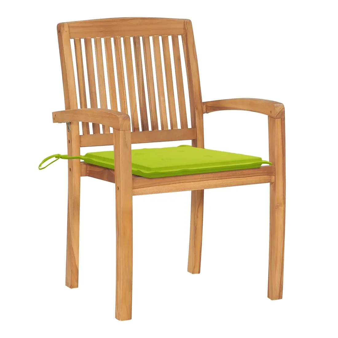 Ajoutez une touche de charme rustique à votre salle à manger, jardin ou terrasse avec cet ensemble de chaises de jardin empilables avec ensemble de coussins ! La chaise de salle à manger élève votre espace de vie intérieur ou extérieur à un niveau supérieur avec un design à lattes et élégant. Cet ensemble de meubles en teck est fabriqué à partir de bois dur de teck extrêmement durable et est chevronné, séché au four et poncé finement pour lui donner un aspect très lisse. Le bois de teck est connu pour sa solidité et sa résistance aux intempéries exceptionnelles, ce qui le rend bien plus adapté aux meubles de jardin que tout autre type de bois. Le bois de teck est le choix parfait si vous souhaitez acheter un meuble de jardin durable. Il est facile à entretenir et à nettoyer avec un chiffon humide. De plus, la chaise de salle à manger peut être empilée pour économiser de l'espace de stockage lorsqu'elle n'est pas utilisée. De plus, les coussins inclus offrent un confort supplémentaire. Chaque coussin a 2 jeux de cordes pour le fixer fermement sur la chaise. Remarque : afin de prolonger la durée de vie de vos meubles d'extérieur, nous vous recommandons de les nettoyer régulièrement et de ne pas les laisser à l'extérieur sans protection inutilement.Nettoyage : utiliser une solution savonneuse douceStockage : si possible, stockez dans un endroit frais et sec à l'intérieur. Si le produit est stocké à l'extérieur, protégez-le avec une housse imperméable. Essuyez et séchez l'excès d'eau ou de neige des surfaces planes après la pluie ou une chute de neige. Permettez une circulation d'air suffisante afin d'éviter les dommages liés à l'humidité.