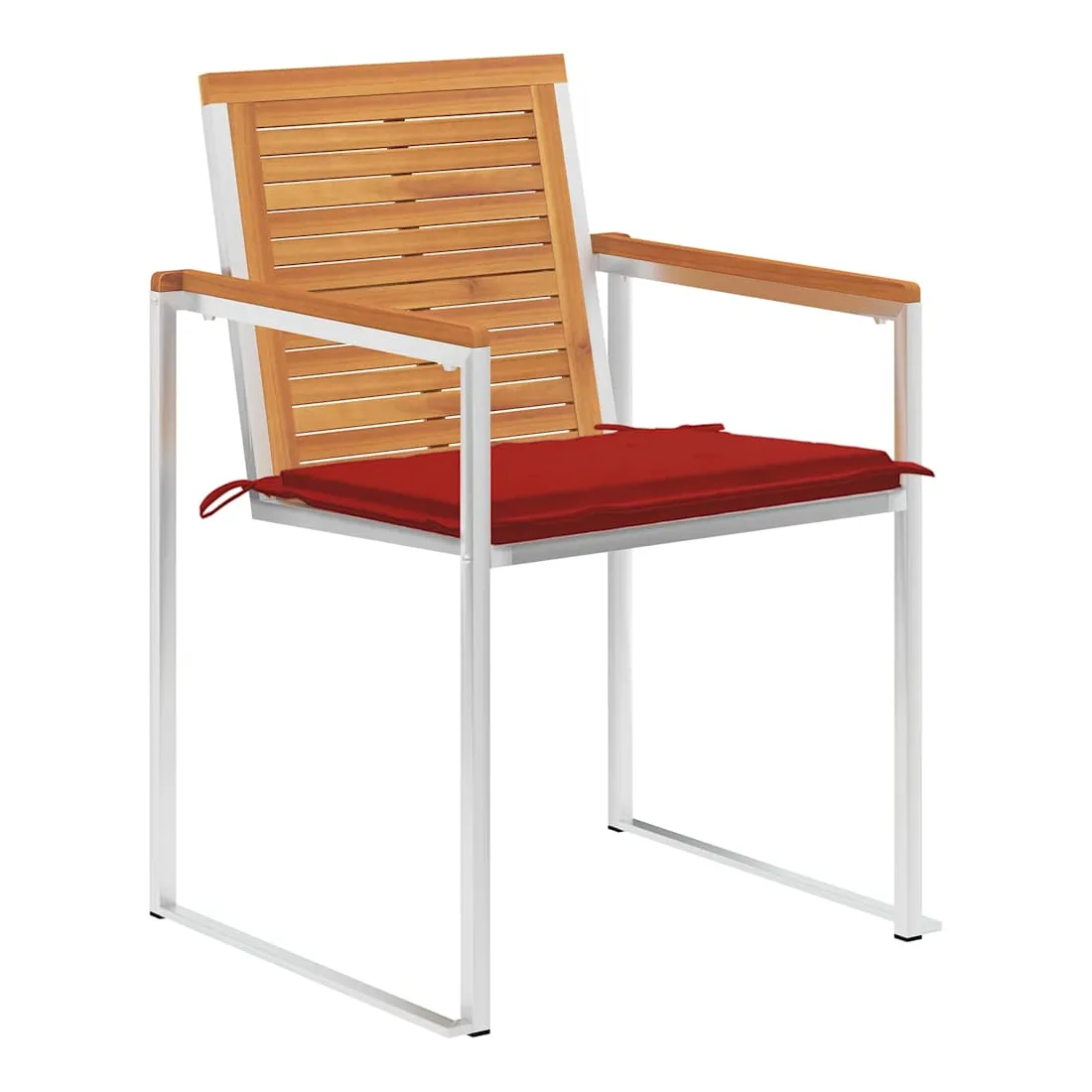 Ces chaises de jardin en bois sont conçues pour devenir le point de mire de votre jardin ou de votre patio. Les chaises de salle à manger sont fabriquées en bois d'acacia massif et en acier inoxydable de haute qualité, ce qui les rend très durables, résistantes à la rouille, robustes et faciles à nettoyer avec un chiffon humide. Le coussin inclus est plus qu'un supplément pratique, il a également une fonction décorative. Asseyez-vous pour un délicieux dîner en plein air ou détendez-vous et profitez du beau temps avec cet ensemble classique de chaises de jardin. Remarque : afin de prolonger la durée de vie de vos meubles d'extérieur, nous vous recommandons de les nettoyer régulièrement et de ne pas les laisser à l'extérieur sans protection inutilement.Nettoyage : Utiliser une solution savonneuse douce.Stockage : si possible, stockez dans un endroit frais et sec à l'intérieur. Si le produit est stocké à l'extérieur, protégez-le avec une housse imperméable. Essuyez et séchez l'excès d'eau ou de neige des surfaces planes après la pluie ou une chute de neige. Permettez une circulation d'air suffisante afin d'éviter les dommages liés à l'humidité.