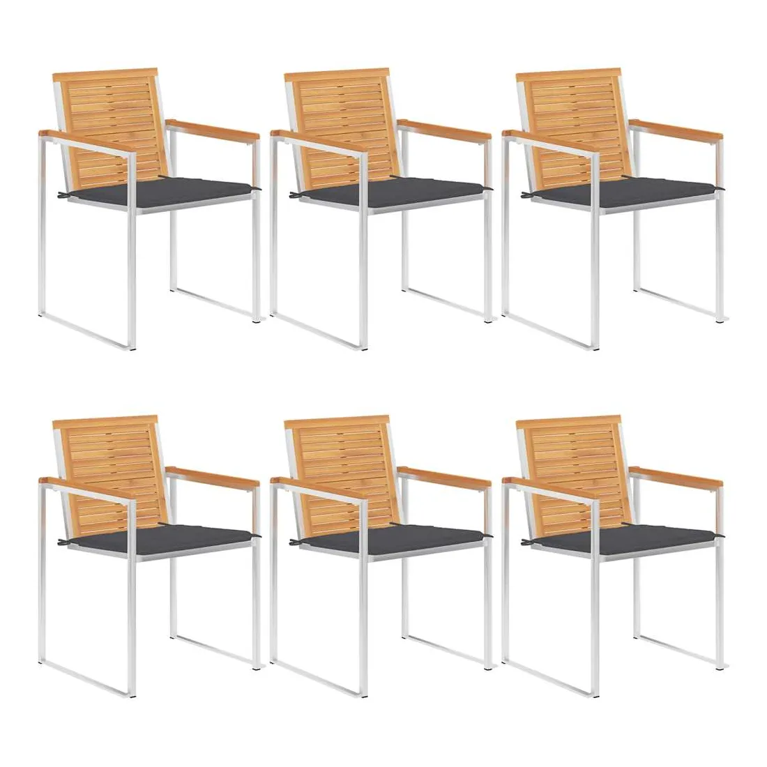 Ces chaises de jardin en bois sont conçues pour devenir le point de mire de votre jardin ou de votre patio. Construite à partir de bois dur de teck extrêmement durable, cette pièce de mobilier en boit de teck a été chevronnée, séchée au four puis poncée finement pour donner un aspect très lisse. Le bois de teck est connu pour sa solidité et sa résistance aux intempéries exceptionnelles, ce qui le rend bien plus adapté aux meubles de jardin que tout autre type de bois. Le bois de teck est le choix parfait si vous souhaitez acheter un meuble de jardin durable. Le cadre en acier inoxydable de haute qualité les rend également très durables, résistantes à la rouille et robustes. Le coussin inclus est plus qu'un supplément pratique ; il a une fonction décorative aussi. Asseyez-vous pour un délicieux dîner en plein air ou détendez-vous simplement et profitez du beau temps sur cet ensemble de chaises de jardin classique. Remarque : afin de prolonger la durée de vie de vos meubles d'extérieur, nous vous recommandons de les nettoyer régulièrement et de ne pas les laisser à l'extérieur sans protection inutilement.Nettoyage : Utiliser une solution savonneuse douce.Stockage : si possible, stockez dans un endroit frais et sec à l'intérieur. Si le produit est stocké à l'extérieur, protégez-le avec une housse imperméable. Essuyez et séchez l'excès d'eau ou de neige des surfaces planes après la pluie ou une chute de neige. Permettez une circulation d'air suffisante afin d'éviter les dommages liés à l'humidité.