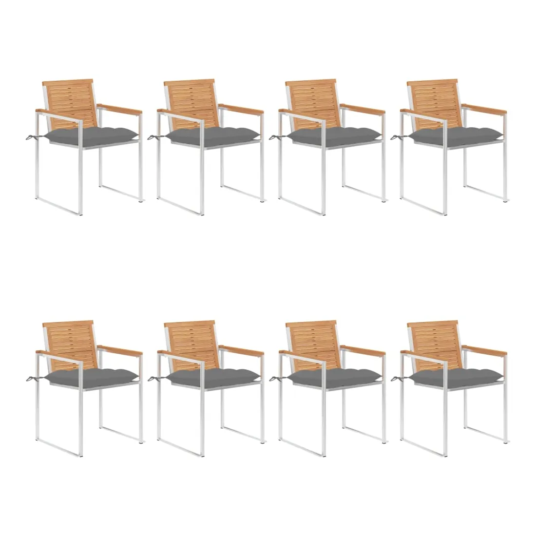 Ces chaises de jardin en bois sont conçues pour devenir le point de mire de votre jardin ou de votre patio. Construite à partir de bois dur de teck extrêmement durable, cette pièce de mobilier en boit de teck a été chevronnée, séchée au four puis poncée finement pour donner un aspect très lisse. Le bois de teck est connu pour sa solidité et sa résistance aux intempéries exceptionnelles, ce qui le rend bien plus adapté aux meubles de jardin que tout autre type de bois. Le bois de teck est le choix parfait si vous souhaitez acheter un meuble de jardin durable. Le cadre en acier inoxydable de haute qualité les rend également très durables, résistantes à la rouille et robustes. Le coussin inclus est plus qu'un supplément pratique ; il a une fonction décorative aussi. Asseyez-vous pour un délicieux dîner en plein air ou détendez-vous simplement et profitez du beau temps sur cet ensemble de chaises de jardin classique. Remarque : afin de prolonger la durée de vie de vos meubles d'extérieur, nous vous recommandons de les nettoyer régulièrement et de ne pas les laisser à l'extérieur sans protection inutilement.Nettoyage : Utiliser une solution savonneuse douce.Stockage : si possible, stockez dans un endroit frais et sec à l'intérieur. Si le produit est stocké à l'extérieur, protégez-le avec une housse imperméable. Essuyez et séchez l'excès d'eau ou de neige des surfaces planes après la pluie ou une chute de neige. Permettez une circulation d'air suffisante afin d'éviter les dommages liés à l'humidité.