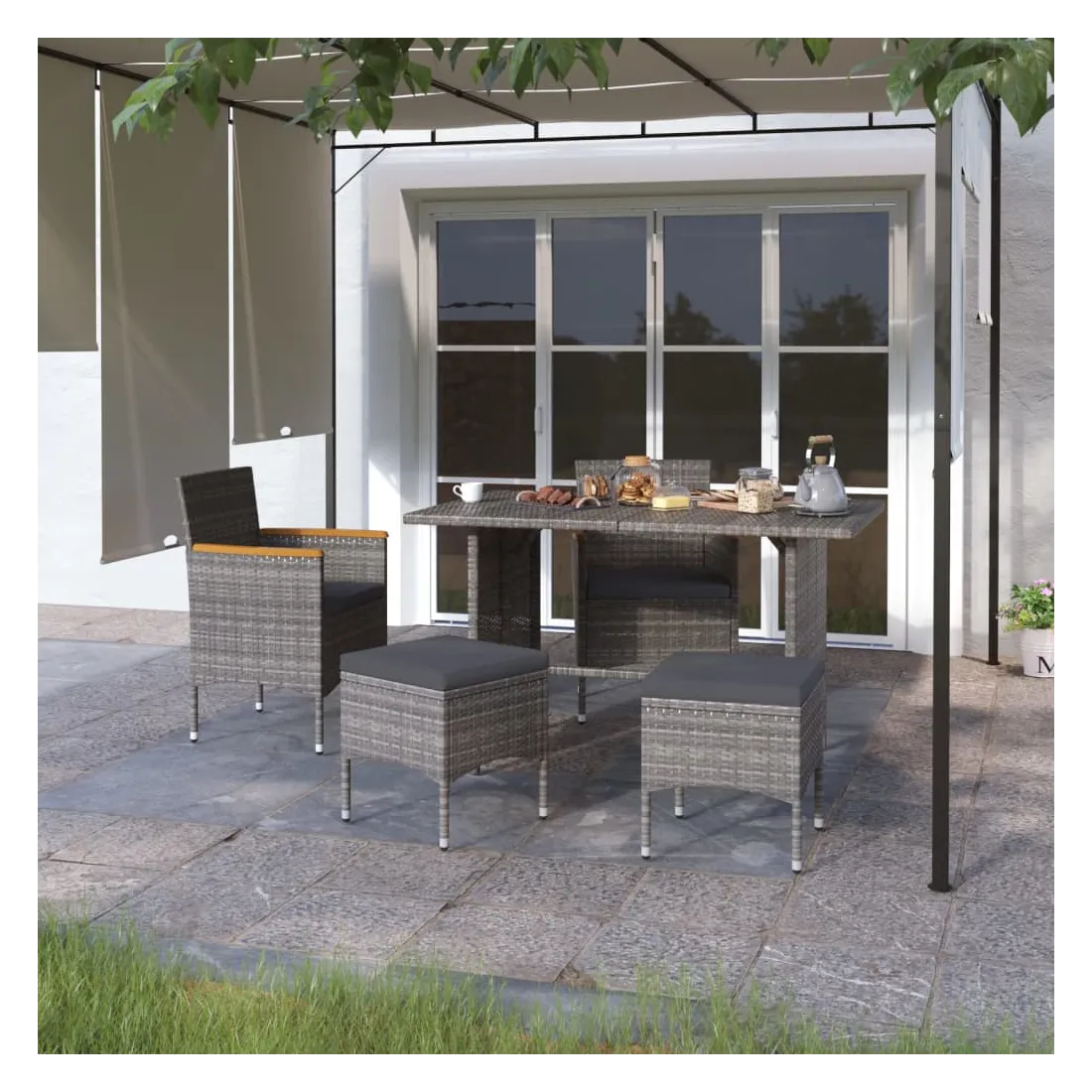 Cet ensemble de 4 chaises et tabourets de jardin complète parfaitement votre jardin, terrasse et espace de vie extérieur. Les meubles de jardin sont fabriqués à partir d’un solide cadre en acier enduit de poudre, ce qui la rend robuste et stable pour des années de détente. L'ensemble de chaises et de tabourets d'extérieur recouvert de résine tressée est facile à nettoyer avec un chiffon humide et convient à une utilisation quotidienne à l’extérieur. De plus, le coussin d'assise bien rembourré ajoute un confort supplémentaire à la chaise. Remarque : afin de prolonger la durée de vie de vos meubles d'extérieur, nous vous recommandons de les nettoyer régulièrement et de ne pas les laisser à l'extérieur sans protection inutilement.Nettoyage : Utiliser une solution savonneuse douce.Stockage : si possible, stockez dans un endroit frais et sec à l'intérieur. Si le produit est stocké à l'extérieur, protégez-le avec une housse imperméable. Essuyez et séchez l'excès d'eau ou de neige des surfaces planes après la pluie ou une chute de neige. Permettez une circulation d'air suffisante afin d'éviter les dommages liés à l'humidité.