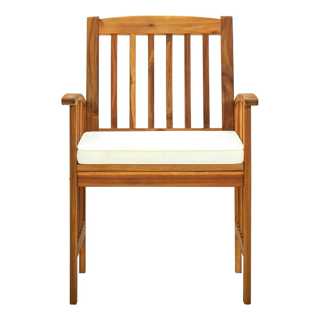 Asseyez-vous pour un dîner en plein air ou détendez-vous et profitez du beau temps sur ces chaises en bois de salle à manger de jardin. Ces chaises de jardin sont fabriquées en bois d'acacia massif, un bois dur tropical, résistant aux intempéries et durable. La surface finie à l'huile est facile à nettoyer avec un chiffon humide. La conception à lattes apportera un charme rustique. De plus, les coussins inclus offrent du confort supplémentaire lors de l'assise. Remarque: Afin de prolonger la durée de vie de vos meubles d'extérieur, nous vous recommandons de les nettoyer régulièrement et de ne pas les laisser à l'extérieur sans protection inutilement.Nettoyage: Utiliser une solution savonneuse douce.Stockage: Si possible, stockez dans un endroit frais et sec à l'intérieur. Si le produit est stocké à l'extérieur, protégez-le avec une housse imperméable. Essuyez et séchez l'excès d'eau ou de neige des surfaces planes après la pluie ou une chute de neige. Permettez une circulation d'air suffisante afin d'éviter les dommages liés à l'humidité.