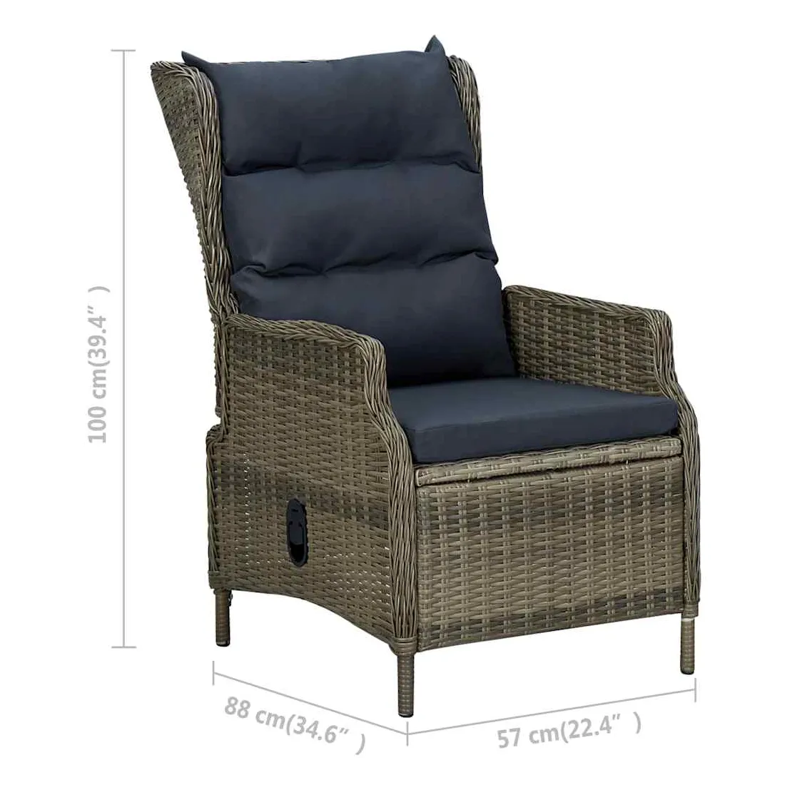 Profitez d’un confort d’assise maximal sur cette confortable chaise inclinable de jardin avec coussins ! Stable et durable : cette chaise inclinable d’extérieur, dotée d’un cadre en acier enduit de poudre recouvert de résine tressée ronde, est robuste et facile à nettoyer.Coussins confortables : les coussins bien rembourrés ajoutent un confort supplémentaire lors de votre temps de détente. La housse de coussin est équipée d’une fermeture éclair, amovible et lavable.Dossier réglable : grâce au mécanisme de levage à gaz, le dossier est également réglable pour s’adapter à vos positions. En appuyant sur le bouton sur le côté, le dossier peut s’incliner, pour une position couchée confortable.Facile à déplacer : de plus, la chaise de jardin est facile à déplacer grâce à sa construction légère. Bon à savoir :Pour que vos meubles d'extérieur restent beaux, nous vous recommandons de les protéger avec une housse imperméable.