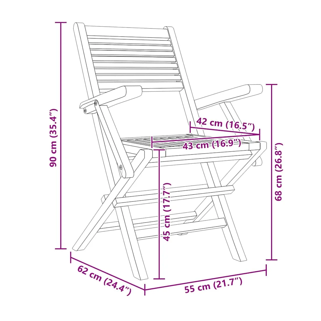 Profitez d'un moment de détente agréable avec votre famille et vos amis dans votre espace extérieur sur ces chaises de jardin pliantes en bois ! Bois de teck massif : le bois de teck massif est un matériau naturel magnifique. Il a été chevronné, séché au four, puis sablé finement pour lui donner une apparence très lisse. Le bois de teck est connu pour sa résistance exceptionnelle et sa résistance aux intempéries.Fonction pliable : la chaise de jardin peut être pliée pour gagner de la place lorsqu'elle n'est pas utilisée.Expérience confortable : le dossier et les accoudoirs des sièges de jardin vous offrent un excellent soutien, offrant une expérience confortable optimale.Design à lattes : la chaise d'extérieur au design à lattes est simple et intemporelle. Remarque :Pour que vos meubles d'extérieur restent beaux, nous vous recommandons de les protéger avec une housse imperméable.Bon à savoir :Pour faciliter au maximum le montage, chaque produit est livré avec des instructions.