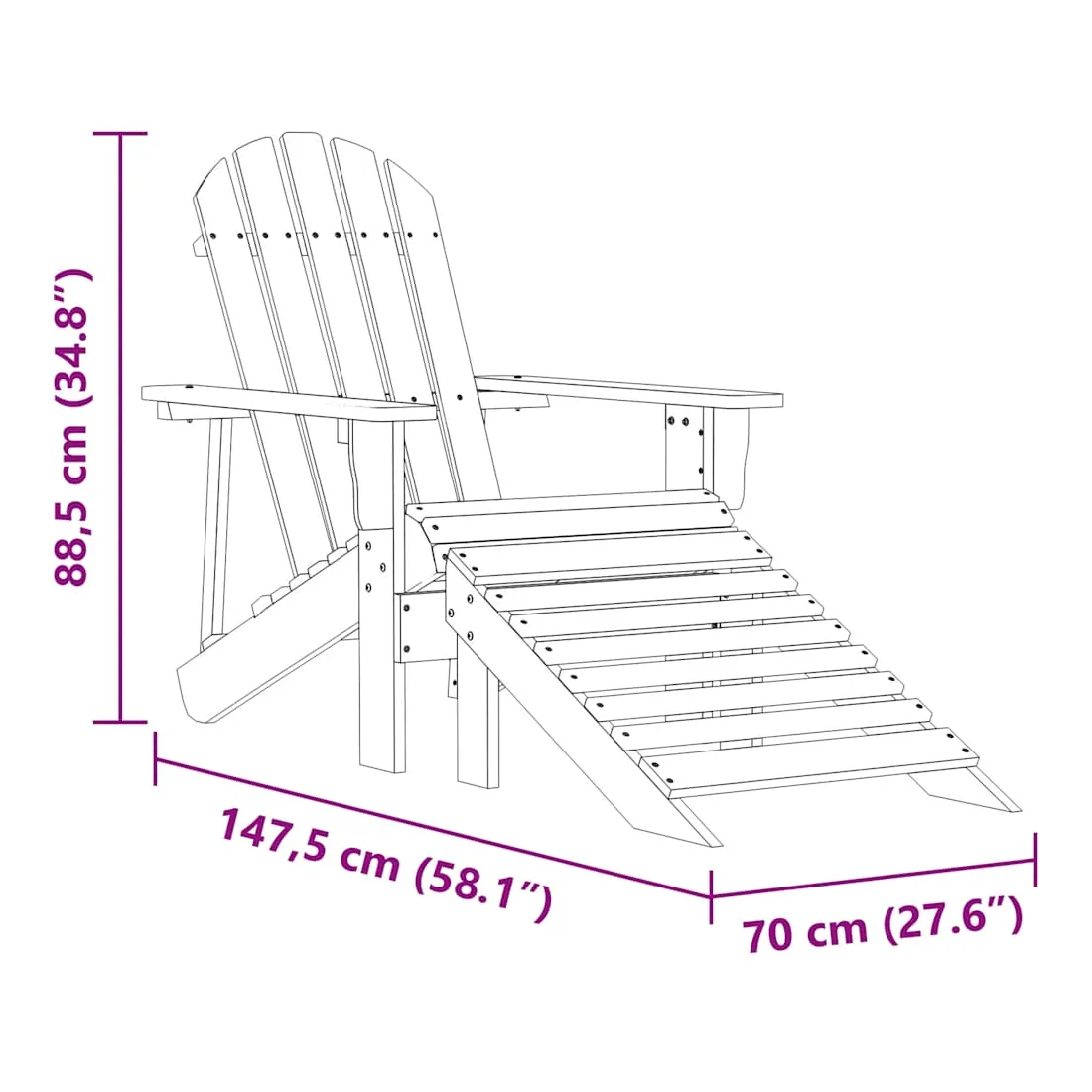 Détendez-vous dans le jardin ou sur la terrasse dans cette chaise Adirondack tendance et confortable avec pouf ! Cette chaise de jardin, fabriquée à partir de bois de sapin massif, dispose d'un cadre robuste et est stable, ce qui la rend facile à entretenir et résistante aux intempéries. La structure de conception ergonomique assure également un confort optimal. De plus, le pouf est détachable et peut fournir un soutien supplémentaire pour vos pieds. Avec un design élégant et intemporel, ce sera un supplément pratique et classique à votre espace de vie extérieur. Remarque : afin de prolonger la durée de vie des meubles d'extérieur, nous vous recommandons de les protéger avec une housse imperméable.