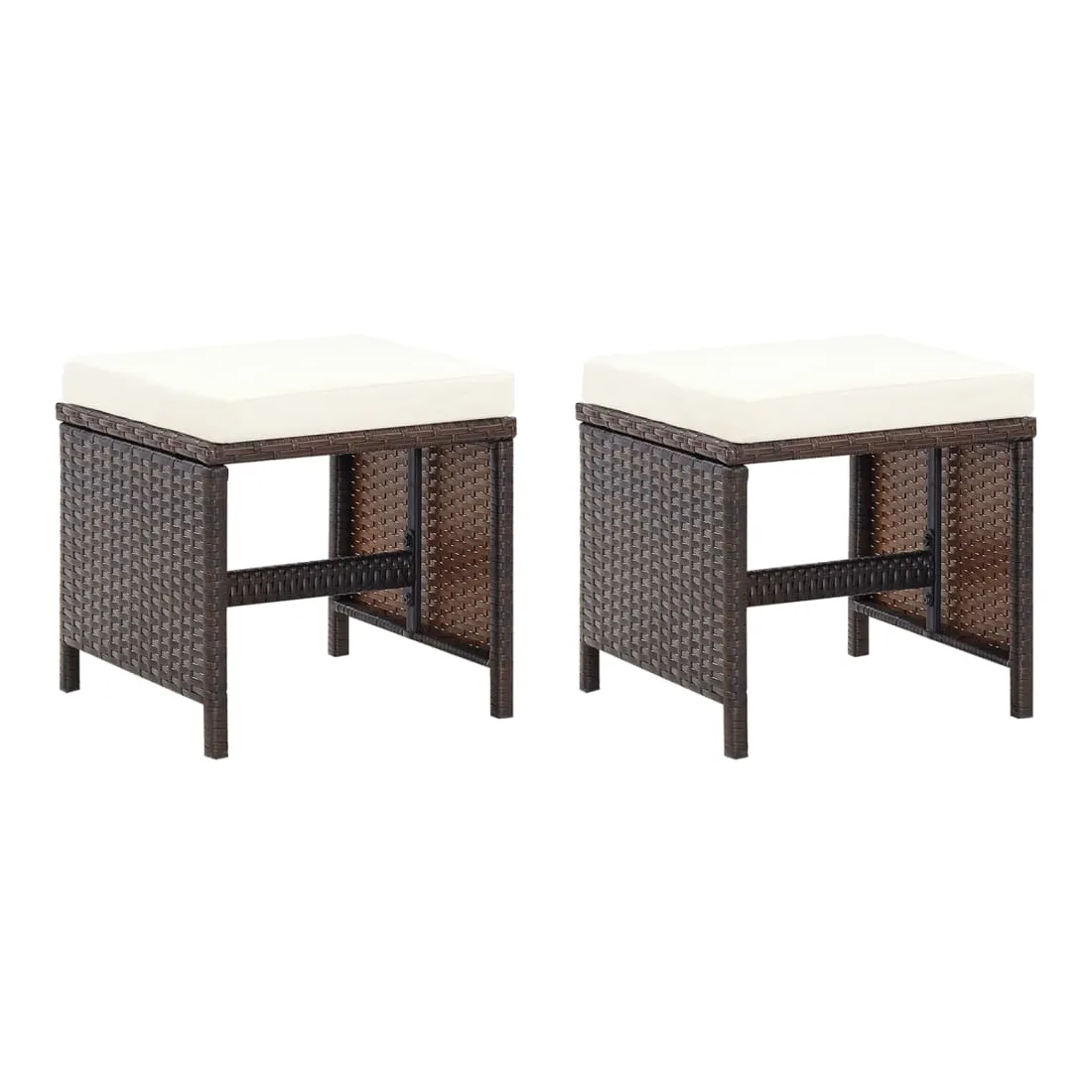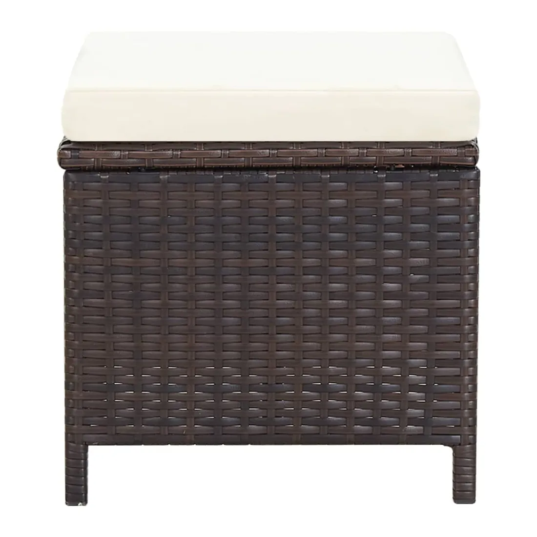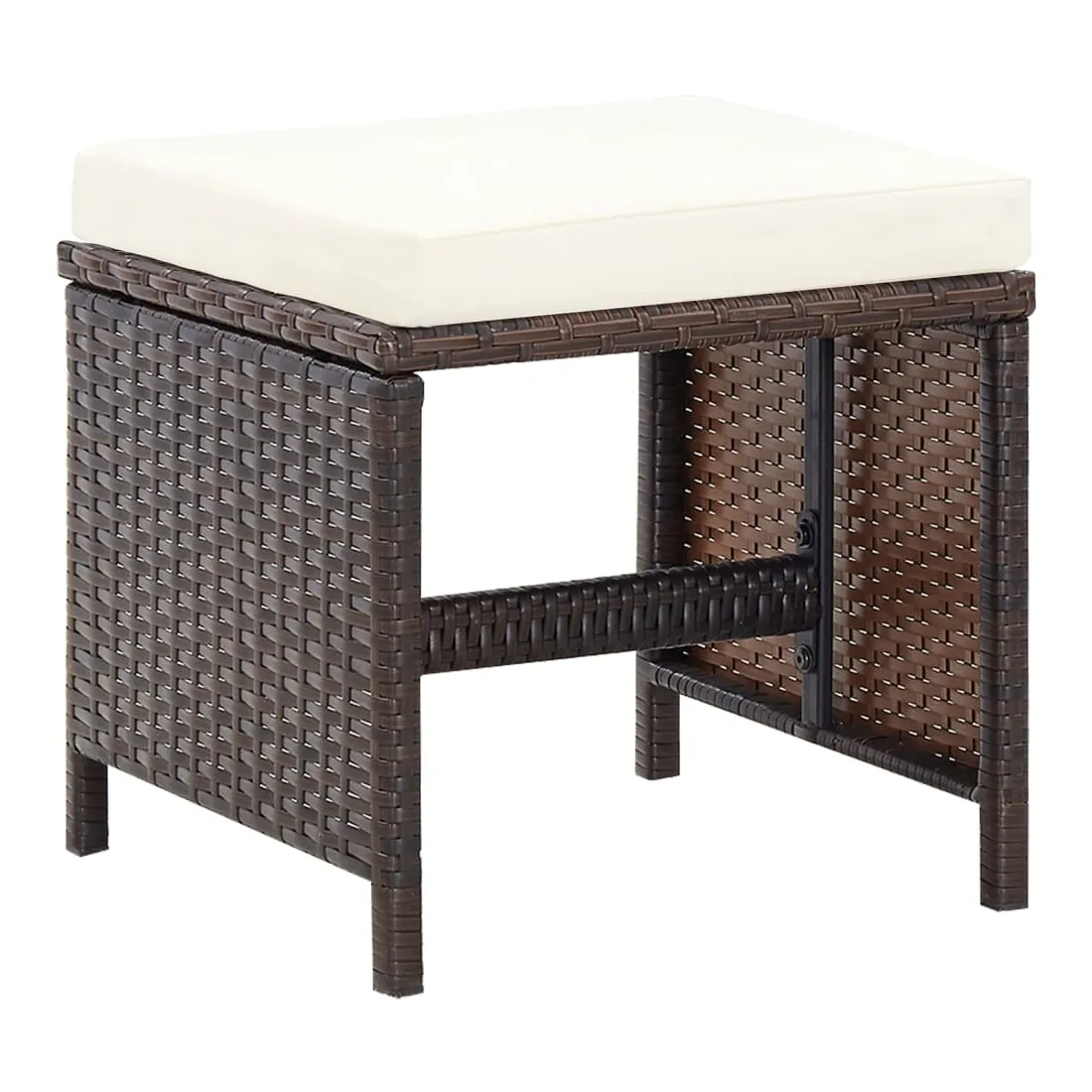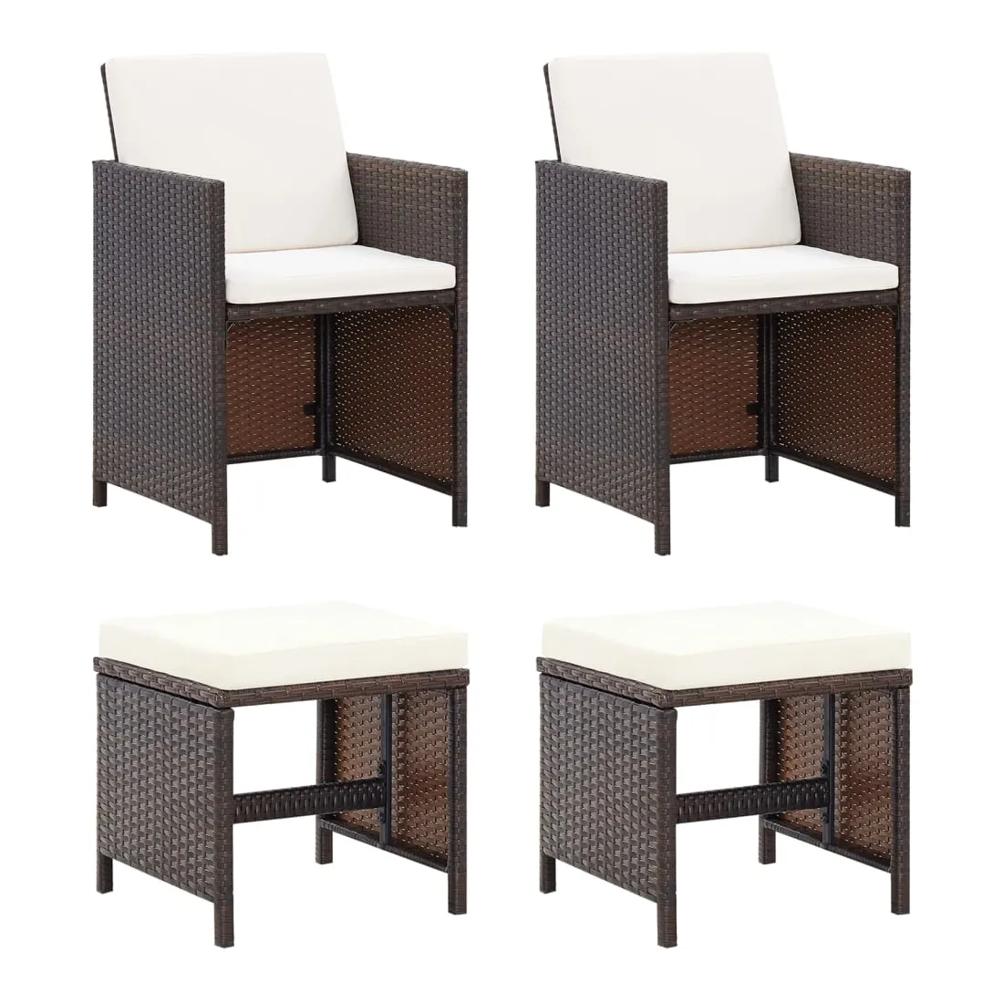 Cet ensemble de 4 chaises et tabourets de jardin complète parfaitement votre jardin, terrasse et espace de vie extérieur. Avec un cadre en acier robuste enveloppé de résine tressée résistante aux intempéries, l'ensemble de chaises et tabourets d'extérieur est résistant à la rouille et à la moisissure, offrant des années de détente de qualité. La chaise de patio est conçue avec un dossier et un accoudoir pour un confort maximal. Le coussin de siège et le coussin de dossier inclus offrent un soutien supplémentaire pendant l'assise. Remarque : afin de prolonger la durée de vie de vos meubles d'extérieur, nous vous recommandons de les nettoyer régulièrement et de ne pas les laisser à l'extérieur sans protection inutilement.Nettoyage : Utiliser une solution savonneuse douce.Stockage : si possible, stockez dans un endroit frais et sec à l'intérieur. Si le produit est stocké à l'extérieur, protégez-le avec une housse imperméable. Essuyez et séchez l'excès d'eau ou de neige des surfaces planes après la pluie ou une chute de neige. Permettez une circulation d'air suffisante afin d'éviter les dommages liés à l'humidité.