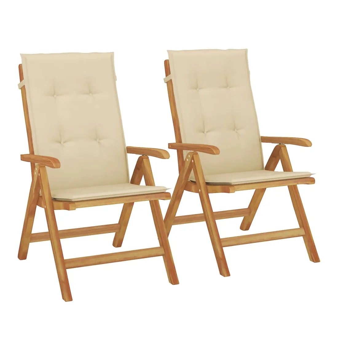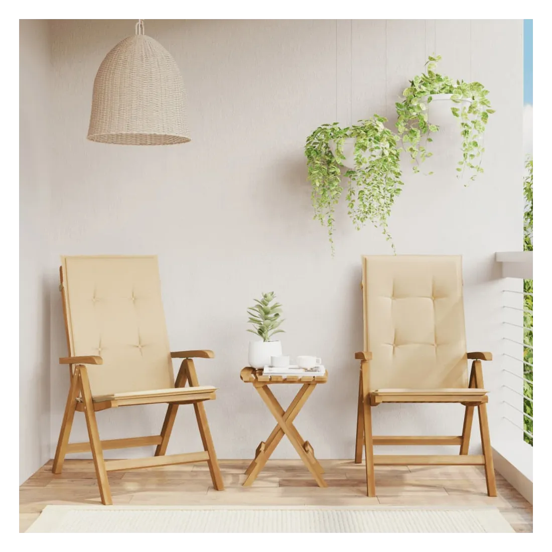 Améliorez le confort de votre espace extérieur avec ces chaises de jardin en bois classiques. Elles sont idéales pour discuter en famille et entre amis ou simplement pour profiter du bain de soleil ! Bois de teck massif : le bois de teck massif est un matériau naturel magnifique. Il a été chevronné, séché au four, puis sablé finement pour lui donner une apparence très lisse. Le bois de teck est connu pour sa résistance exceptionnelle et sa résistance aux intempéries.Dossier réglable : les dossiers des chaises de jardin sont réglables en 6 positions afin que vous puissiez toujours trouver la position la plus confortable.Fonction pliable : la chaise de jardin est pliable, ce qui vous permet de la replier pour gagner de la place lorsque vous ne l'utilisez pas.Assise confortable : la chaise d'extérieur, avec son assise à lattes, ses accoudoirs et son dossier incurvés, s'adapte à votre corps et vous offre un confort optimal. De plus, le coussin moelleux offre un confort d'assise optimal.Coussin antidérapant : des cordes bien conçues et une sangle arrière élastique permettent de fixer facilement le coussin à la chaise et de le maintenir proprement et en toute sécurité. Bon à savoir :Pour que vos meubles d'extérieur restent beaux, nous vous recommandons de les protéger avec une housse imperméable.