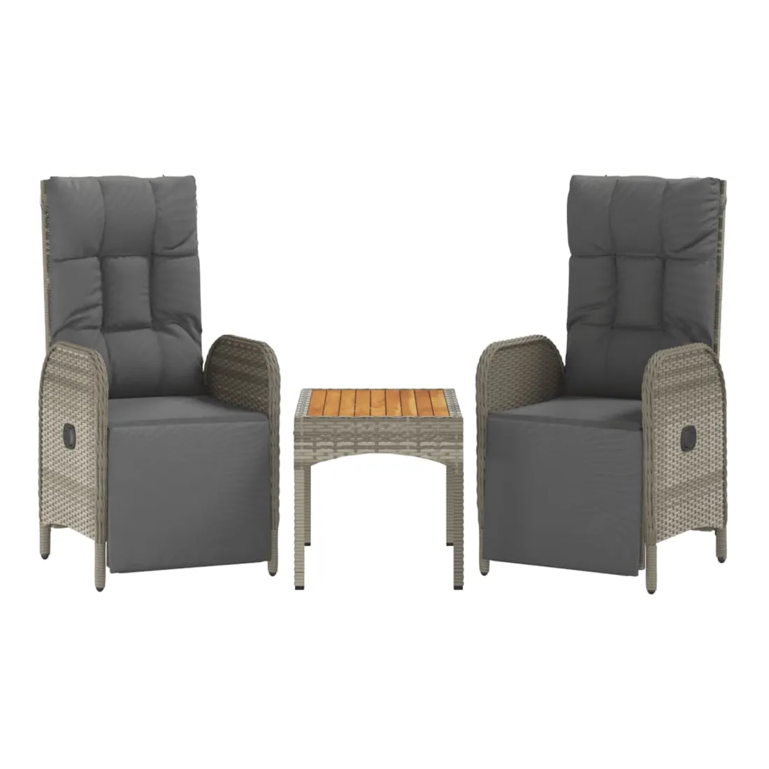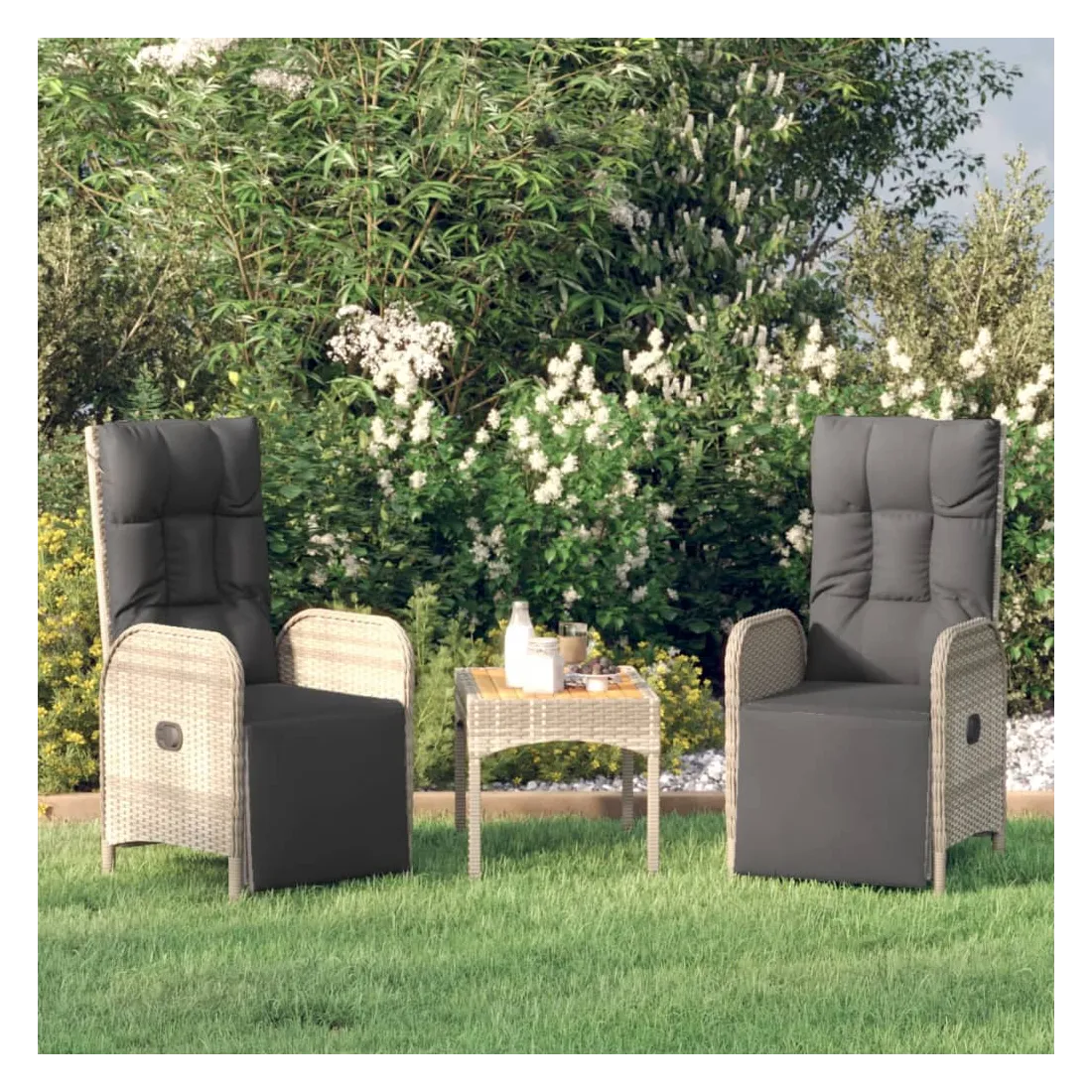 Ces chaises inclinables de jardin avec une table sont un complément parfait à votre jardin et à votre terrasse, créant une impression durable ! Matériau haut de gamme : la résine tressée est un matériau de résistance exceptionnelle et durable dans différentes conditions météorologiques.Table pratique : la table de jardin avec un dessus de table en bois d'acacia massif est parfait pour placer des boissons, des aliments et des décorations. Il a une belle apparence et est facile à nettoyer.Fonction d'inclinaison : les chaises de jardin sont spécialement conçues avec une fonction d'inclinaison afin que vous puissiez régler le dossier et le repose-pied selon votre confort.Expérience d'assise confortable : des coussins supplémentaires sont inclus pour votre confort. Le coussin d'assise et le coussin de dossier peuvent être reliés par une fermeture éclair pour plus de commodité. Remarque :Afin de prolonger la durée de vie de votre mobilier d'extérieur, nous vous recommandons de le protéger avec une housse imperméable.Chaque produit est livré avec un manuel de montage dans la boîte pour un montage facile.