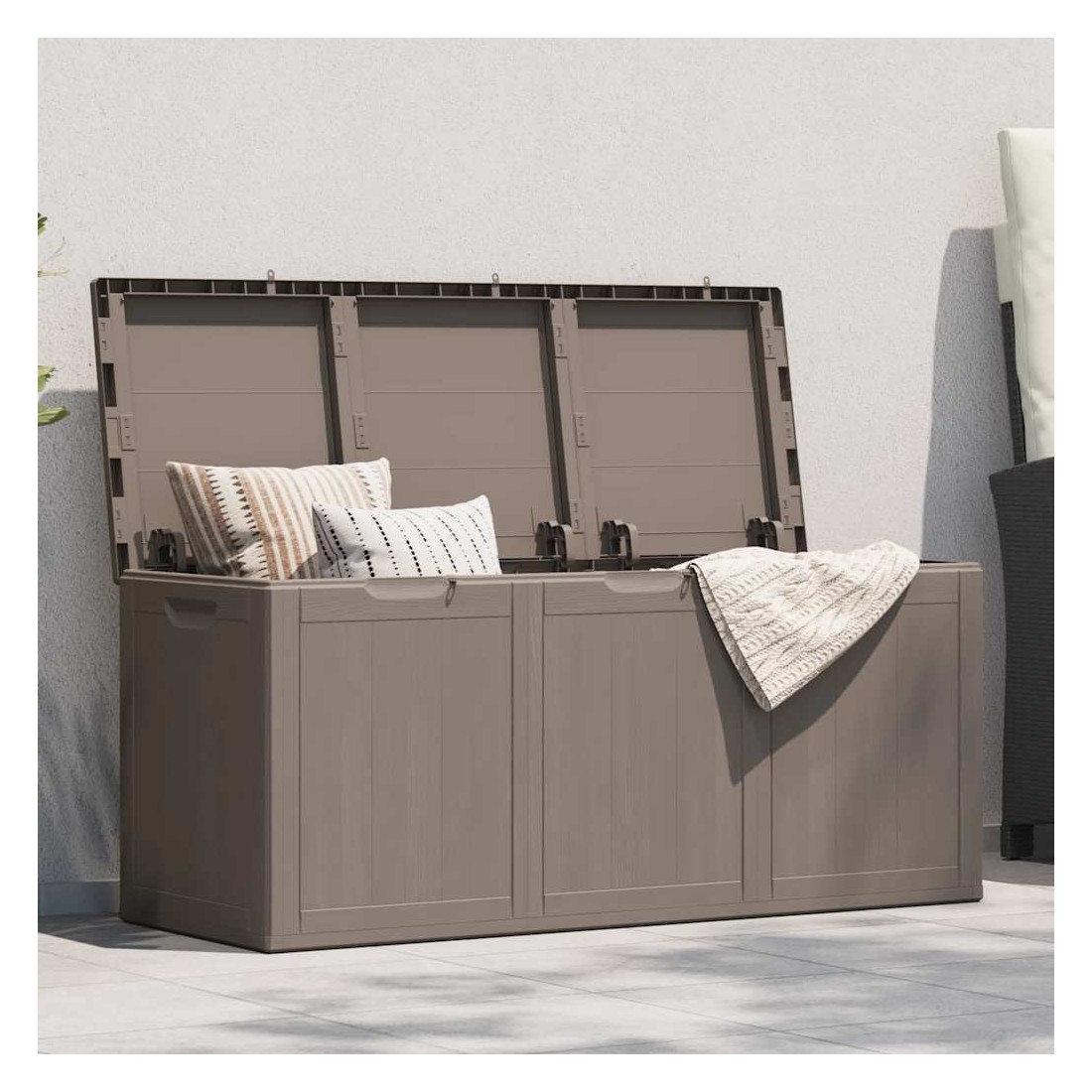 Cette boîte de rangement simple est une excellente solution pour désencombrer votre jardin, patio ou terrasse. Le coffre de rangement est fabriqué en matériau 100 % PP, ce qui le rend résistant aux intempéries, aux UV, léger et facile à déplacer. La boîte de rangement de jardin présente un design discret mais intemporel et s'intègre parfaitement à votre décor intérieur et extérieur. De plus, la boîte de rangement de jardin offre un grand espace de rangement pour les coussins, les oreillers et autres articles de ménage ou de jardin à portée de main. Remarque : afin de prolonger la durée de vie des meubles d'extérieur, nous vous recommandons de les protéger avec une housse imperméable.