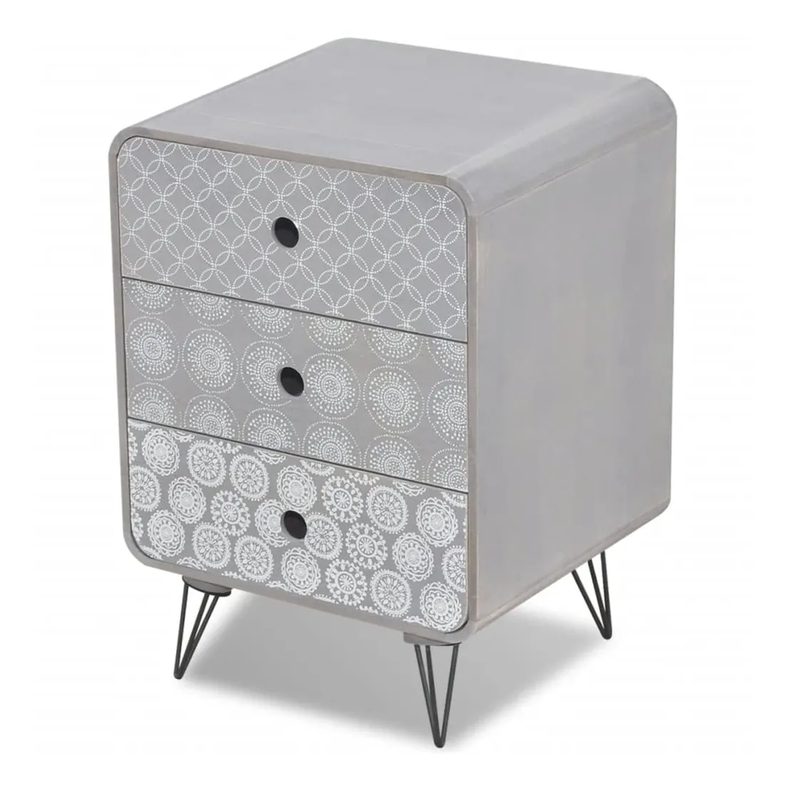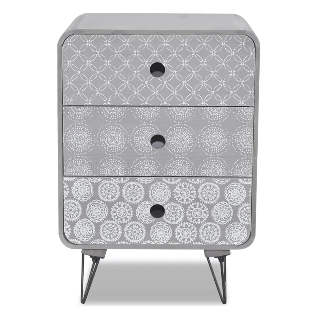 Cette armoire latérale avec 3 tiroirs a un design sobre mais élégant avec des motifs décoratifs élégants et elle peut être utilisée comme une armoire de chevet ou un support téléphonique. Cette table de chevet sera un ajout pratique et très décoratif à votre chambre à coucher ou salon. Le dessus de table grand est idéal pour exposer des objets décoratifs, des cadres photo ou même des plantes en pot, tandis que le 3 tiroirs offre suffisamment d'espace pour ranger toutes sortes de petits objets et à portée de main. Grâce au matériau MDF de haute qualité et aux solides jambes en acier, cette table de chevet est très robuste et durable. L'assemblage est vraiment simple.