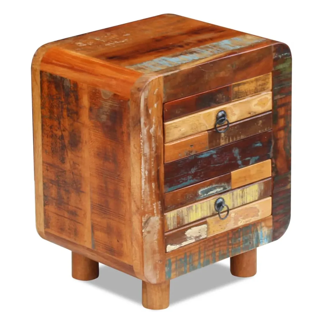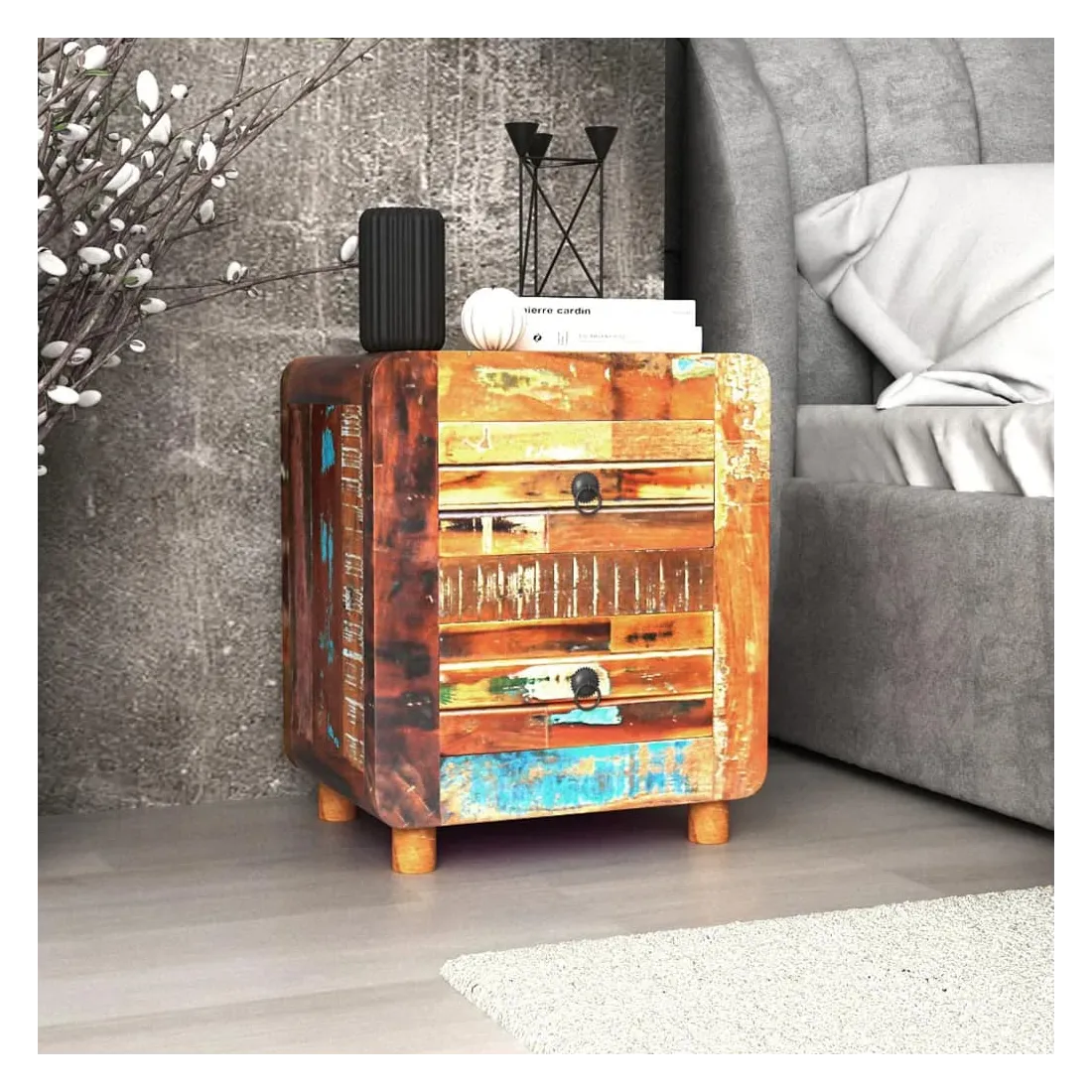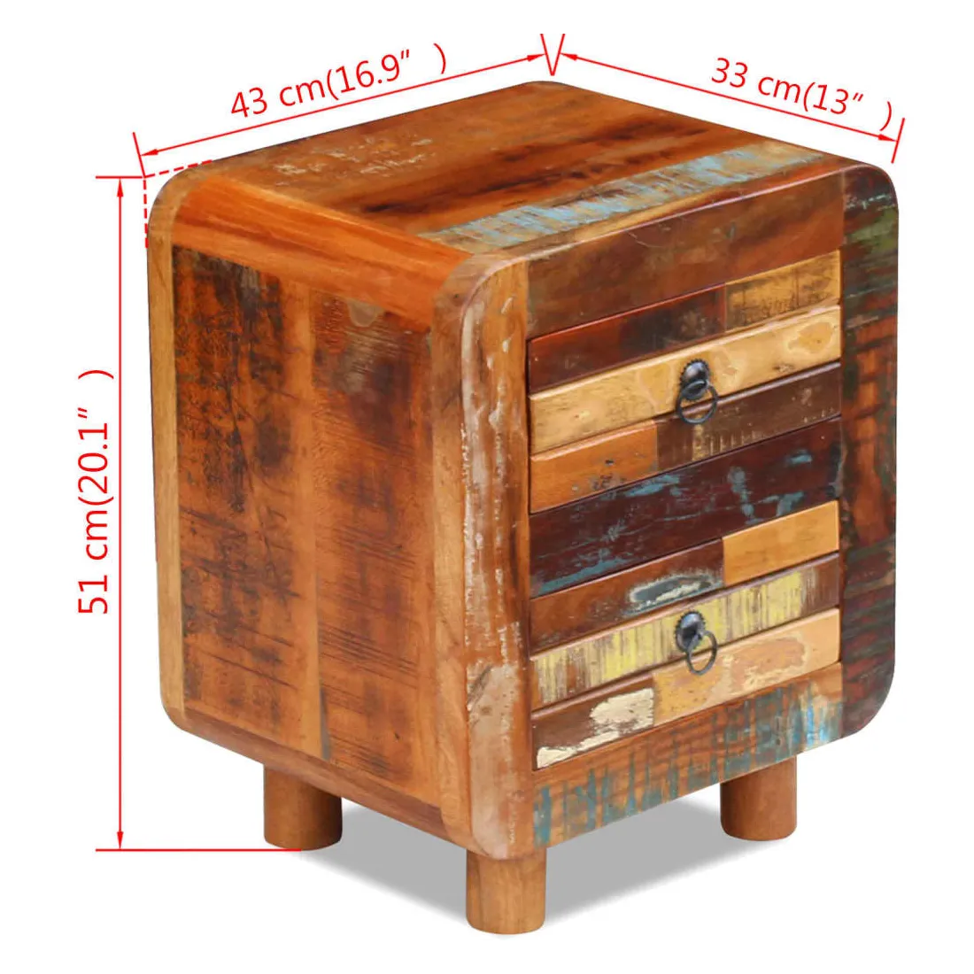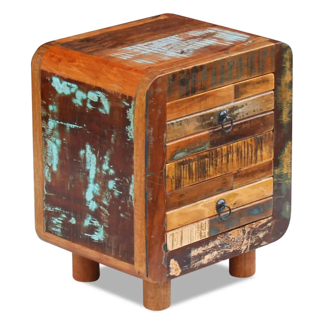 Cette table de chevet en bois de style antique sera un supplément unique à votre pièce. Sa construction en bois massif la rend stable et adaptée pour y poser des verres, ou des objets décoratifs. Dotée de deux tiroirs, elle peut contenir beaucoup de choses. Elle peut également être utilisée comme table de chevet, commode ou table auxiliaire. Faite en bois de récupération, cette armoire est solide, durable et magnifique, et possède les caractéristiques de plusieurs bois tel que le teck, le manguier, l'acacia, le bois recyclé, le bois dur, etc. Chaque meuble est unique et légèrement différent l'un de l'autre. Les traces d'usure et la structure du grain visible donnent à chaque meuble sa propre histoire et un aspect unique. Cette table de nuit est entièrement faite à la main. Chaque étape du processus est effectuée avec le plus grand soin, qu'il s'agisse du polissage, de la peinture ou du cirage. Remarque importante : les couleurs peuvent varier d'une pièce à l'autre, rendant chacune de nos armoires unique. La livraison est aléatoire, garantissant l'exclusivité et l'individualité de votre produit.
