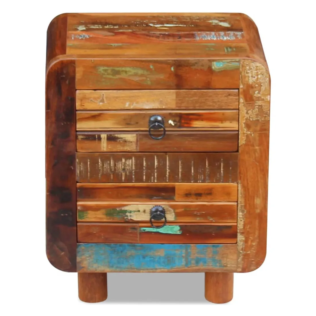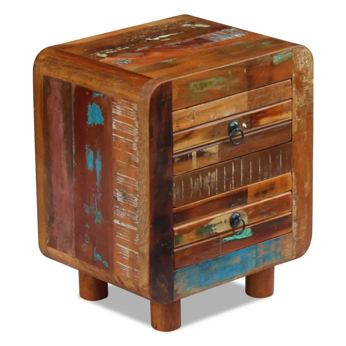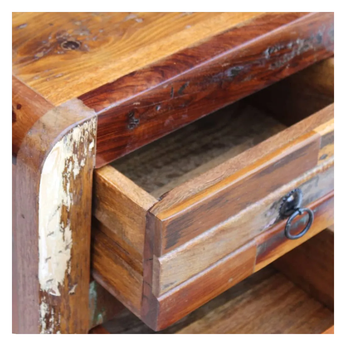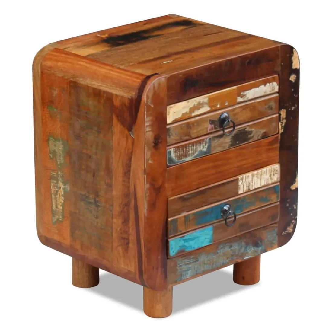 Cette table de chevet en bois de style antique sera un supplément unique à votre pièce. Sa construction en bois massif la rend stable et adaptée pour y poser des verres, ou des objets décoratifs. Dotée de deux tiroirs, elle peut contenir beaucoup de choses. Elle peut également être utilisée comme table de chevet, commode ou table auxiliaire. Faite en bois de récupération, cette armoire est solide, durable et magnifique, et possède les caractéristiques de plusieurs bois tel que le teck, le manguier, l'acacia, le bois recyclé, le bois dur, etc. Chaque meuble est unique et légèrement différent l'un de l'autre. Les traces d'usure et la structure du grain visible donnent à chaque meuble sa propre histoire et un aspect unique. Cette table de nuit est entièrement faite à la main. Chaque étape du processus est effectuée avec le plus grand soin, qu'il s'agisse du polissage, de la peinture ou du cirage. Remarque importante : les couleurs peuvent varier d'une pièce à l'autre, rendant chacune de nos armoires unique. La livraison est aléatoire, garantissant l'exclusivité et l'individualité de votre produit.