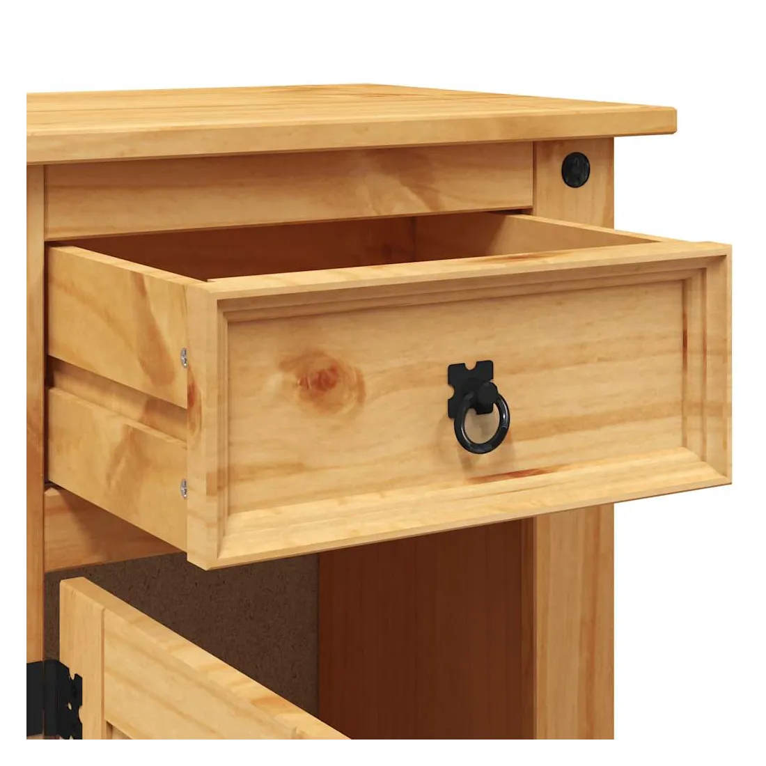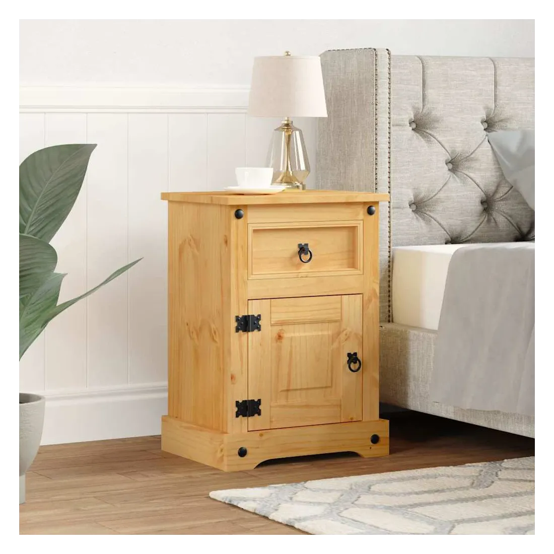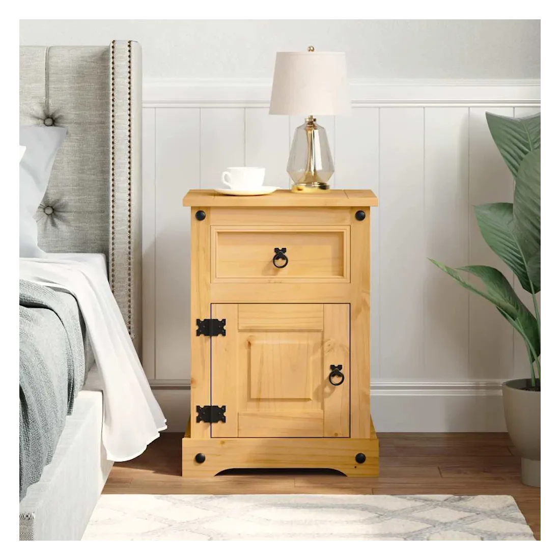 Cette table de chevet en bois de style corona est fabriquée en pin massif ciré avec des détails rustiques en métal noir et dégage un charme mexicain qui en fera un excellent supplément à votre chambre à coucher ou salon. Matériau durable : fabriquée à partir de bois de pin massif, la table de chevet est solide et robuste.Grand espace de rangement : elle dispose d’un tiroir pour les petits objets que vous aimez garder à portée de main et d’un placard avec porte en dessous qui est idéal pour ranger des livres et des magazines.Dessus d’armoire robuste : le dessus de l'armoire est assez robuste et assez grand pour contenir une lampe de chevet, un réveil ou tout ce dont vous pourriez avoir besoin à côté de votre lit.Applications multiples : elle peut également être utilisée comme table de chevet, armoire latérale, table d’appoint, etc.