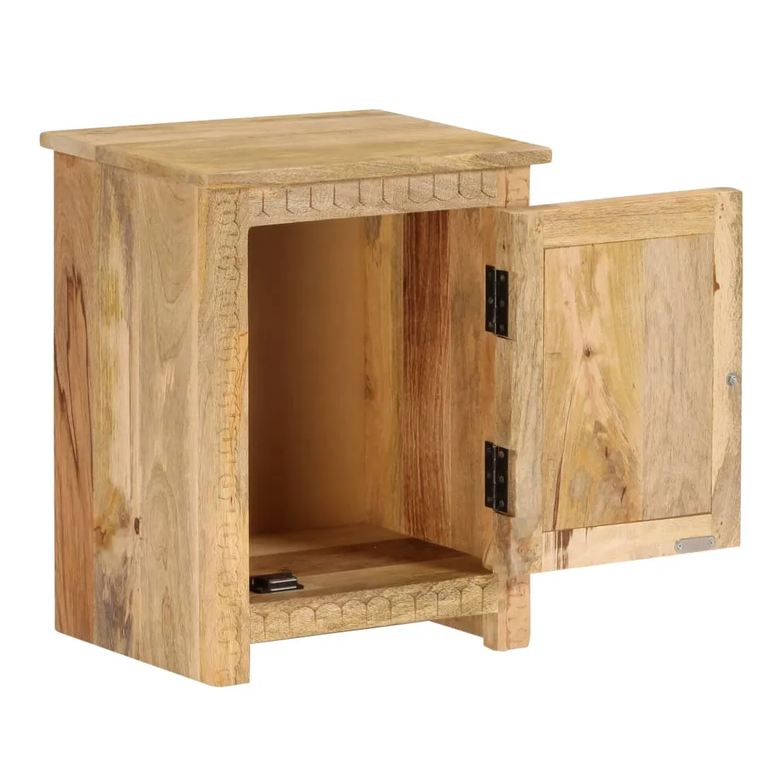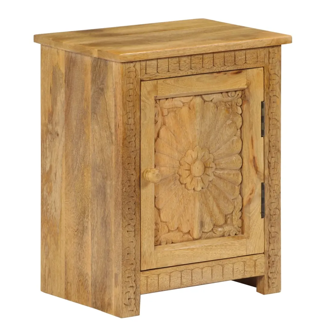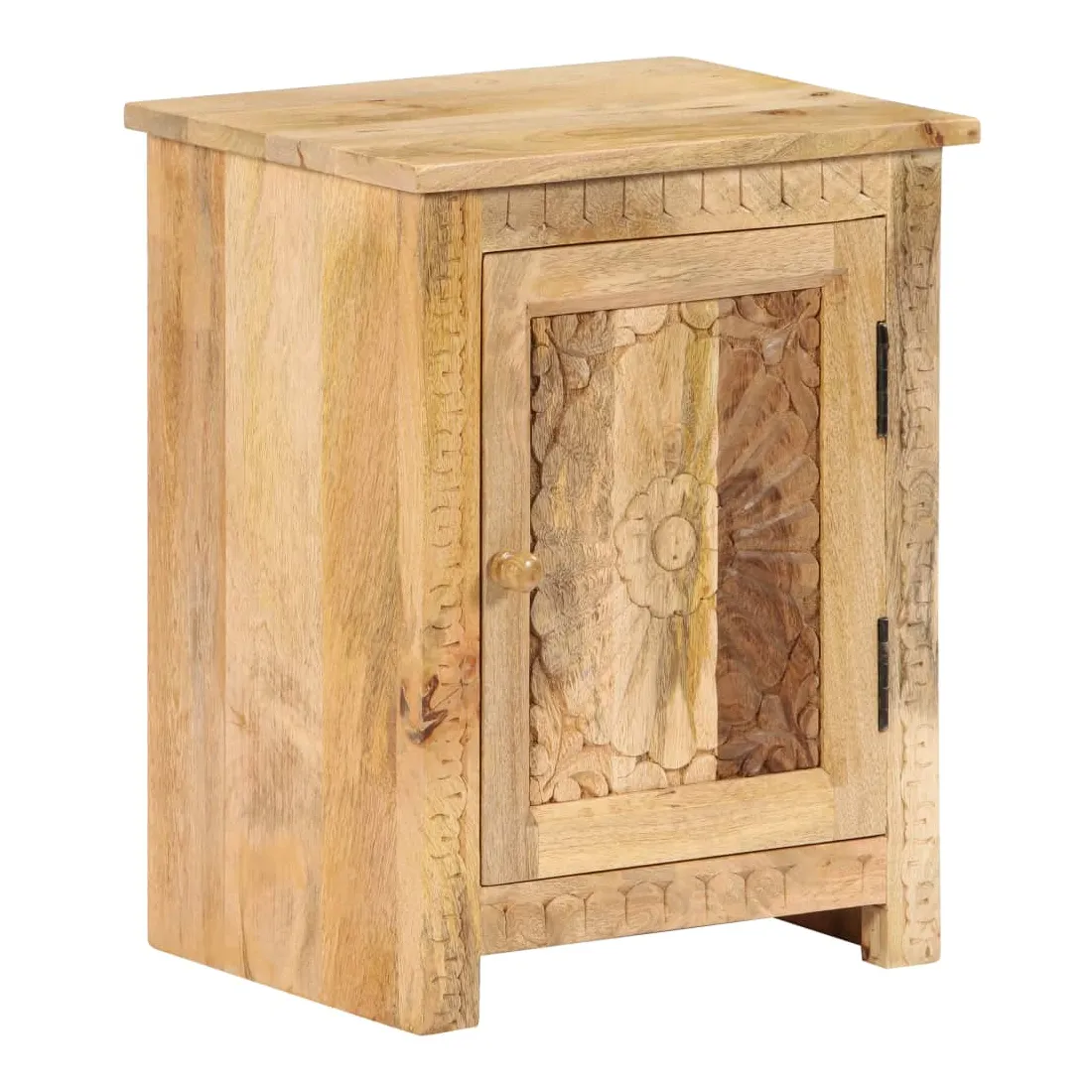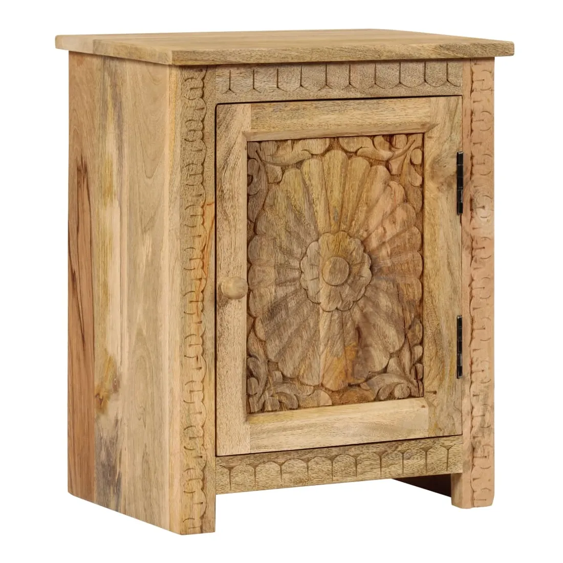 La table de chevet ajoutera une touche intemporelle à votre décoration intérieure. La table d'appoint est fabriquée en bois de manguier massif et est très stable et durable. Le couvercle robuste est idéal pour ranger vos verres, livres, tasses à thé, etc. La table de chevet offre un espace de rangement pour ranger vos différents objets de façon ordonnée. Les détails sculptés confèrent à la table de chevet une touche de charme élégante. Cet élément est déjà assemblé ; aucun assemblage n'est requis. Remarque importante : les couleurs et les grains de bois peuvent varier d'une pièce à l'autre, ce qui rend chaque pièce unique et légèrement différente l'une de l'autre. La livraison est aléatoire, ce qui garantit l'exclusivité et l'individualité de votre produit.