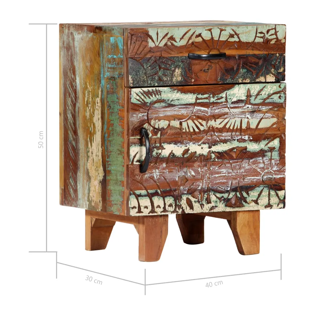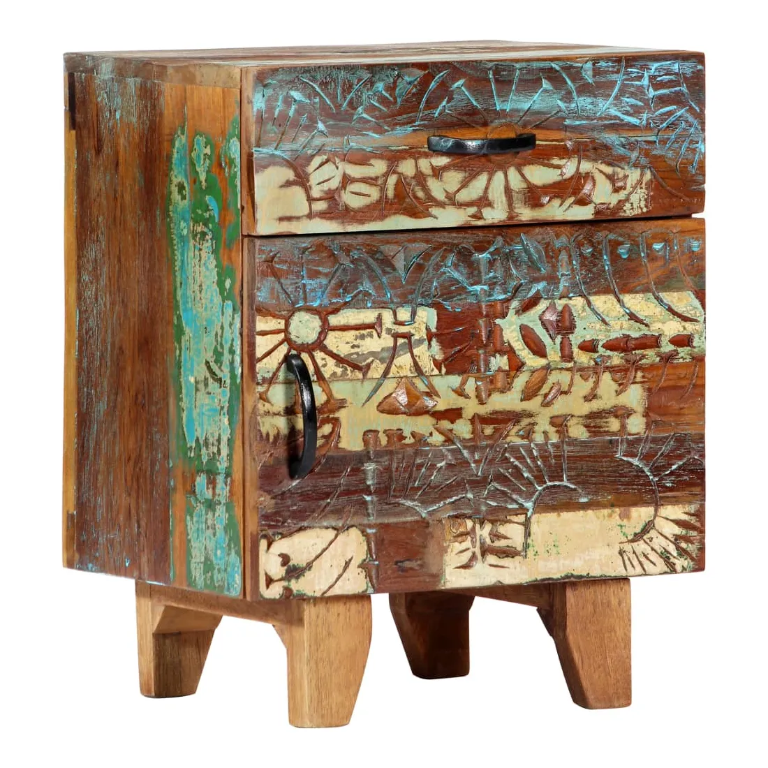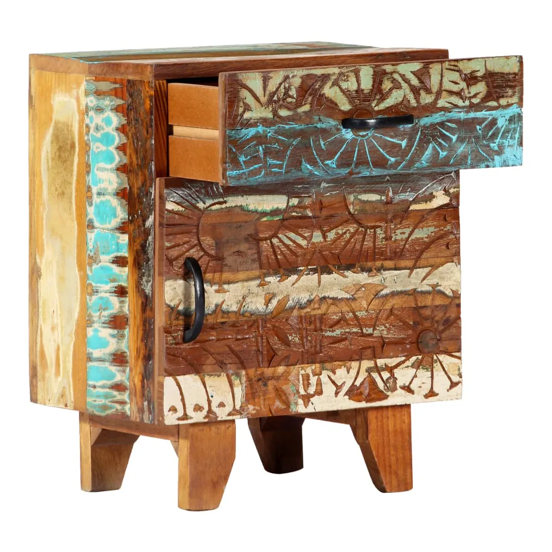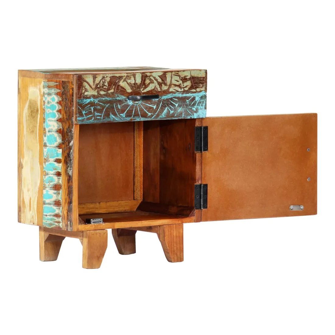Apportez le luxe d'un design inspiré du milieu du siècle dans votre intérieur avec notre table de chevet élégante en bois massif ! Cette table de chevet colorée avec un motif antique sculpté à la main est faite de bois récupération massif provenant des solives, des planchers et des poutres de soutien de vieux bâtiments démolis et peut être composée de différents types de bois comme le pin, le teck, le hêtre, le chêne, le cèdre, le bois de manguier, l'acacia, etc. Cela signifie que le bois de récupération conserve les caractéristiques de ces différents types de bois. Le bois de récupération est déjà vieilli, patiné et séché, donc il ne rétrécit pas et ne se plie pas. Chaque étape du processus est réalisée avec le plus grand soin, qu'il s'agisse de la peinture, du polissage ou du laquage. L'artisanat exquis et les grains de bois gracieux rendent chaque meuble distinctif et légèrement différent l'un de l'autre. De plus, cette cette armoire à tiroirs vintage se distingue par 1 tiroir et 1 porte, offrant une solution idéale pour garder vos petits objets rangés et à portée de main. Le meuble de rangement est facile à assembler. Note importante : Les couleurs et les grains de bois varient d'une pièce à l'autre, ce qui rend chacune de nos tables de chevet unique. La livraison est aléatoire, ce qui garantit l'exclusivité et l'individualité de votre produit.