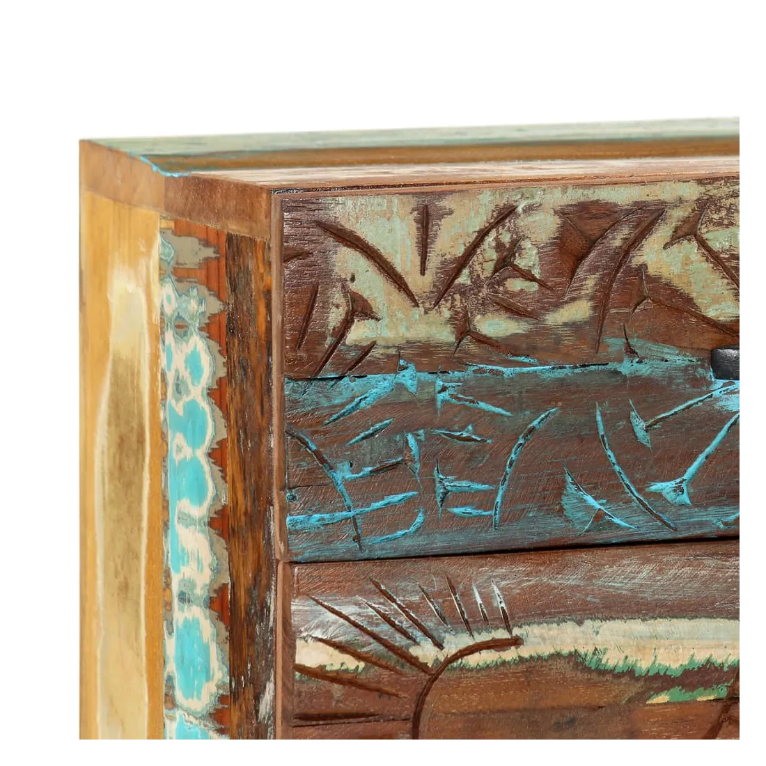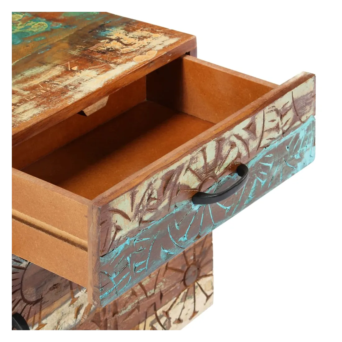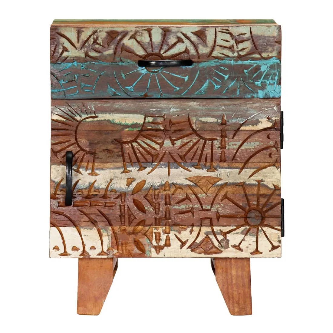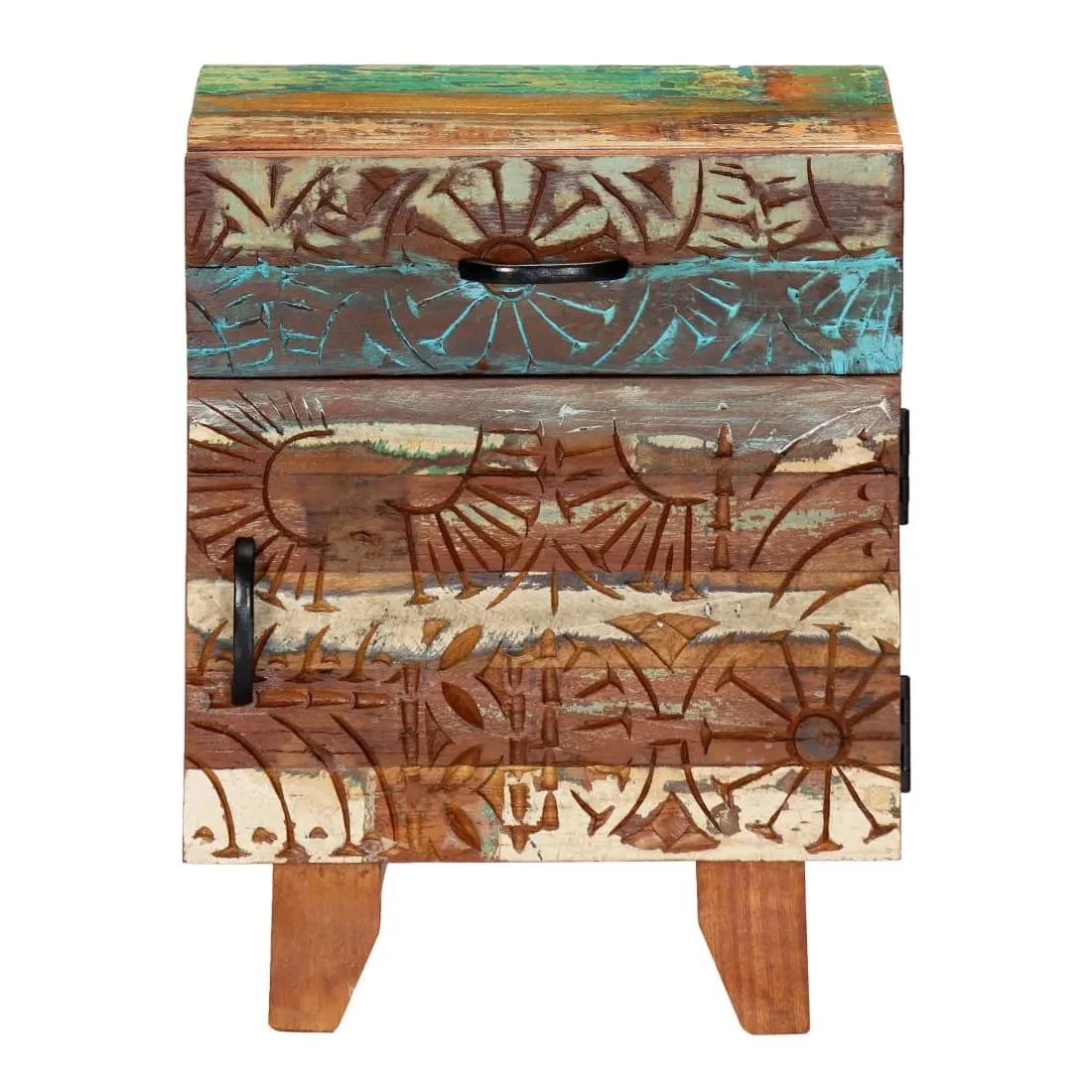 Apportez le luxe d'un design inspiré du milieu du siècle dans votre intérieur avec notre table de chevet élégante en bois massif ! Cette table de chevet colorée avec un motif antique sculpté à la main est faite de bois récupération massif provenant des solives, des planchers et des poutres de soutien de vieux bâtiments démolis et peut être composée de différents types de bois comme le pin, le teck, le hêtre, le chêne, le cèdre, le bois de manguier, l'acacia, etc. Cela signifie que le bois de récupération conserve les caractéristiques de ces différents types de bois. Le bois de récupération est déjà vieilli, patiné et séché, donc il ne rétrécit pas et ne se plie pas. Chaque étape du processus est réalisée avec le plus grand soin, qu'il s'agisse de la peinture, du polissage ou du laquage. L'artisanat exquis et les grains de bois gracieux rendent chaque meuble distinctif et légèrement différent l'un de l'autre. De plus, cette cette armoire à tiroirs vintage se distingue par 1 tiroir et 1 porte, offrant une solution idéale pour garder vos petits objets rangés et à portée de main. Le meuble de rangement est facile à assembler. Note importante : Les couleurs et les grains de bois varient d'une pièce à l'autre, ce qui rend chacune de nos tables de chevet unique. La livraison est aléatoire, ce qui garantit l'exclusivité et l'individualité de votre produit.