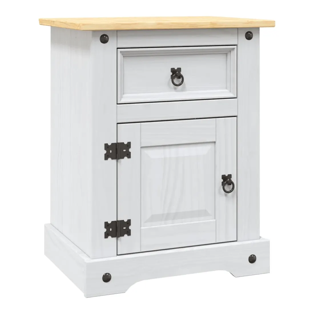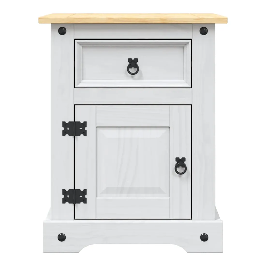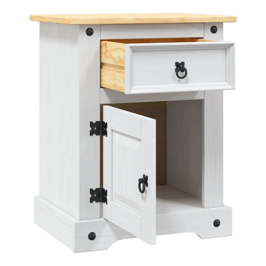 Cette table de chevet en bois de haute qualité est un meuble dans le style mexicain « Corona ». Le pin ciré avec des détails en métal noir dégage un charme mexicain rustique qui fera de la table de chevet un excellent supplément à votre chambre à coucher, chambre d’amis ou dortoir. Elle peut également être utilisée comme armoire latérale, table d'appoint, etc. Fabriquée à partir de bois de pin massif, la table de chevet est solide et robuste. Elle dispose d’un tiroir pour les petits objets que vous aimez garder à portée de main et d’un placard avec porte en dessous qui est idéal pour ranger des livres et des magazines. Le dessus de l'armoire est assez robuste et assez grand pour contenir une lampe de chevet, un réveil ou tout ce dont vous pourriez avoir besoin à côté de votre lit. L'assemblage est vraiment facile.