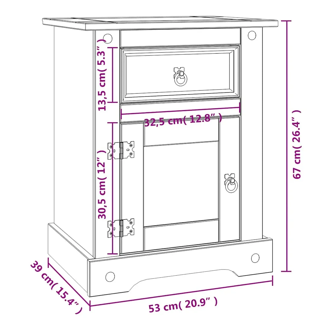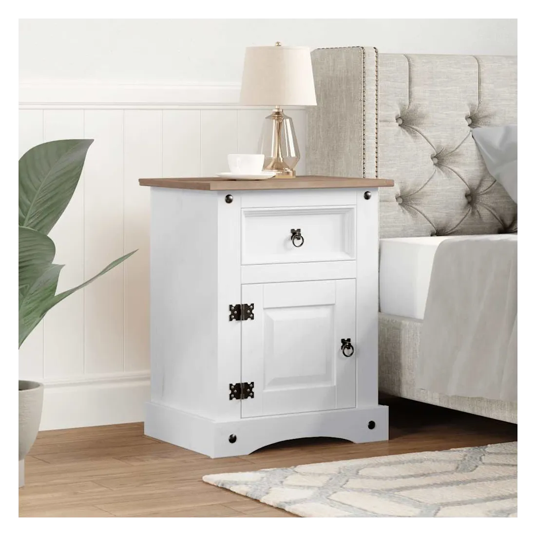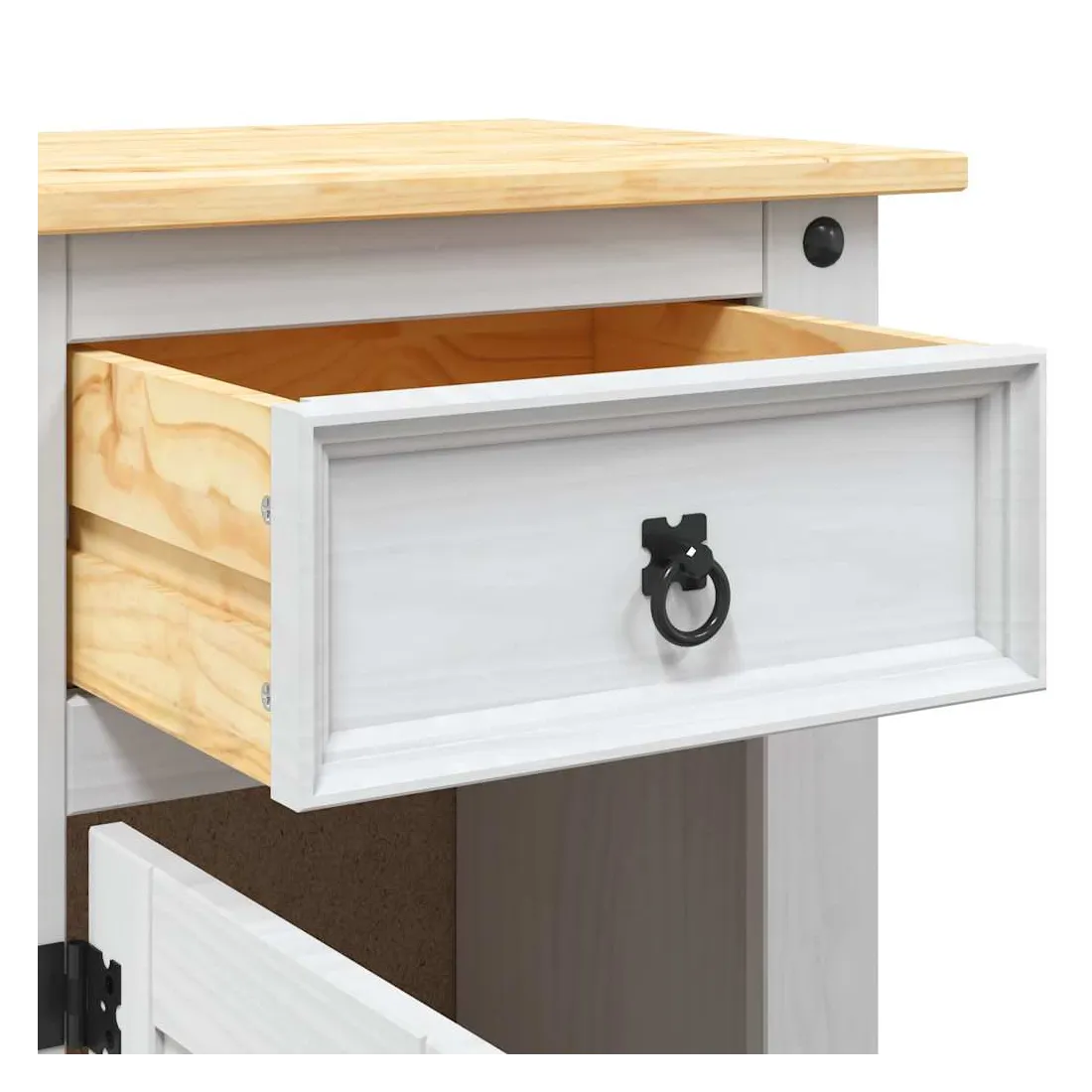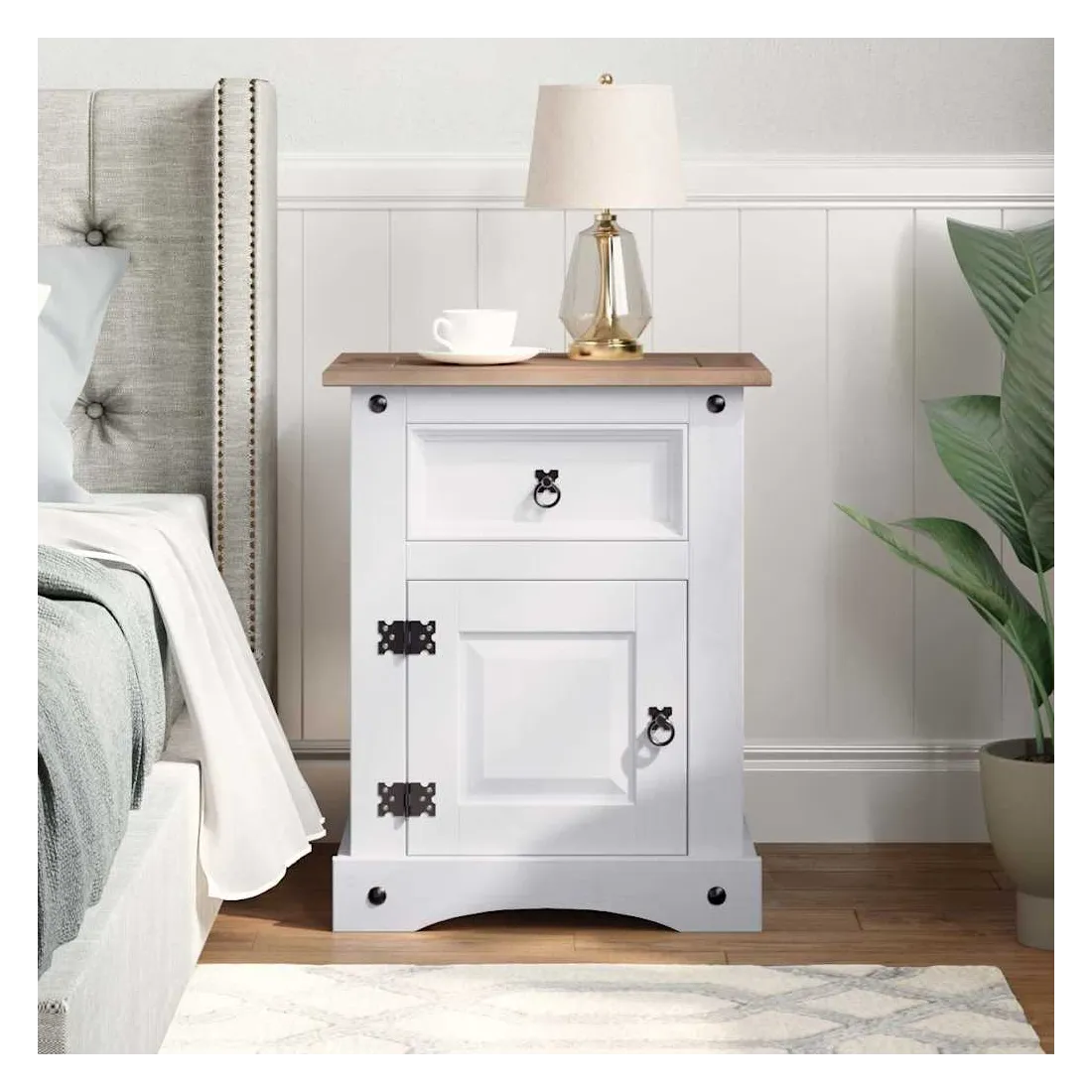Cette table de chevet en bois de haute qualité est un meuble dans le style mexicain « Corona ». Le pin ciré avec des détails en métal noir dégage un charme mexicain rustique qui fera de la table de chevet un excellent supplément à votre chambre à coucher, chambre d’amis ou dortoir. Elle peut également être utilisée comme armoire latérale, table d'appoint, etc. Fabriquée à partir de bois de pin massif, la table de chevet est solide et robuste. Elle dispose d’un tiroir pour les petits objets que vous aimez garder à portée de main et d’un placard avec porte en dessous qui est idéal pour ranger des livres et des magazines. Le dessus de l'armoire est assez robuste et assez grand pour contenir une lampe de chevet, un réveil ou tout ce dont vous pourriez avoir besoin à côté de votre lit. L'assemblage est vraiment facile.